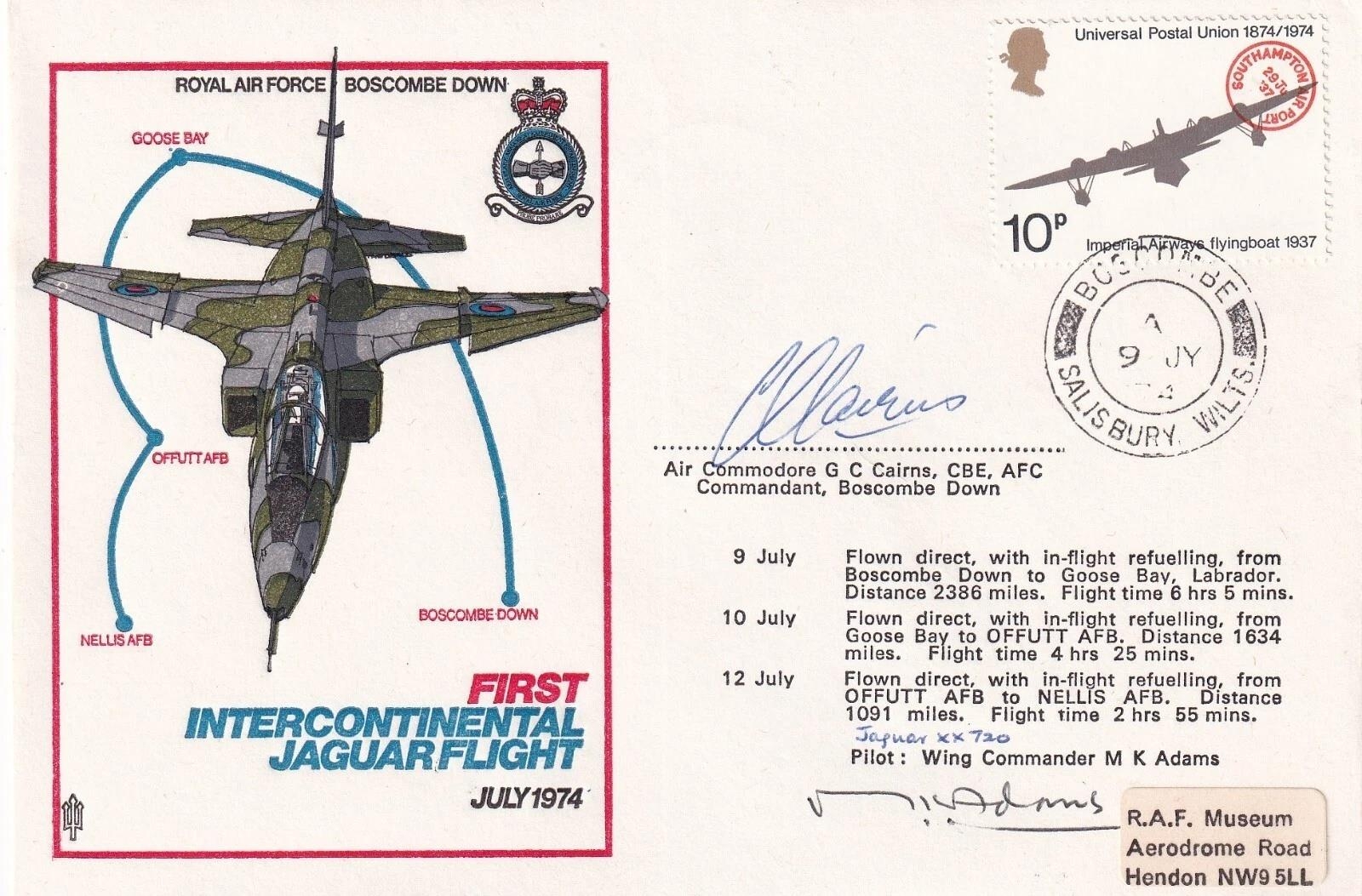 Rare C30 1st Intercontinental Jaguar flight Cover Signed Air Commodore G C Cairns. 9 Jy 74 Boscombe Postmark 1st Intercontinental Jaguar flight. Personally Signed by the Pilot Wg Cdr M K Adams and Air Commodore G C Cairns CBE AFC Commandant Boscombe down. Black flown cachet. 9 July Flown directly with inflight refuelling from Boscombe Down to Goose Bay, Labrador, Distance 2386 miles. Flight time 6 hrs 5 mins. 10 July Flown directly with in - flight refuelling from Goose Bay to OFFUTT AFB, Distance 1634 miles flight time 4 hrs 25 mins. 12 July Flown directly with in - flight refuelling, from OFFUTT AFB to Nellis AFB. Distance 1091 miles. Flight time 2 hrs 55 mins. Jaguar XX720. 2 Backstamps Goose Airport Stun A NFLD PM 9 V111 74 and Nellis Air Force Base Nev Jul 12, 1974. Rare RAF covers Certified Copy of 295 Signed John Davis Good condition. All autographs come with a Certificate of Authenticity. We combine postage on multiple winning lots and can ship worldwide. UK postage from £5.99, EU from £7.99, Rest of World from £9.99