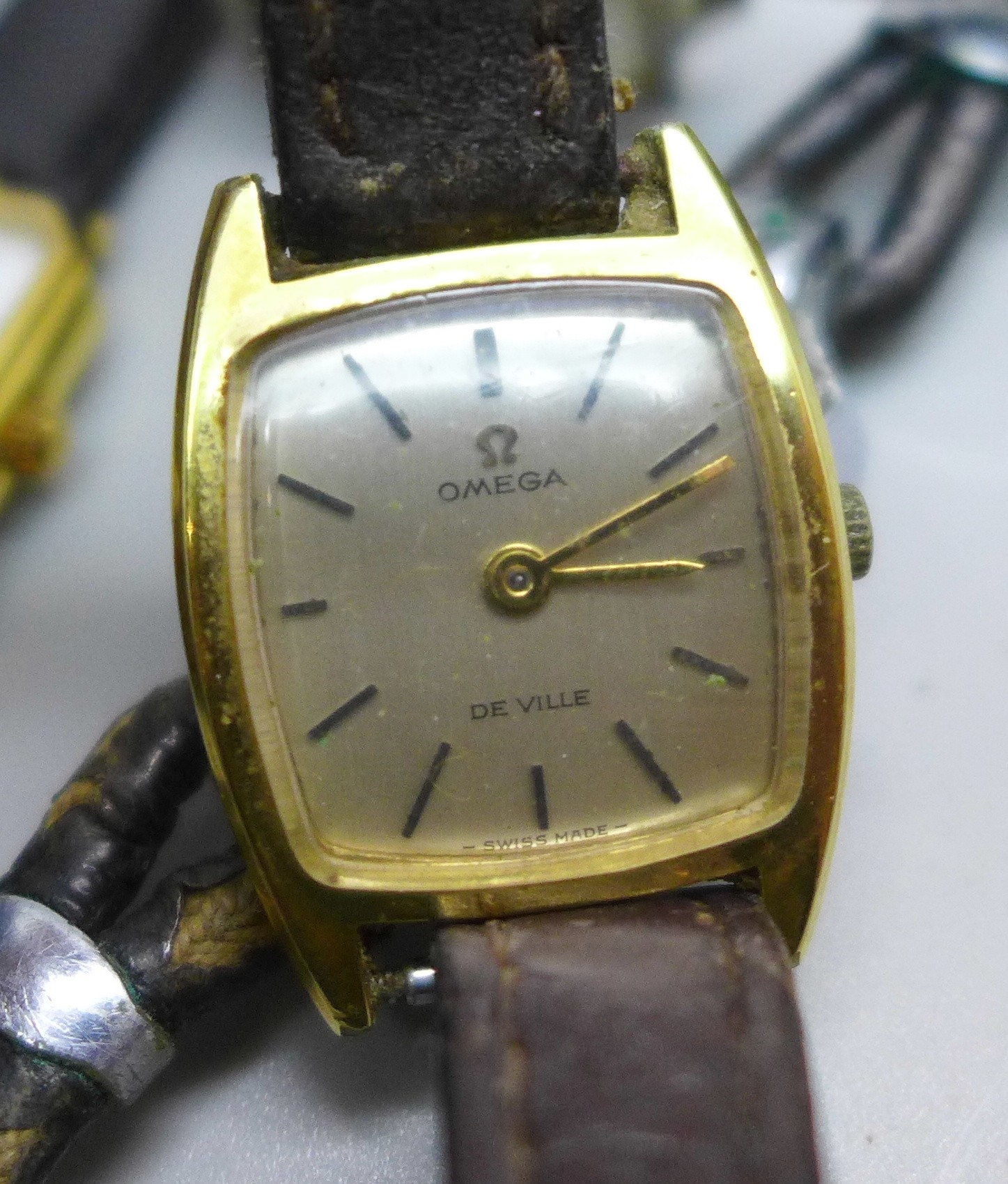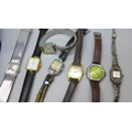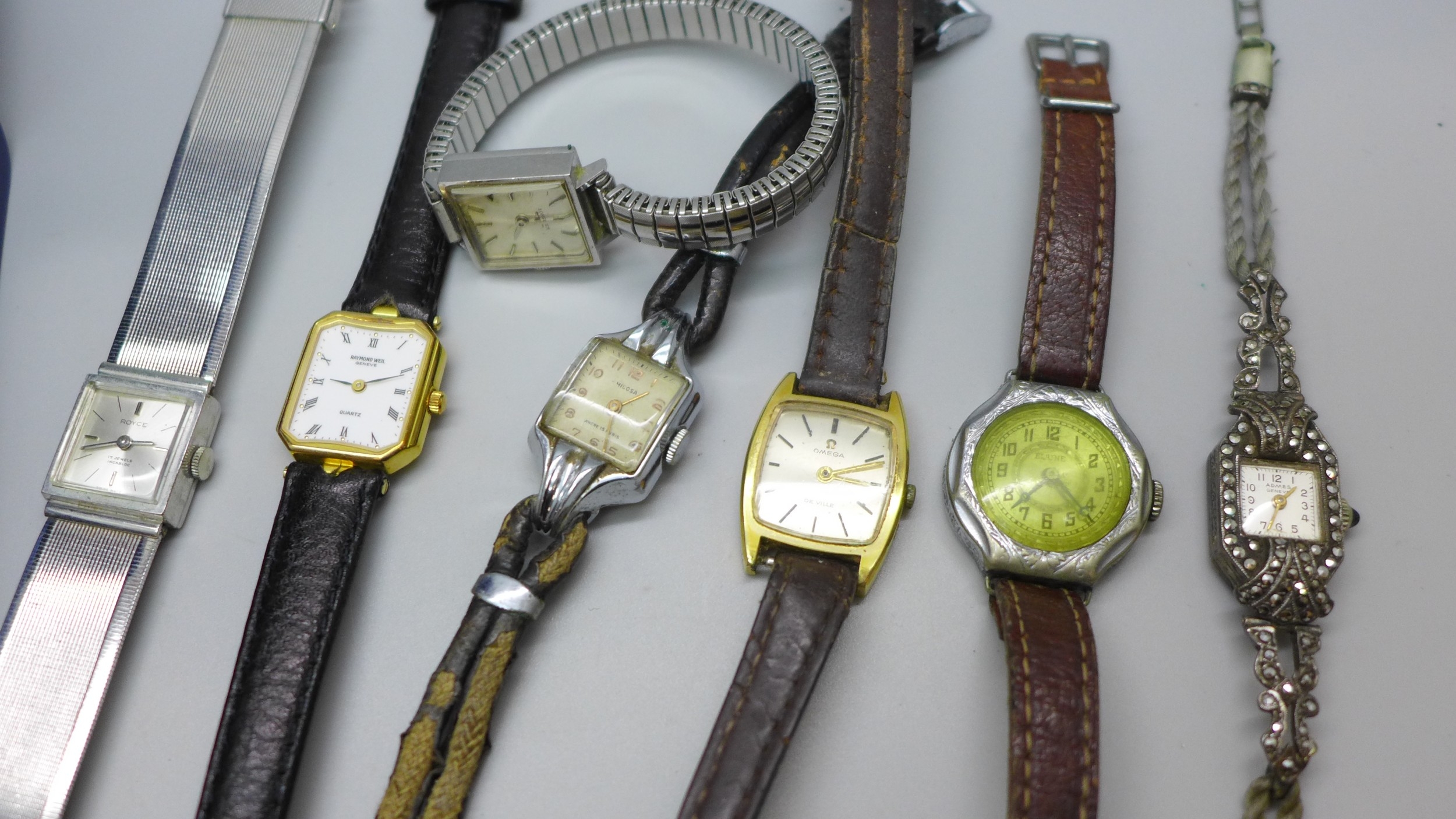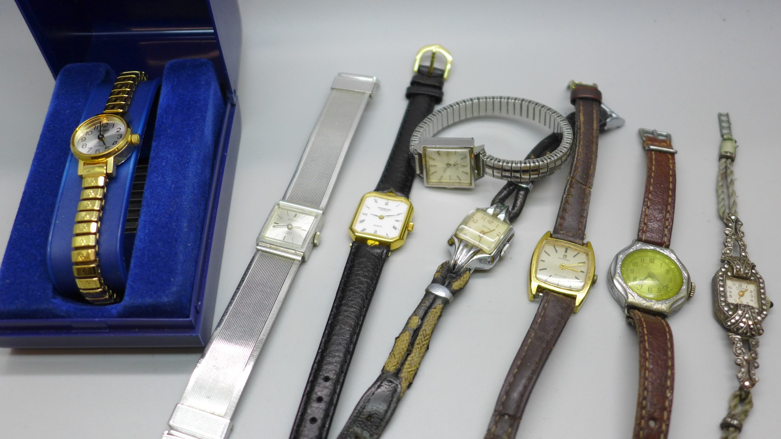 A lady's Raymond Weil gold plated wristwatch, a lady's Omega wristwatch, and other watches including a silver Art Deco example