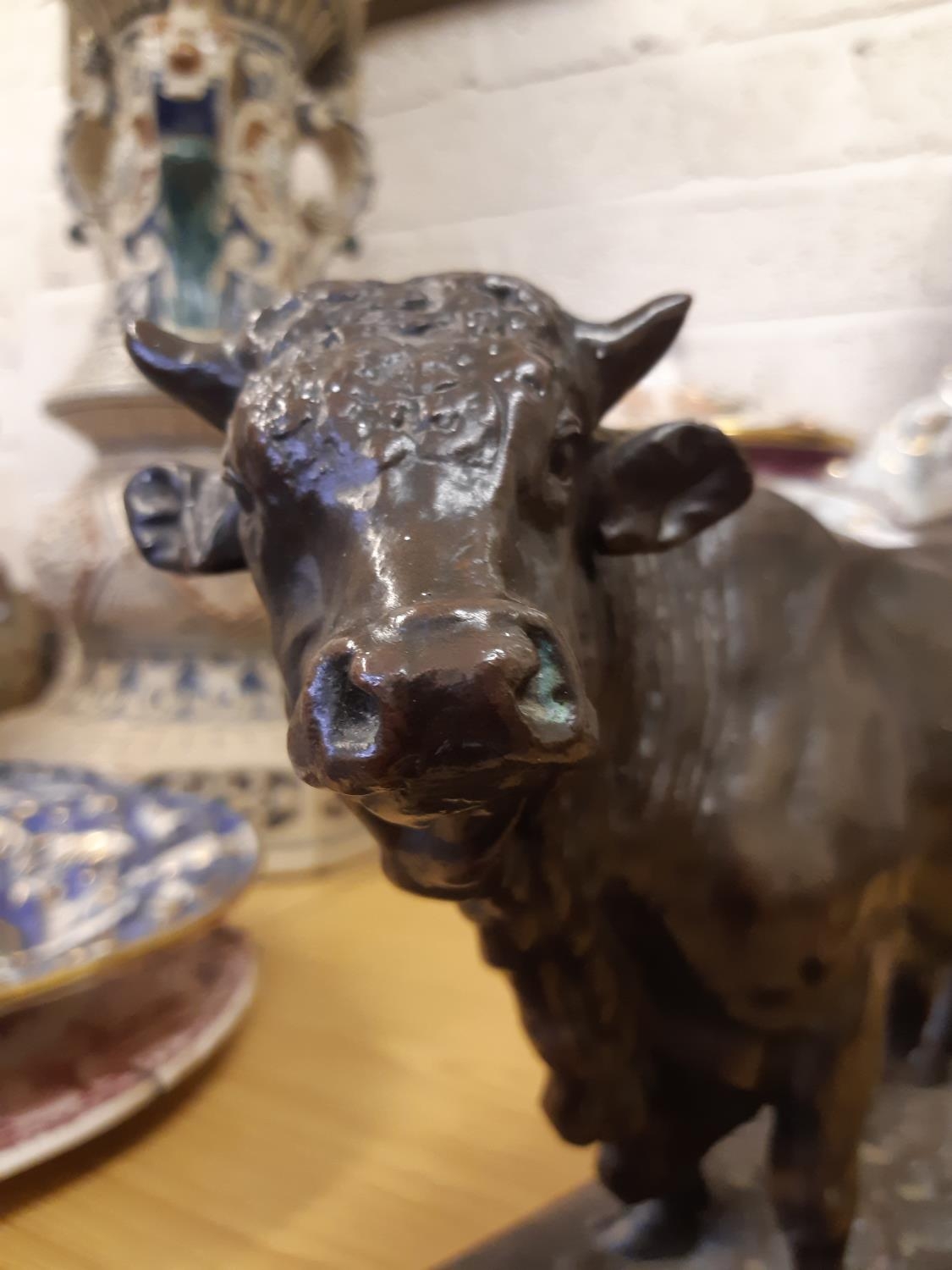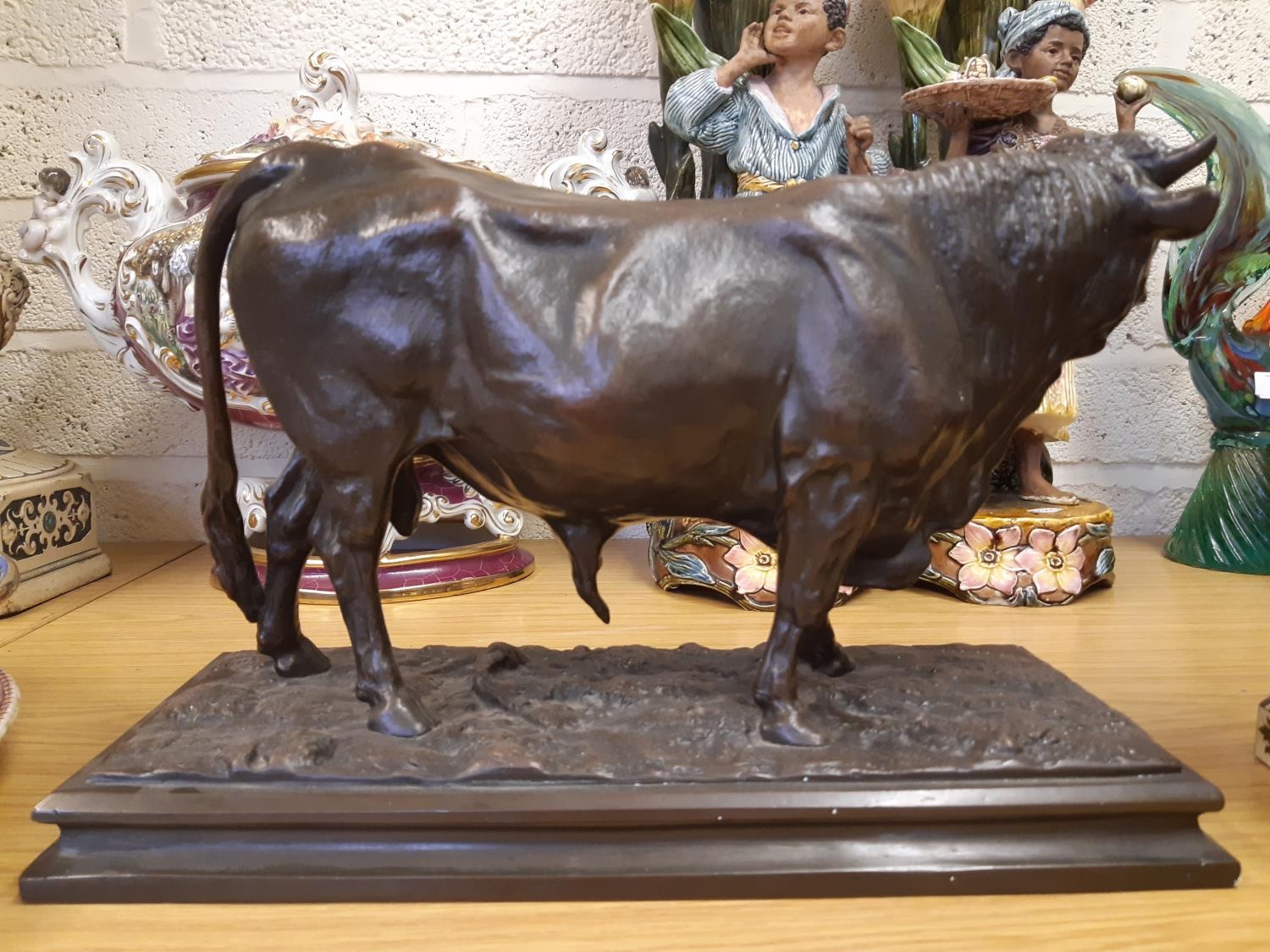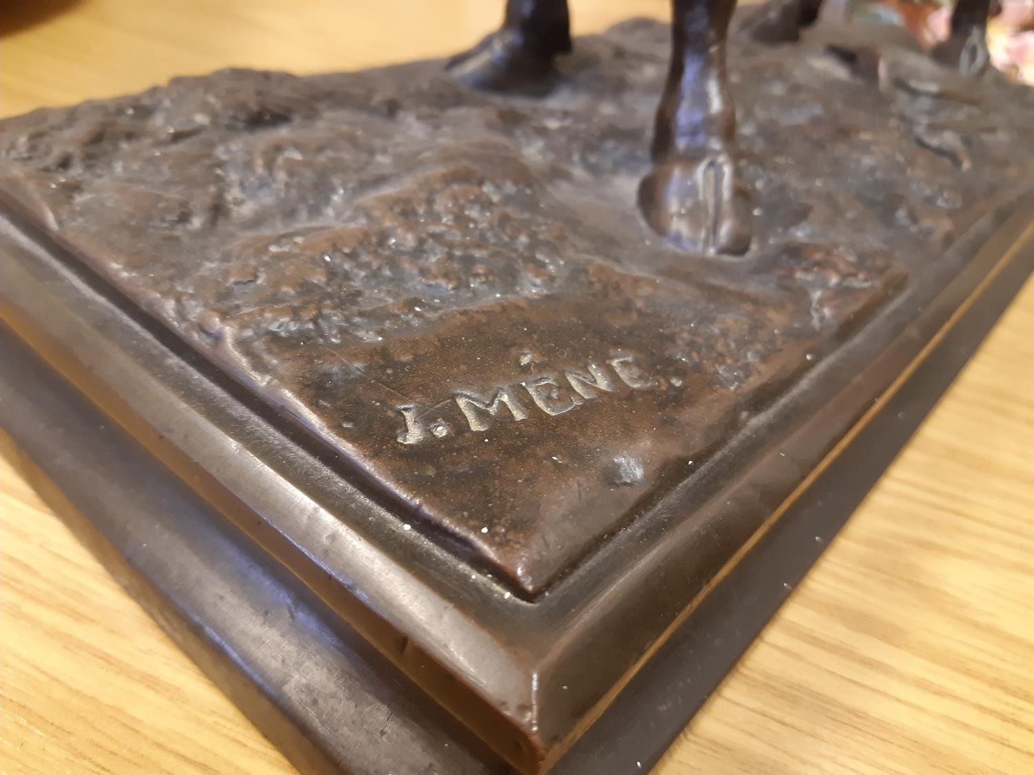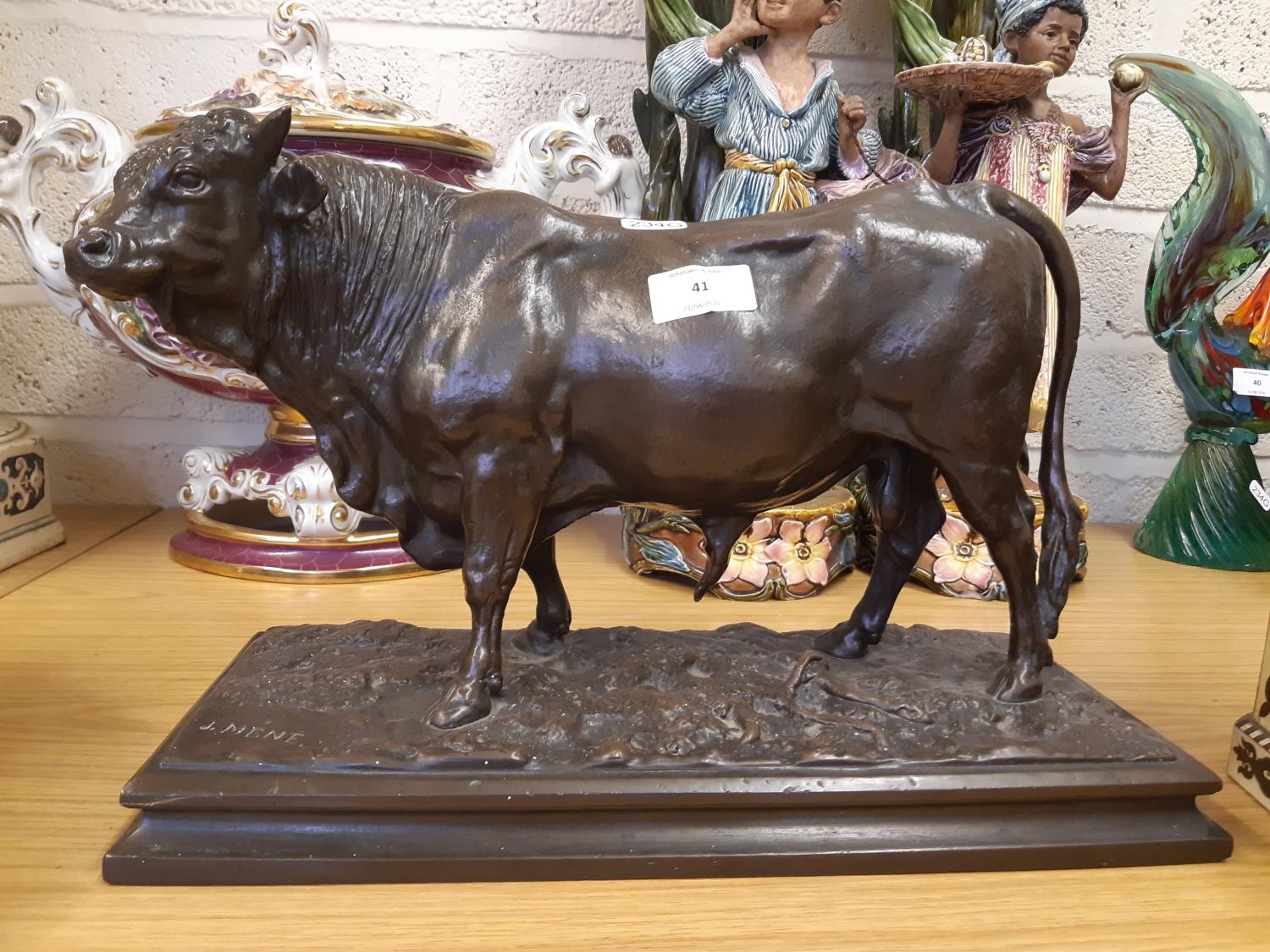 A 19th century bronze sculpture of a standing bull in field by Pierre Jules Mene (1810-1879) signed J Mene to top right corner – measuring approx. (with base) 25cm in height, 39cm in width and 17cm in depth
