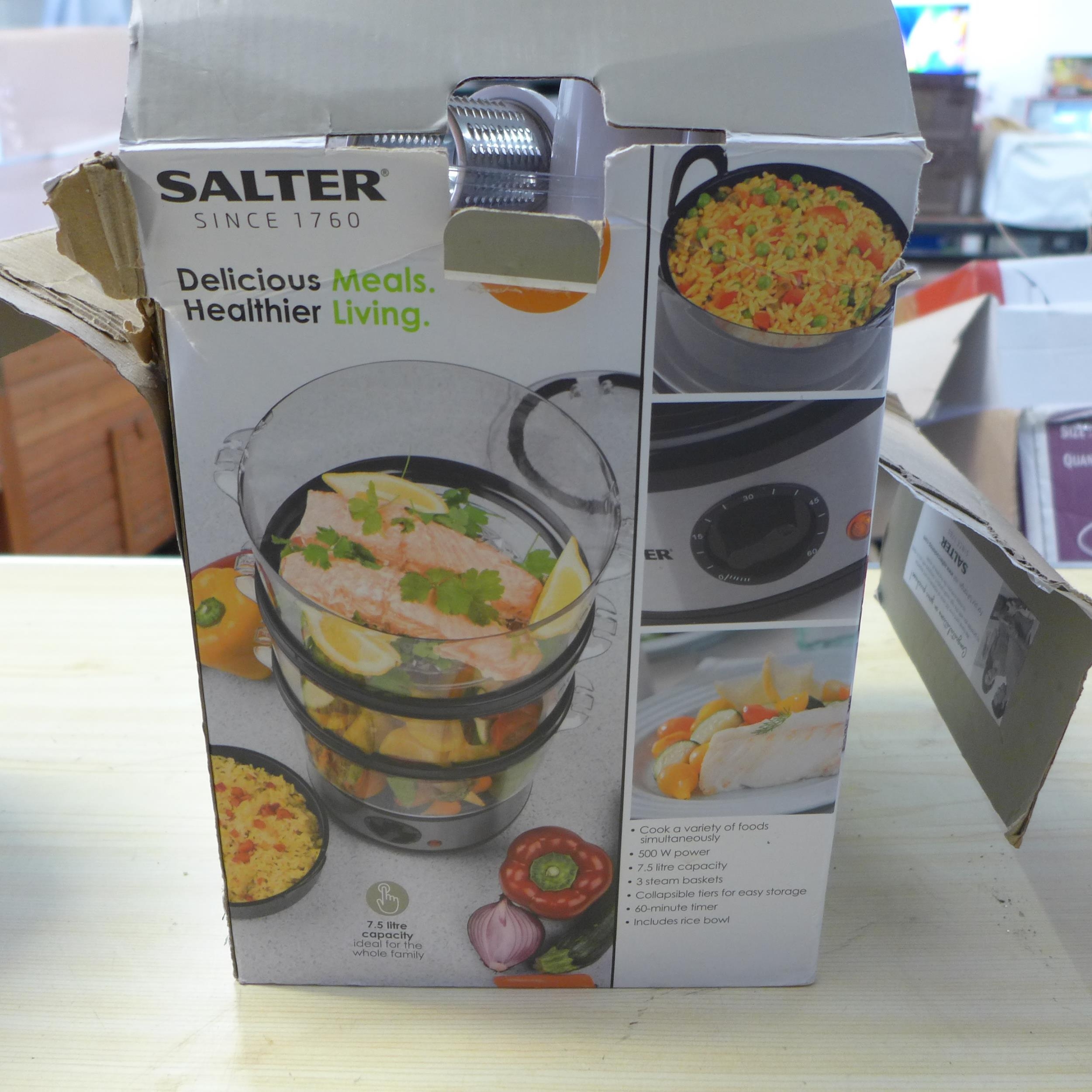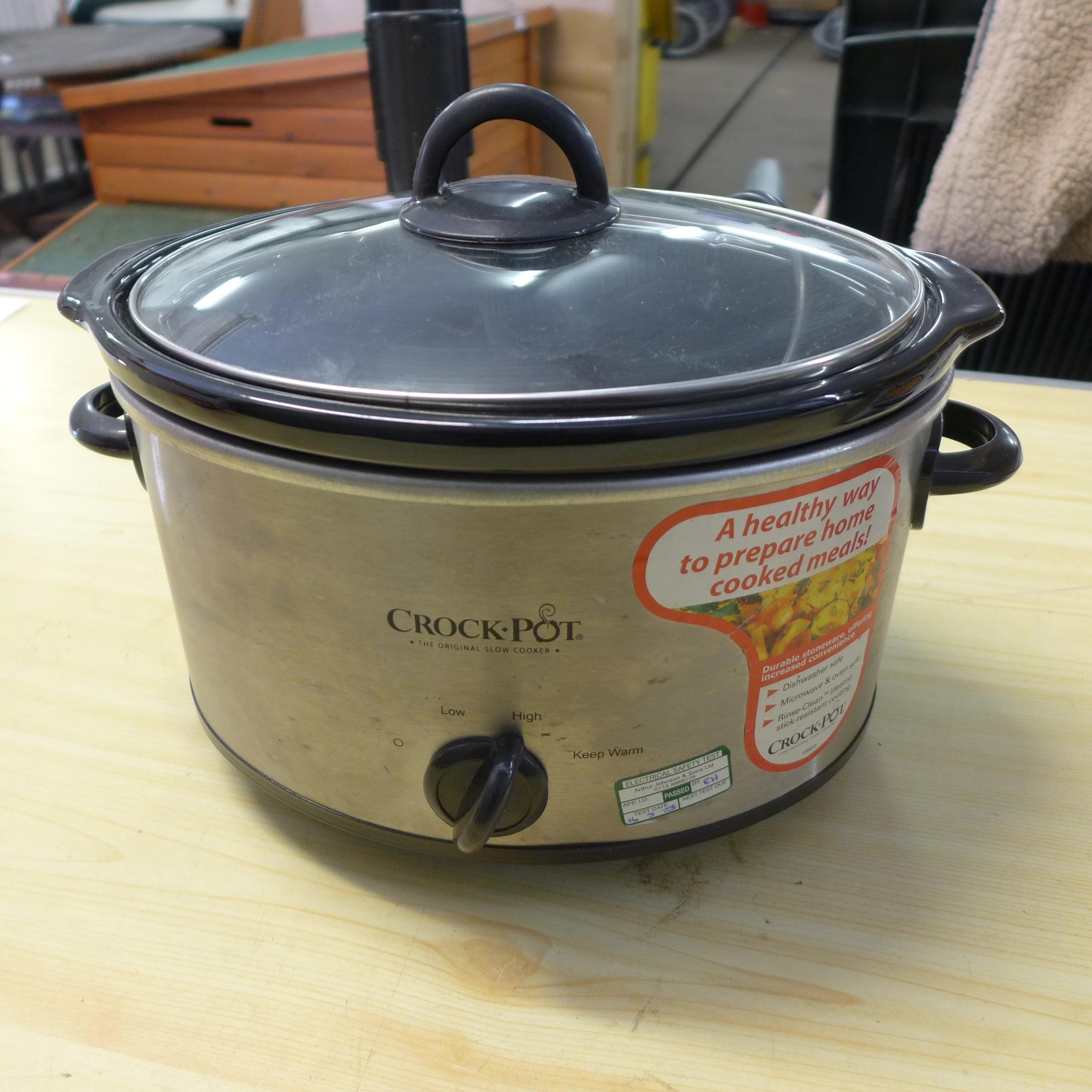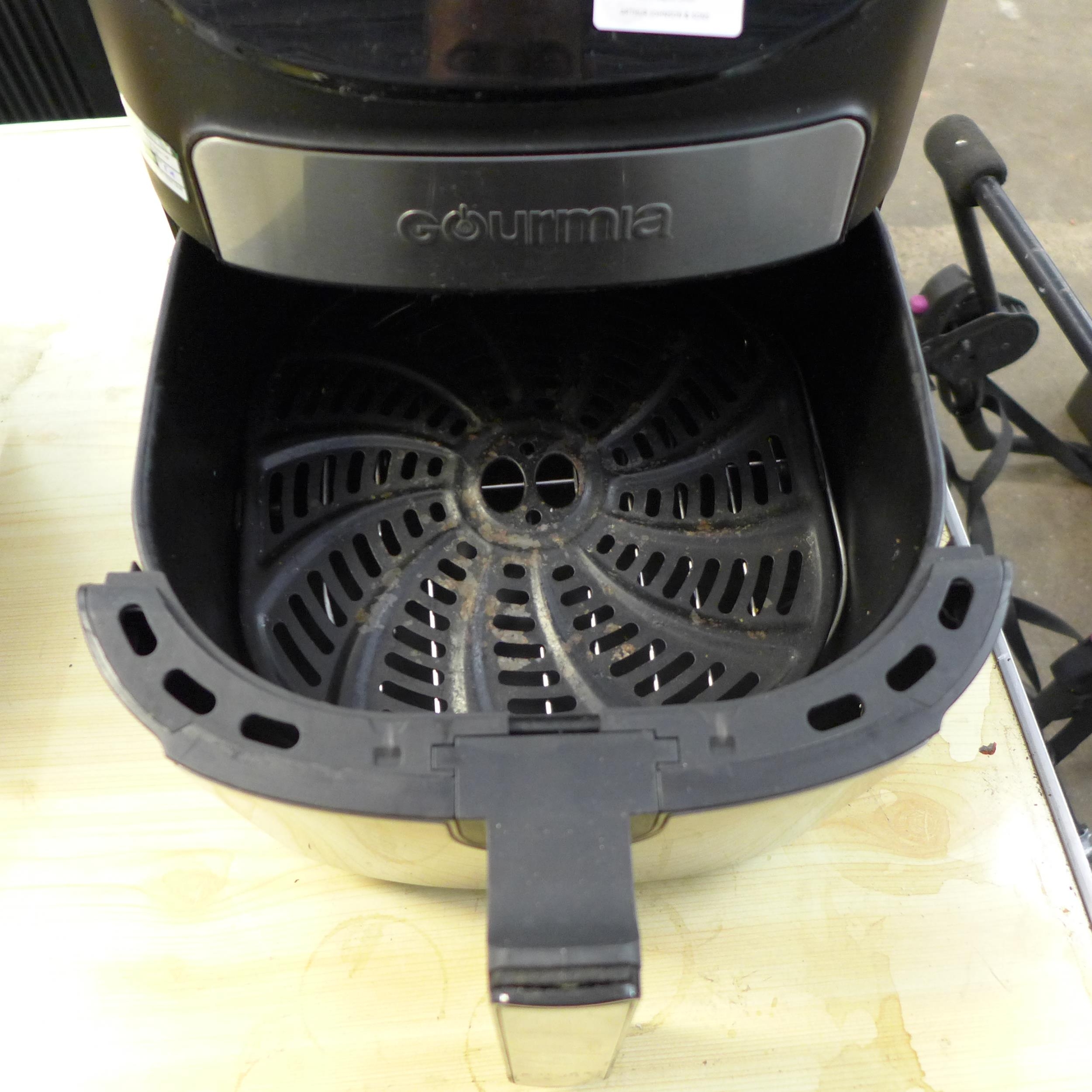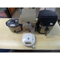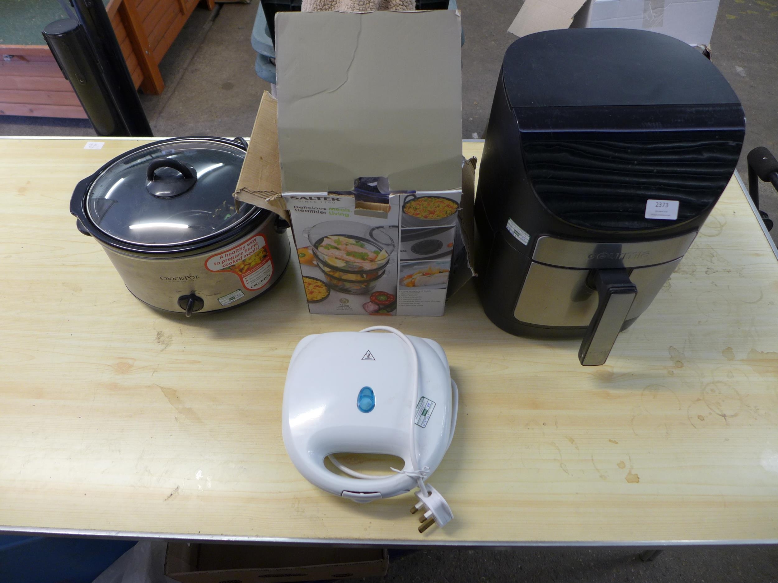 A quantity of kitchen equipment including a Crock-Pot slow cooker, Gourmia air fryer and a 3 tier salter steamer