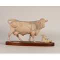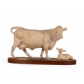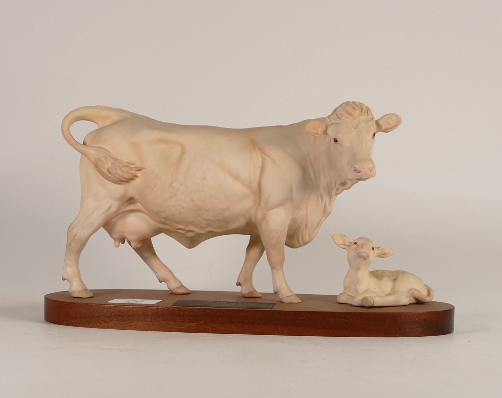 Beswick Charolais Cow and Calf on wooden plinth, H:20cm