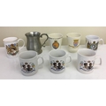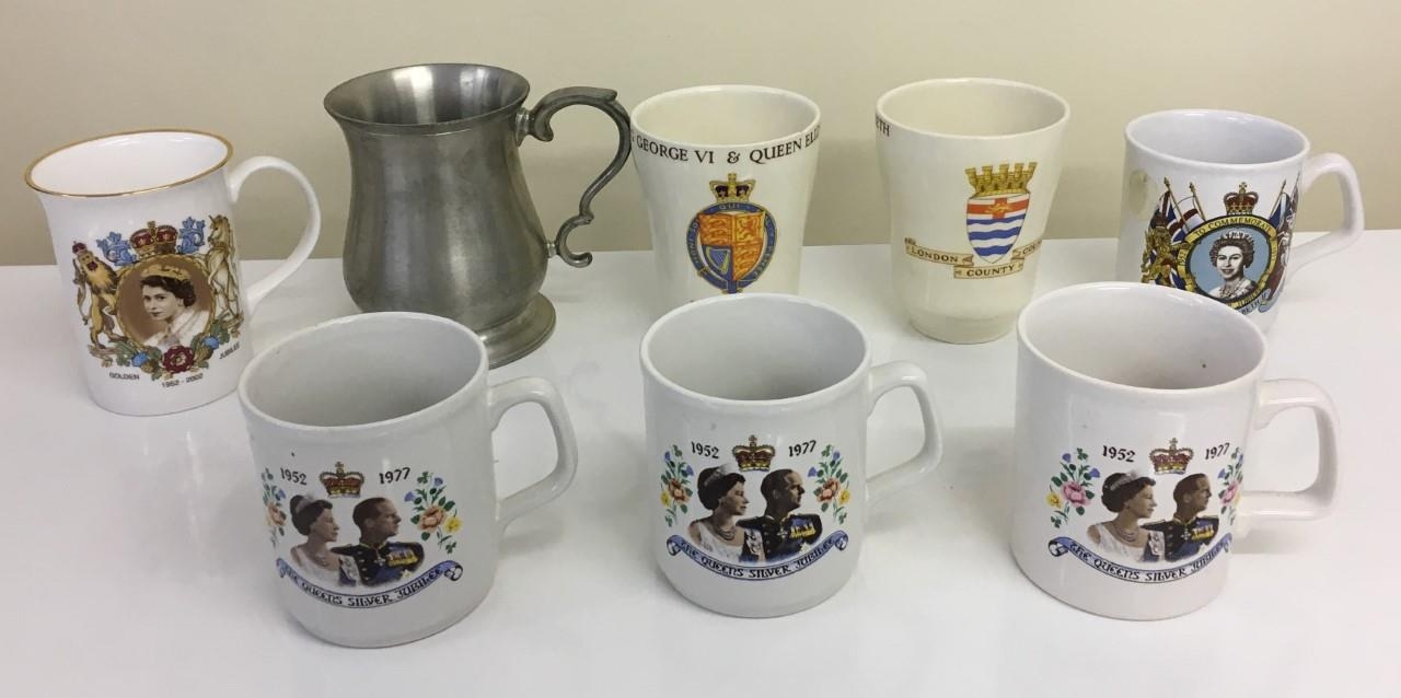 A selection of Royal memorabilia, together with a pewter tankard. Seven mugs celebrating King George Vi coronation and Queen Elizabeth Silver/Golden Jubilees.