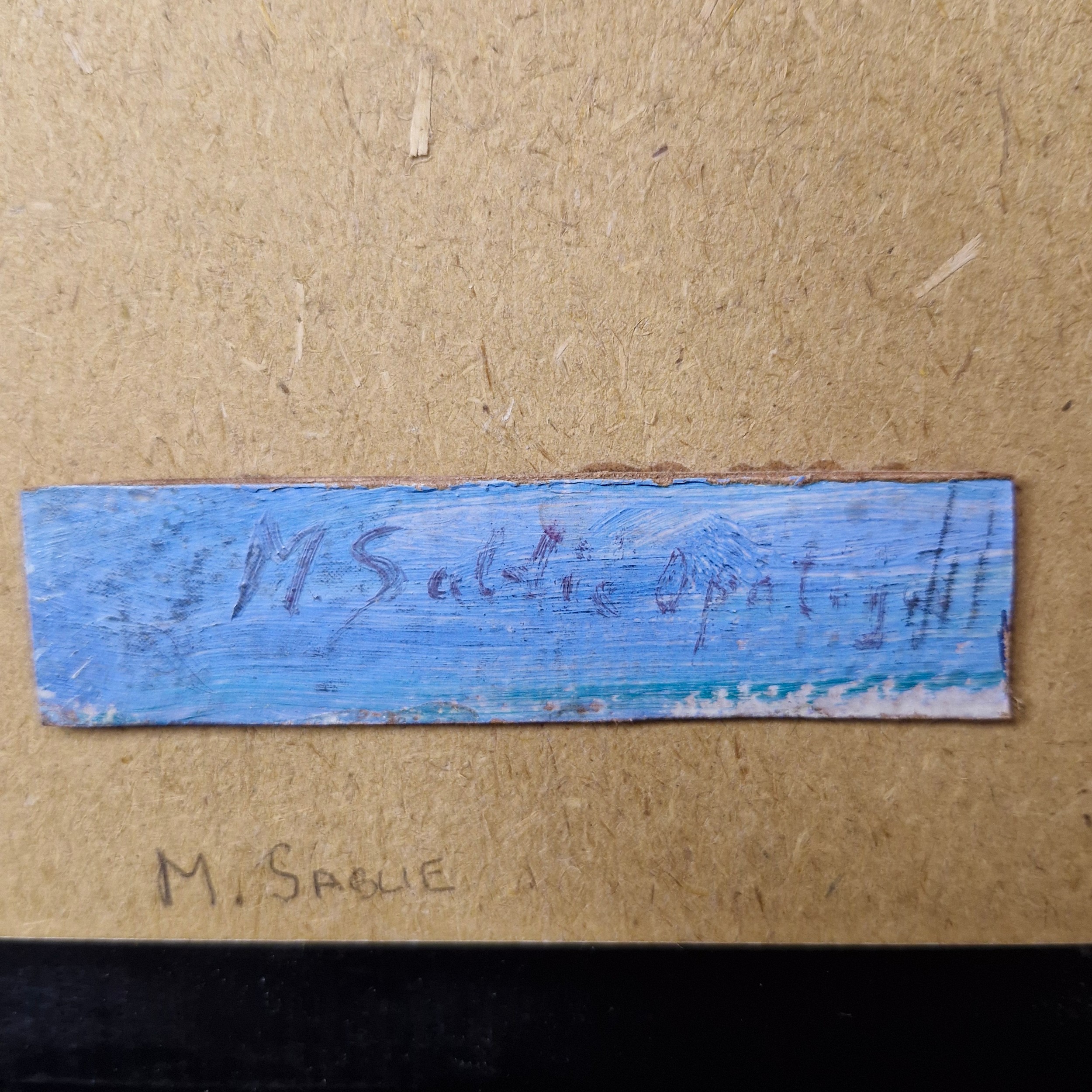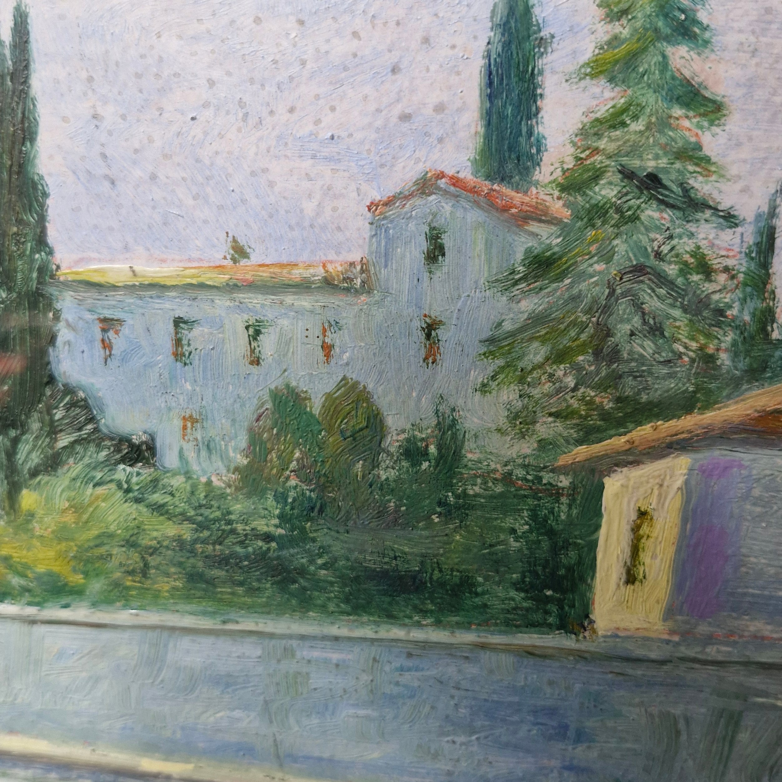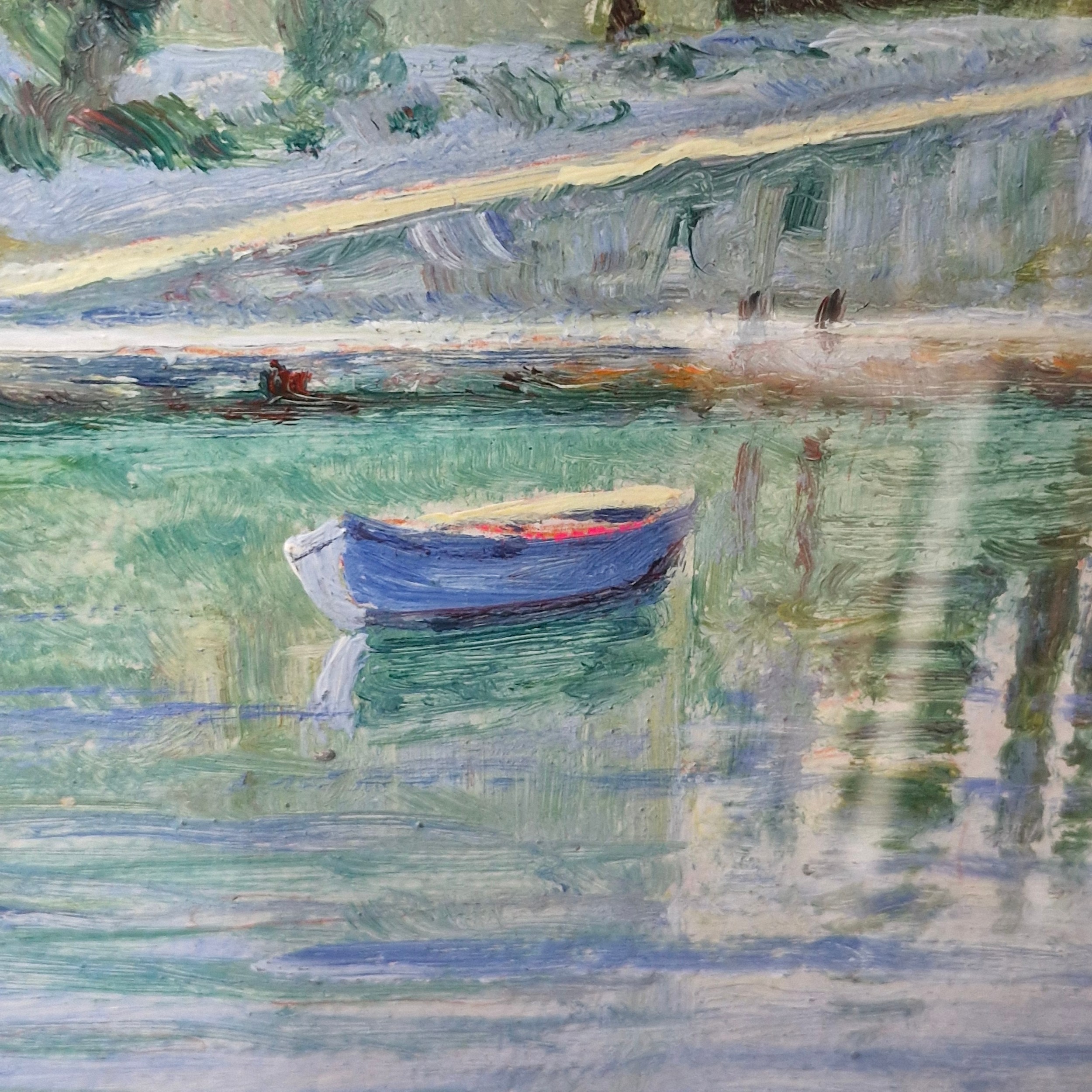 Star Lot: A charming original oil on board painting. Features the serene Lake Maggiore. Rendered in a rich cool colour palette with blues, lilacs and violets with greens and soft pastel yellows. Characterised by smooth and fluid brushstrokes creating a sense of movement and emphasis on light. Signed 'M Sablie' lower right. Housed in a painted wooden frame behind glass.