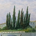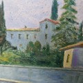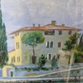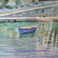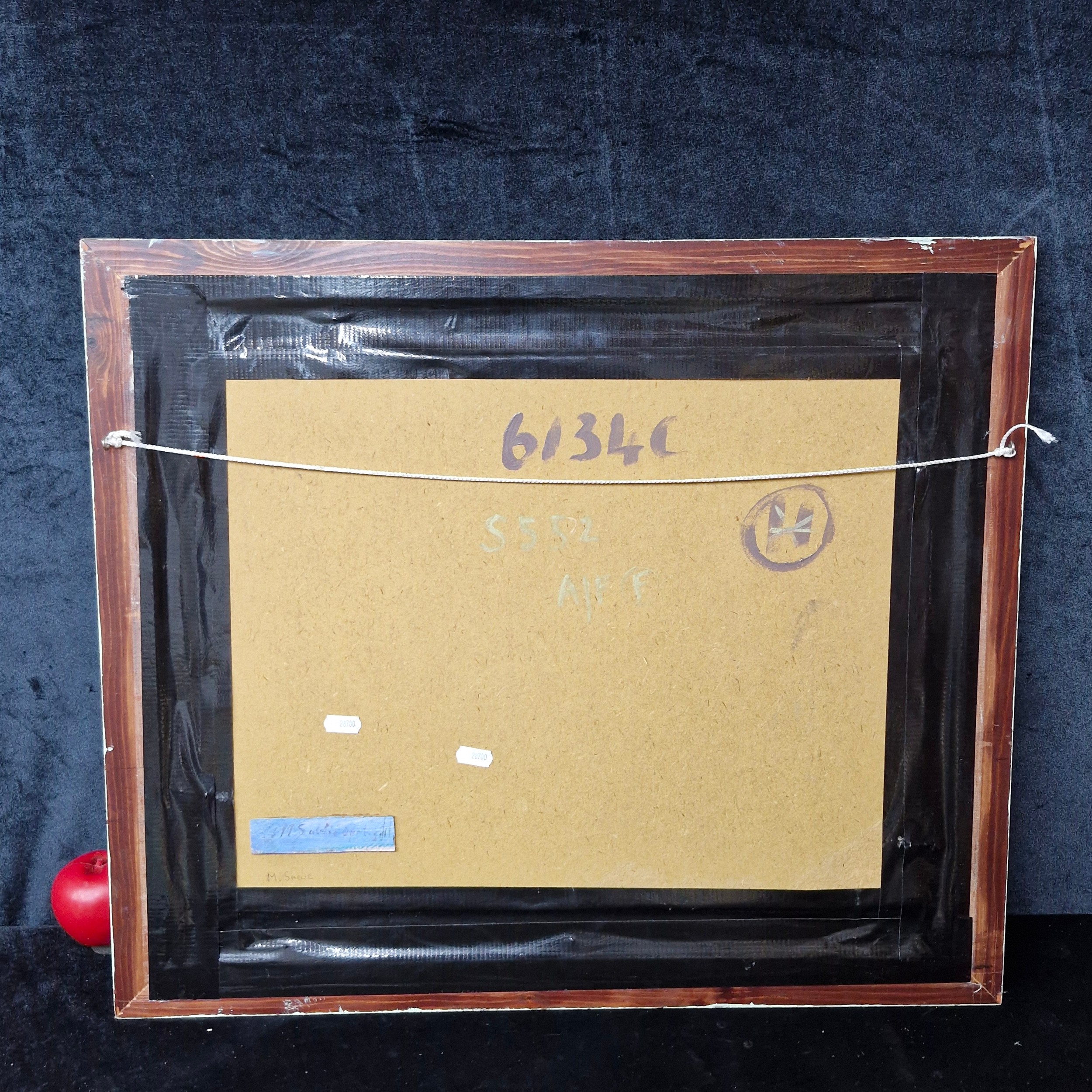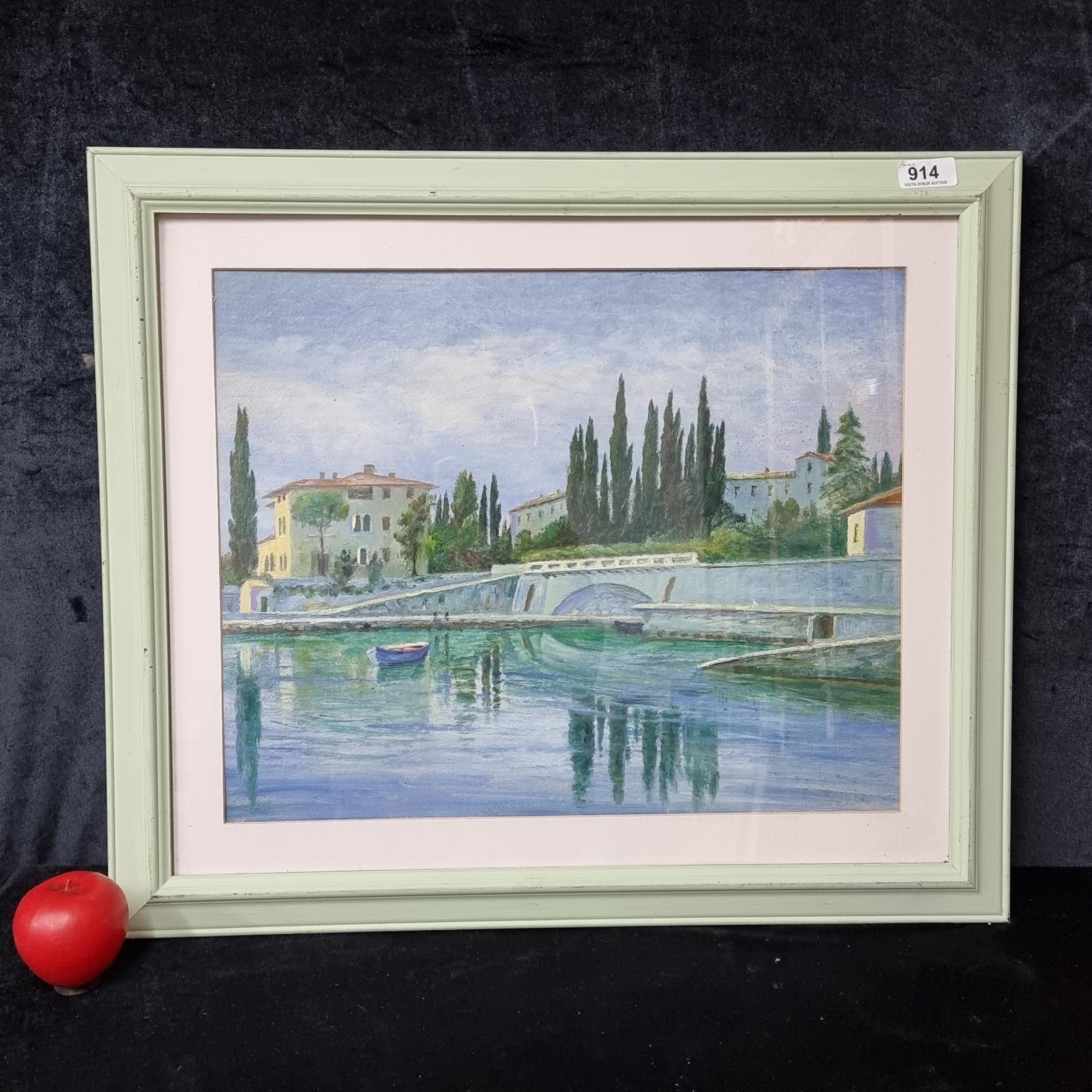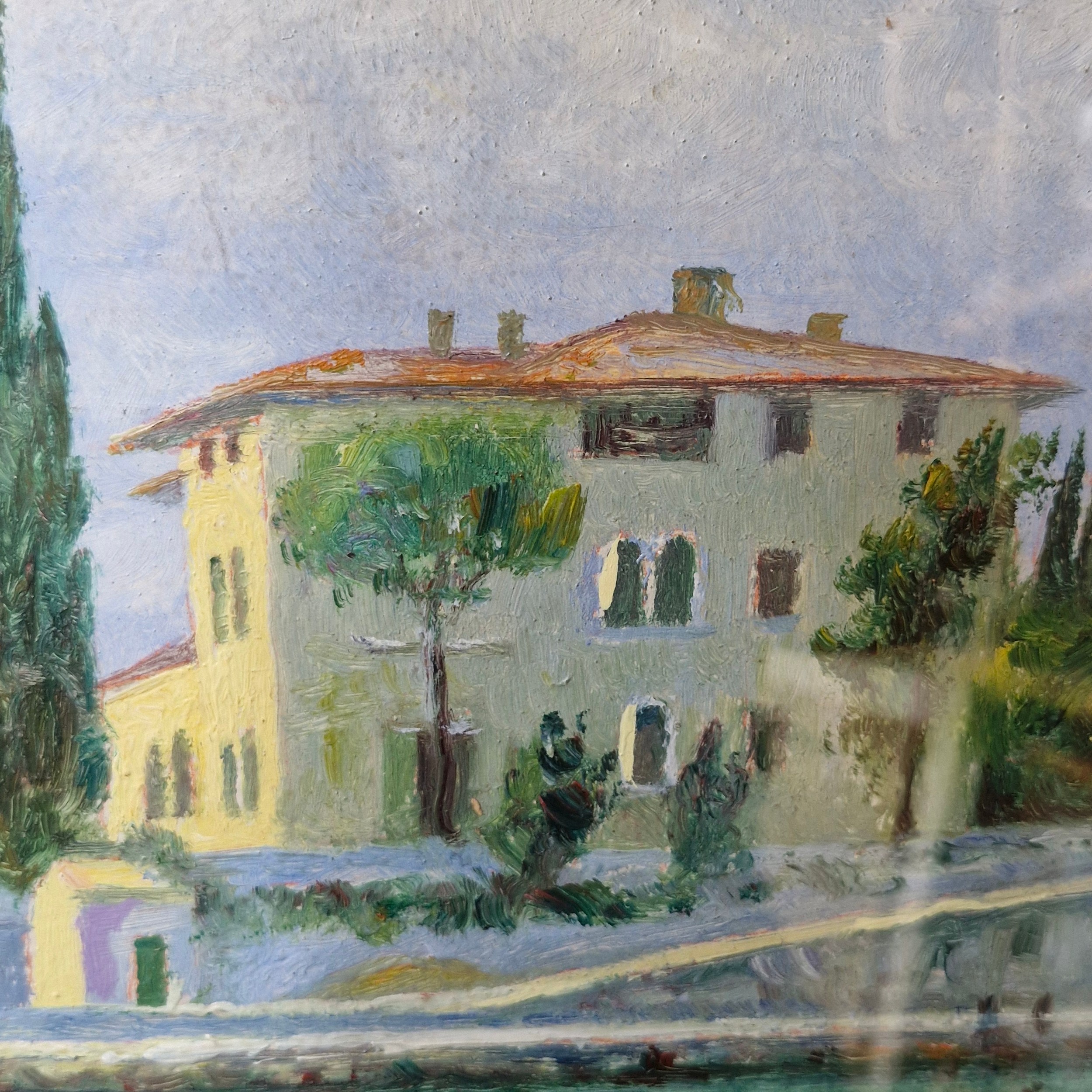 Star Lot: A charming original oil on board painting. Features the serene Lake Maggiore. Rendered in a rich cool colour palette with blues, lilacs and violets with greens and soft pastel yellows. Characterised by smooth and fluid brushstrokes creating a sense of movement and emphasis on light. Signed 'M Sablie' lower right. Housed in a painted wooden frame behind glass.