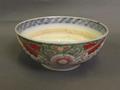 A Chinese blue and white bowl with polychrome enamel floral decoration to the outside, 3 character mark to base, 7¼' diameter