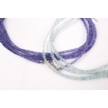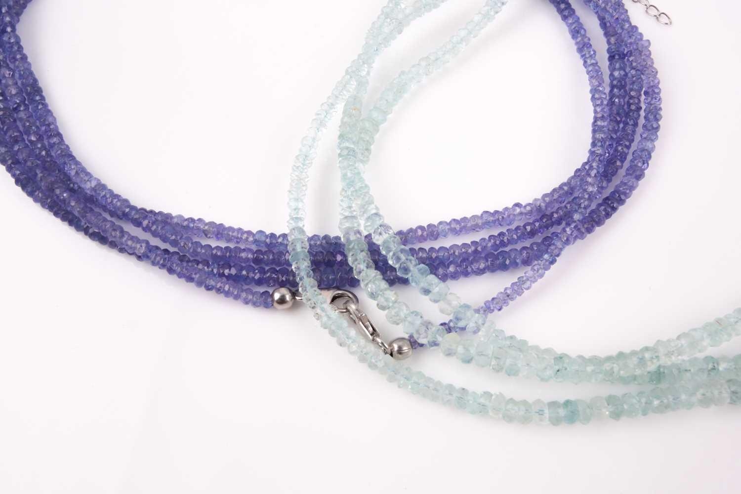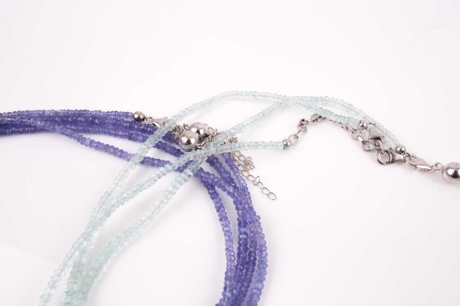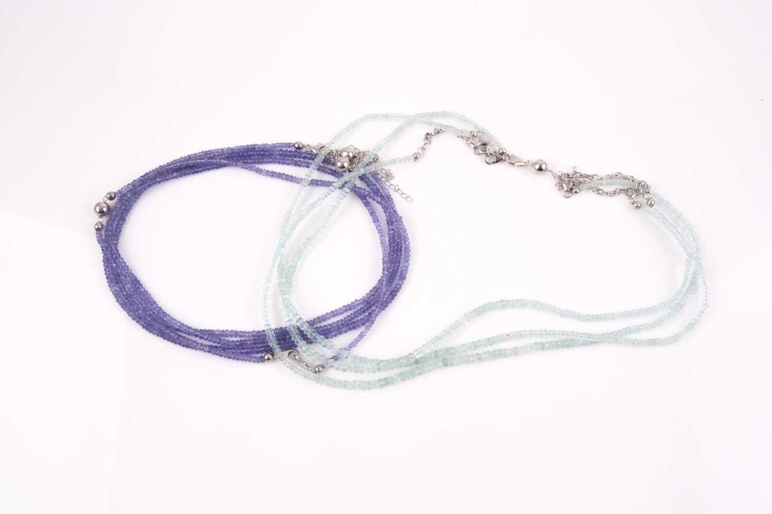 An unusual tanzanite beaded necklace, comprised of three connected strands of faceted beads, with magnetic silver clasps, together with three similar faceted aquamarine beaded necklaces with adjustable silver clasps.
