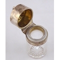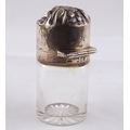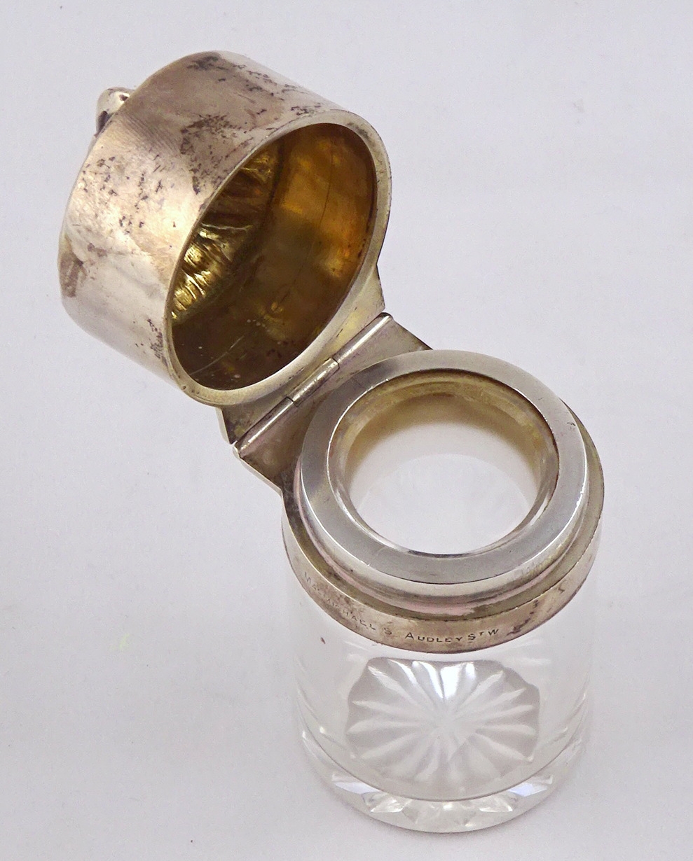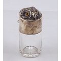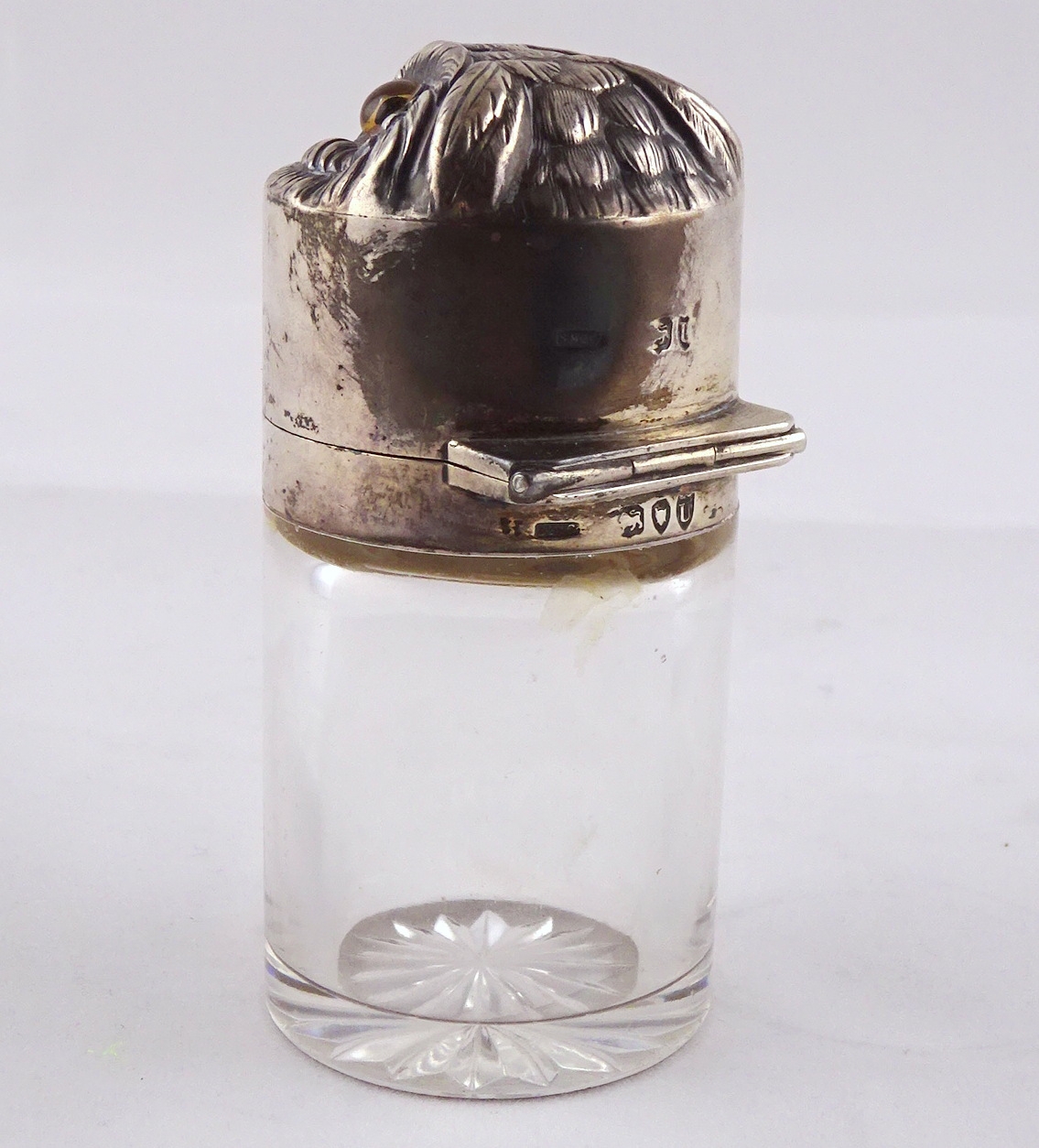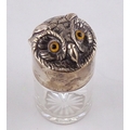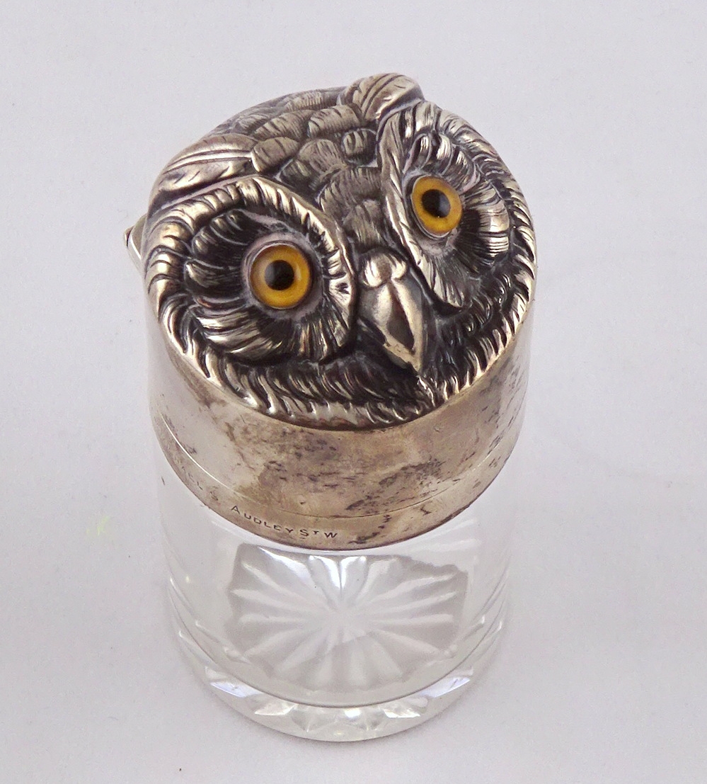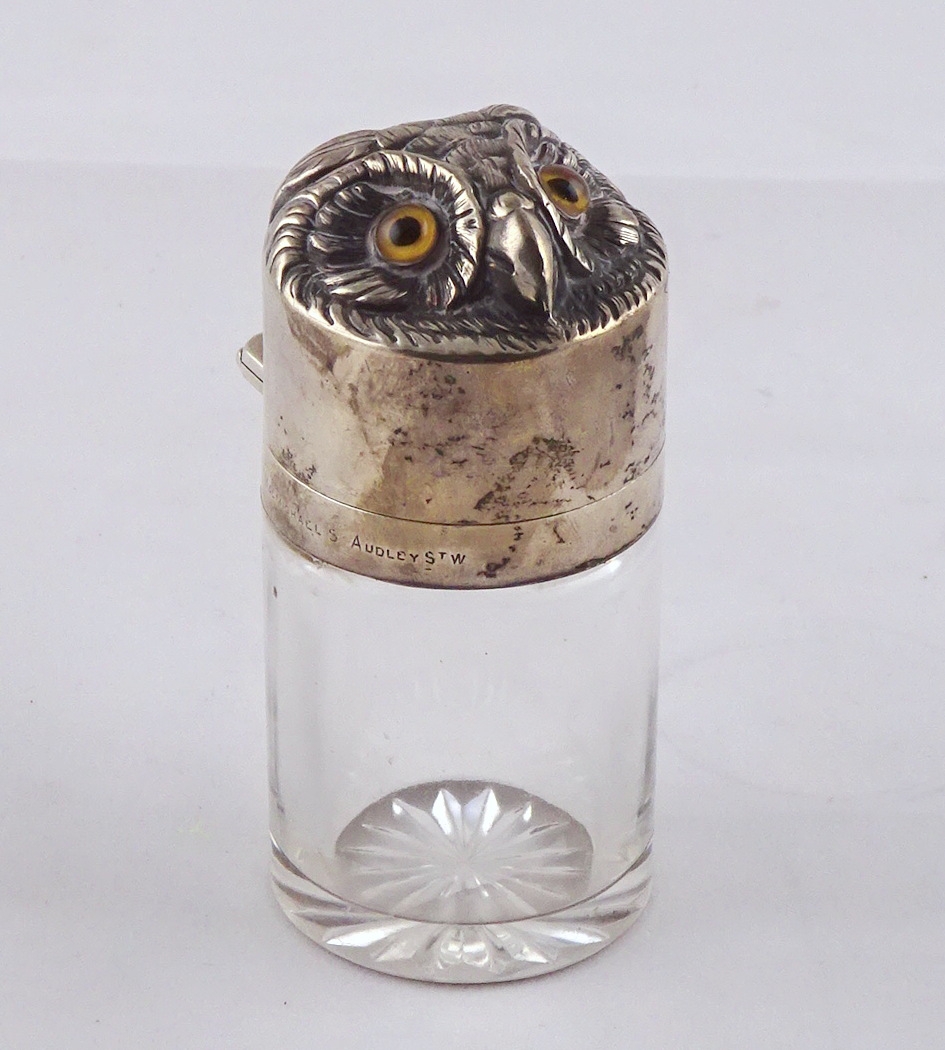 A glass salts bottle having a hinged silver lid styled as an owl's head, inner glass stopper lacking. Sampson Mordan & Co London 1895. 85mm tall. (by instruction of the family of Dame Fanny Waterman)