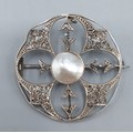A white gold brooch of circular pierced form set with central Pearl surrounded with Diamond clusters, 3.5cms diameter, 6.2gms