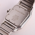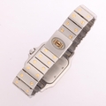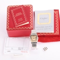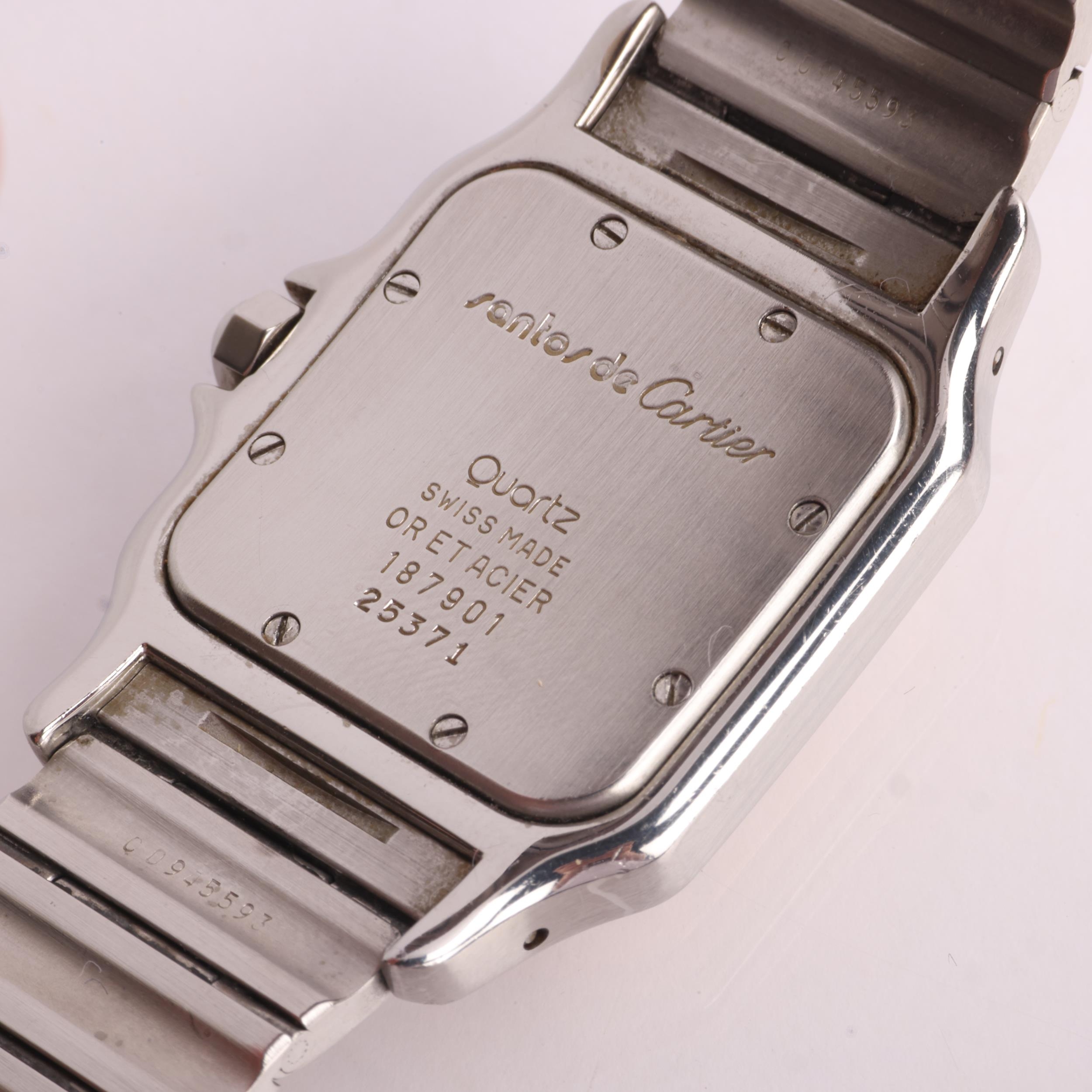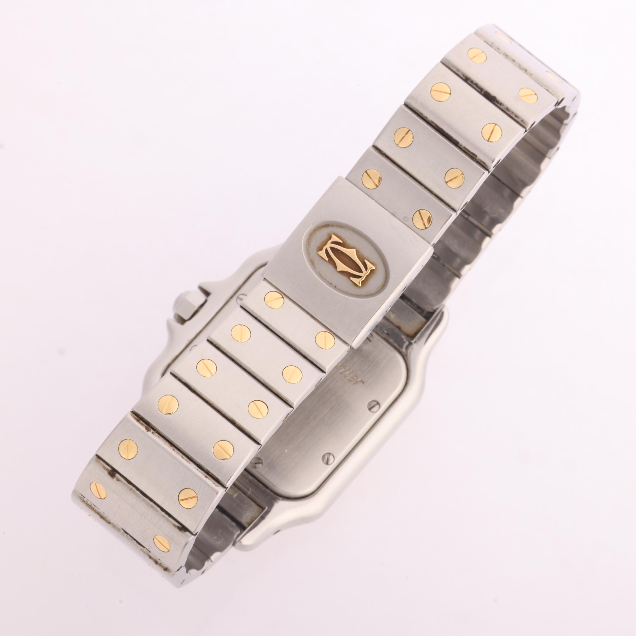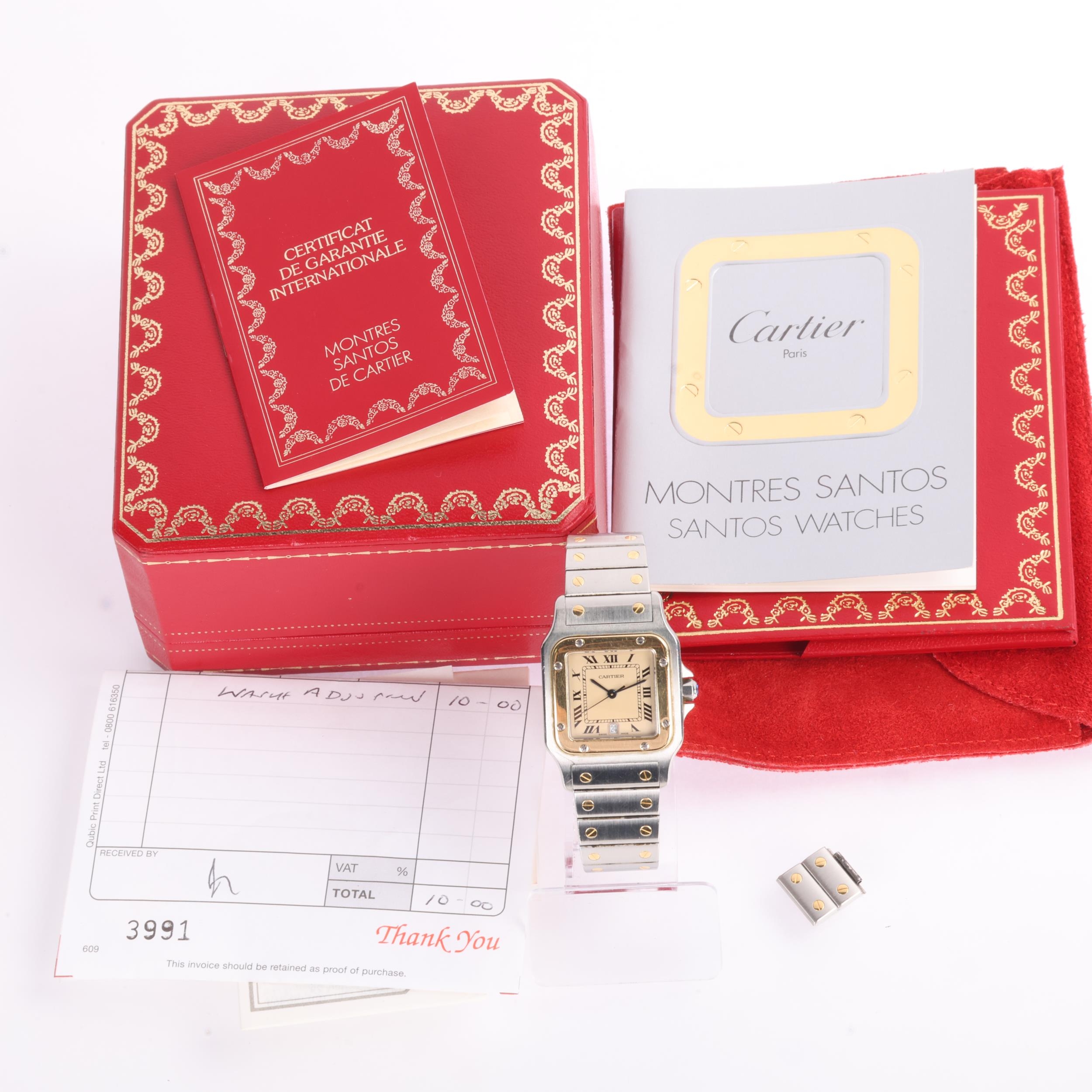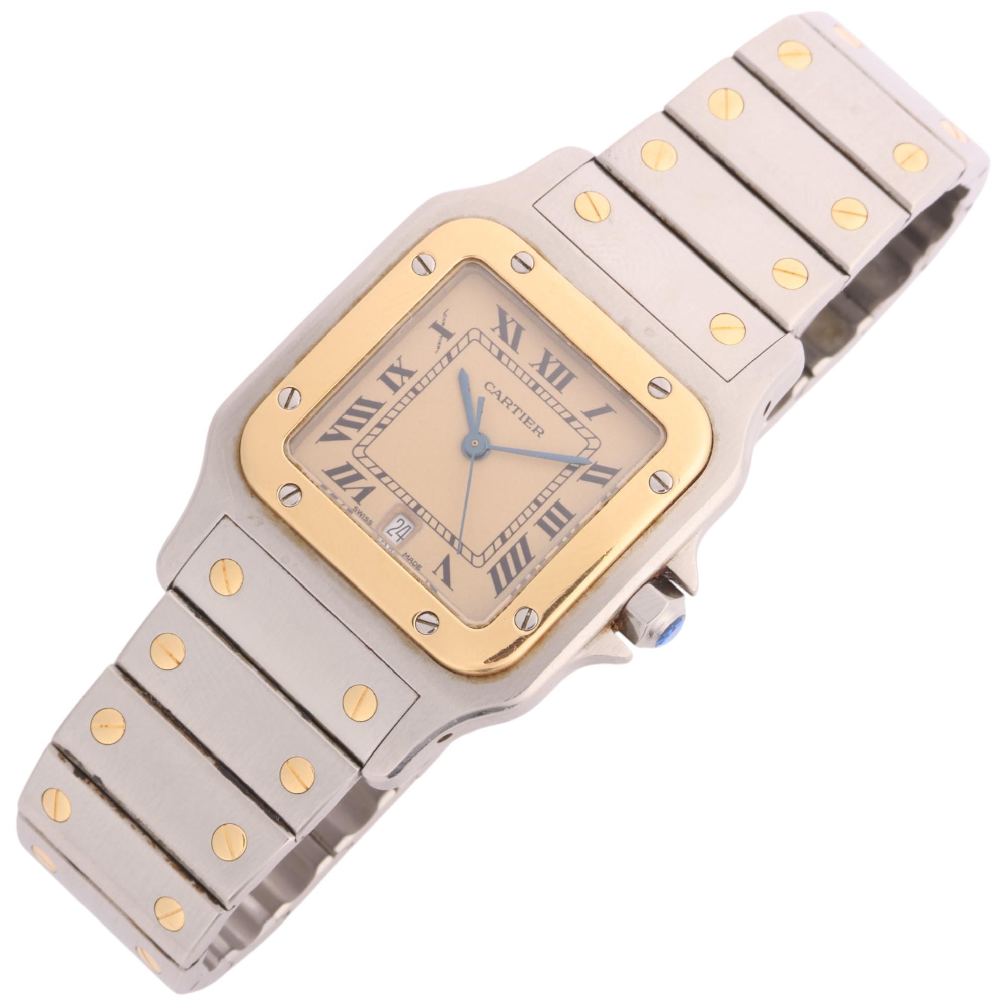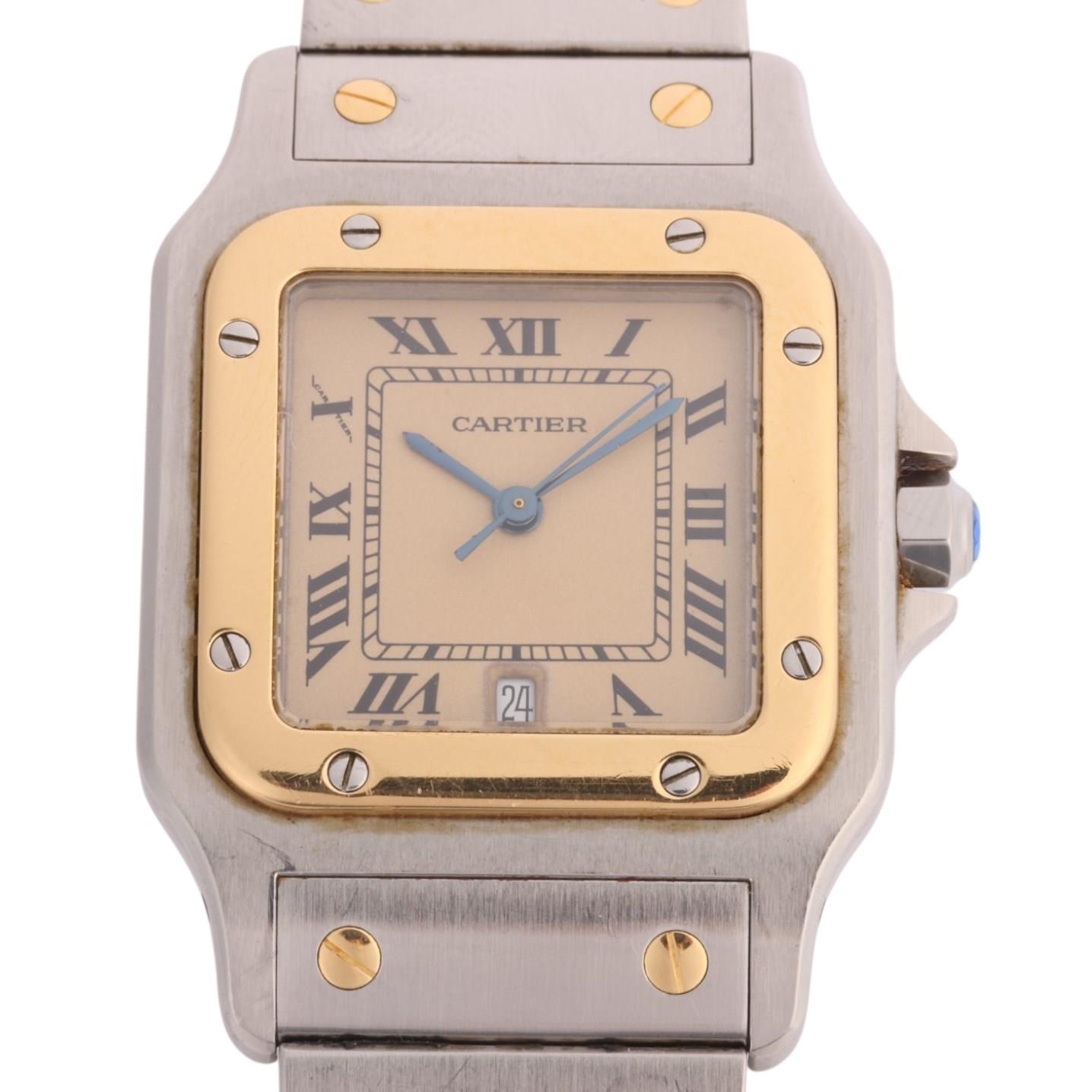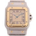 CARTIER - a bi-metal Santos De Cartier quartz calendar bracelet watch, ref. 187901, circa 1990, silvered dial with black Roman numeral hour markers, having secret Cartier signature at 10, blued sword hands, sweep centre seconds hand, date aperture with stainless steel and 18ct gold screw-head motif bezel and bracelet, serial no. 25371, case width 29mm, working order, boxed with papers