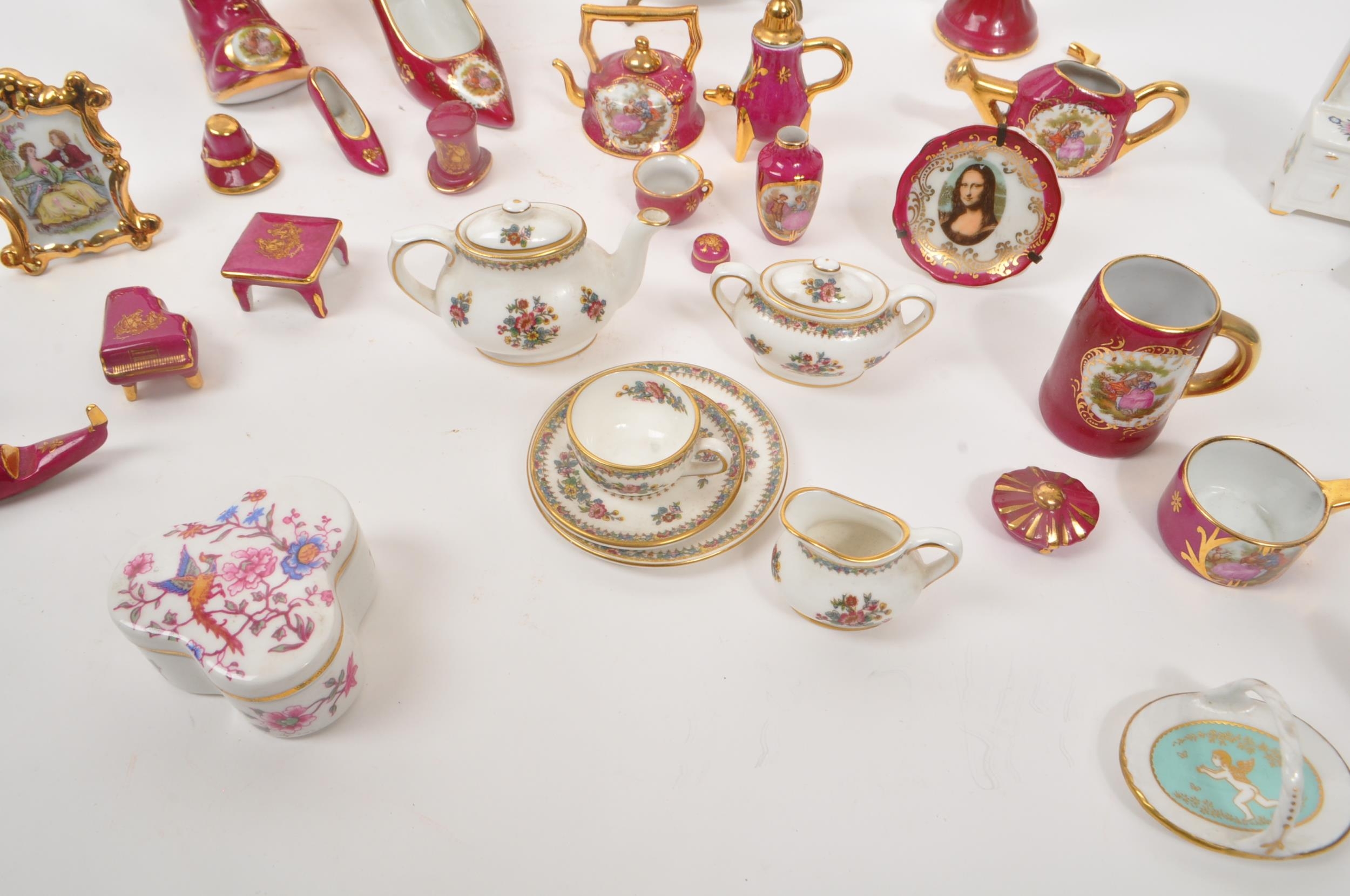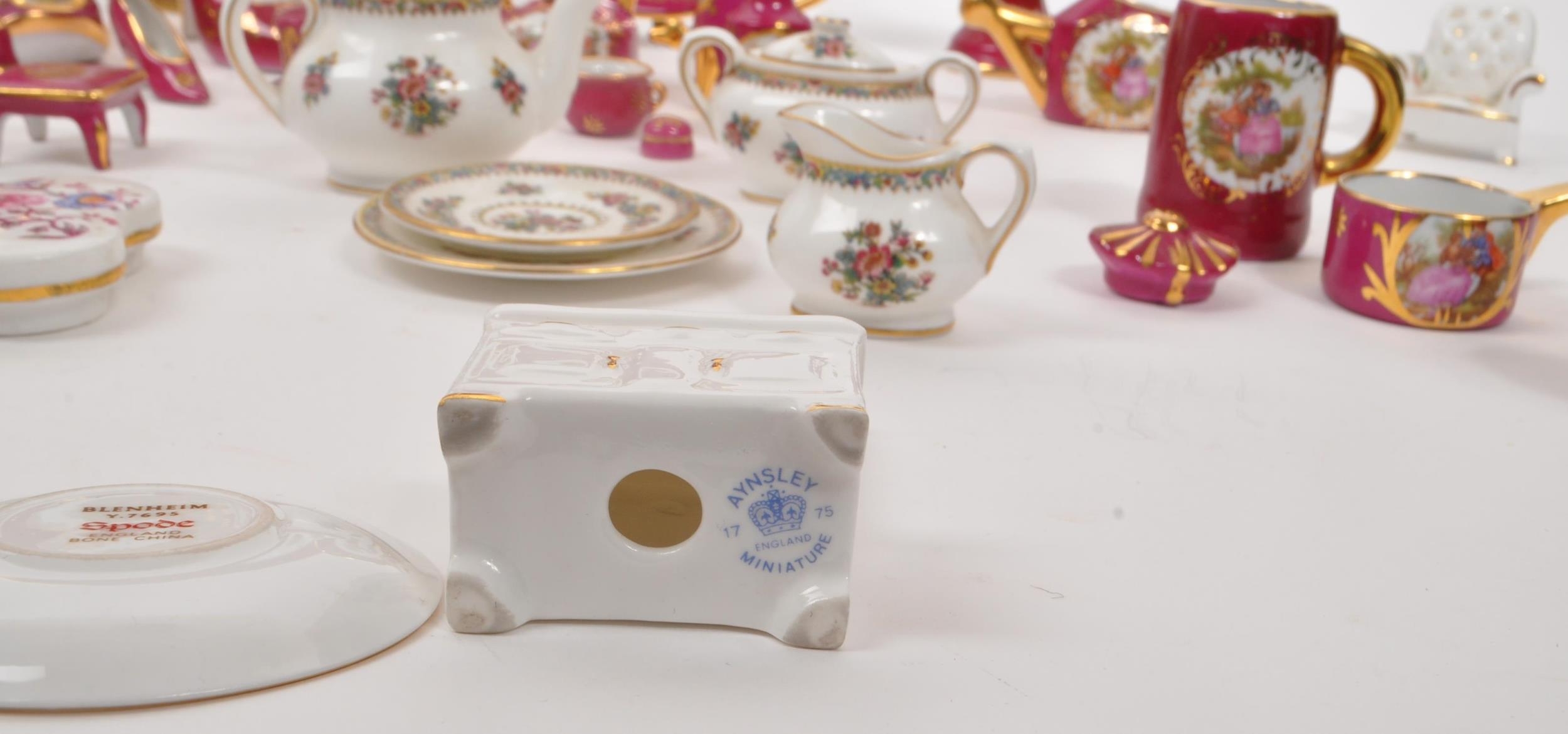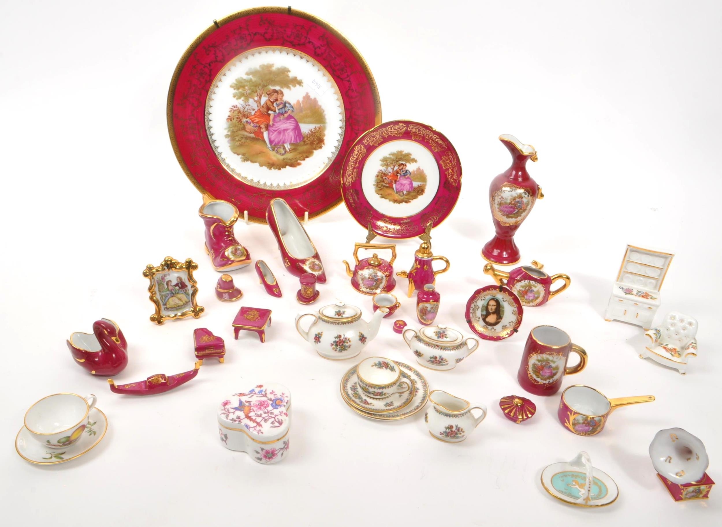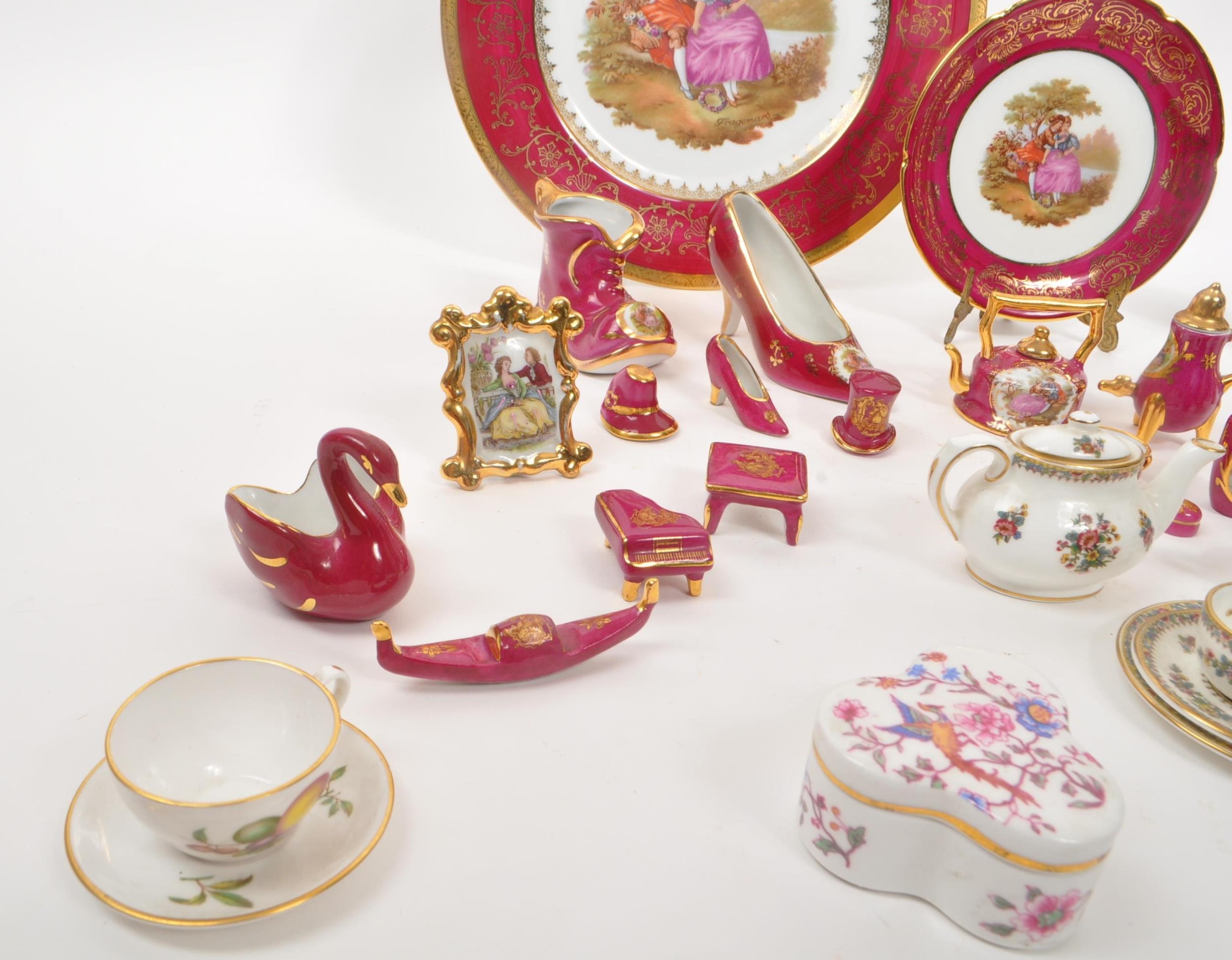 Limoges France / Coalport - A collection of 20th Century vintage porcelain china Limoges France burgundy and gilt miniature trinkets comprising of watering can, teapot, shoes, swan, hat, gramophone, piano, pots and jug together with two plates. Accompanied by other miniature china items by Coalport, Aynsley and Spode to include teacup and saucer, teapot, jug, sugar pot, armchair, kitchen unit, and lidded pot. Plate measuring approx. 25cm diameter.
