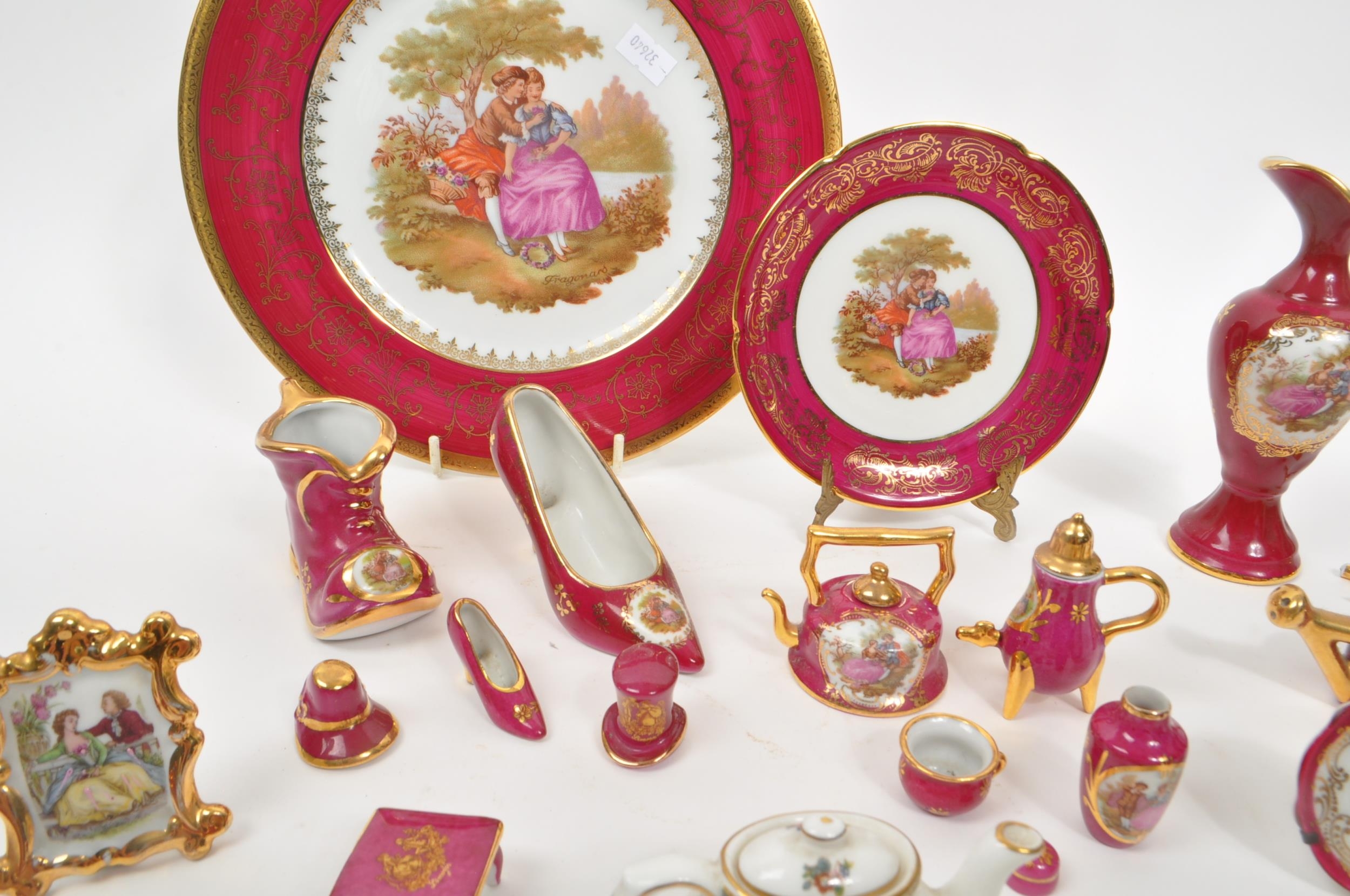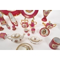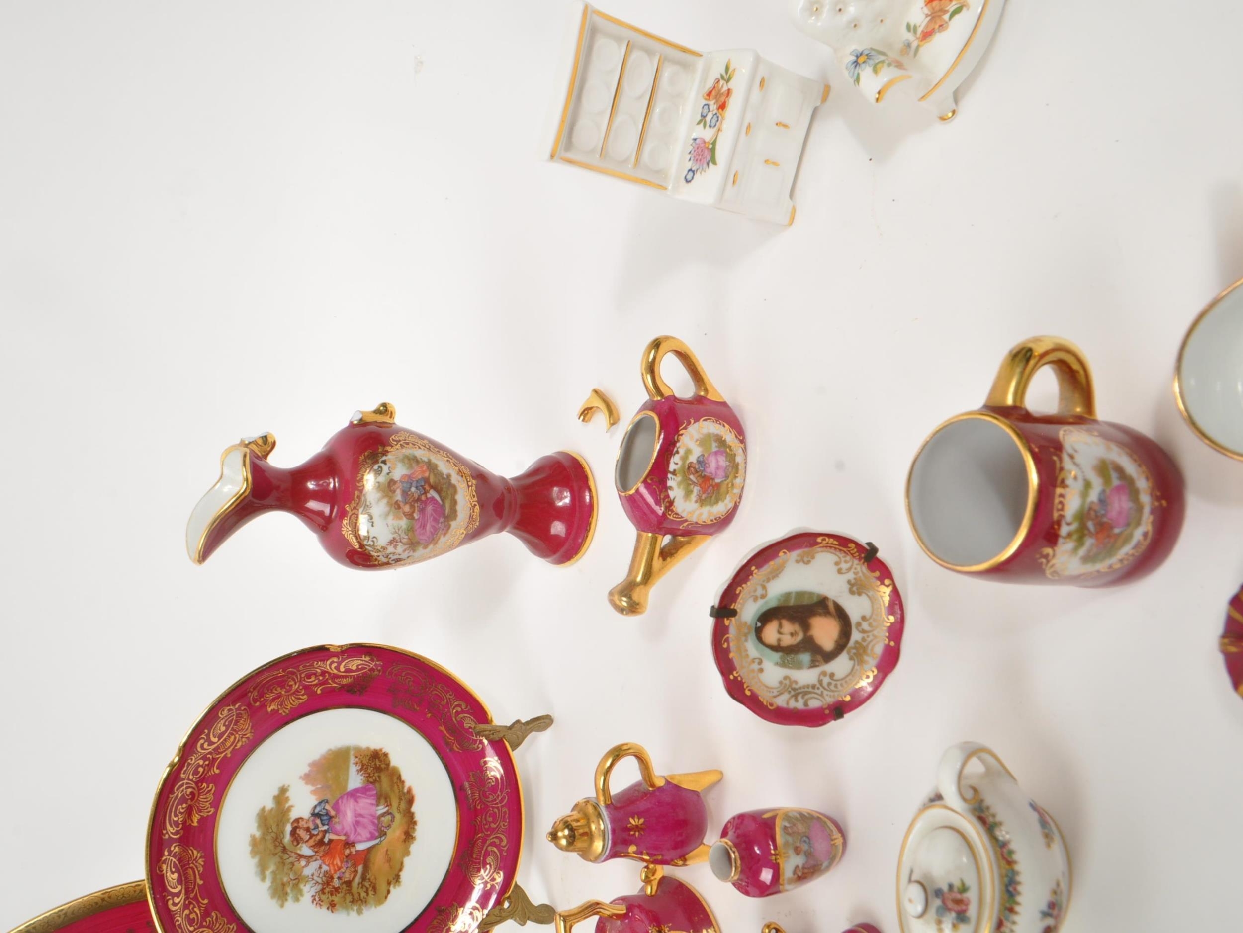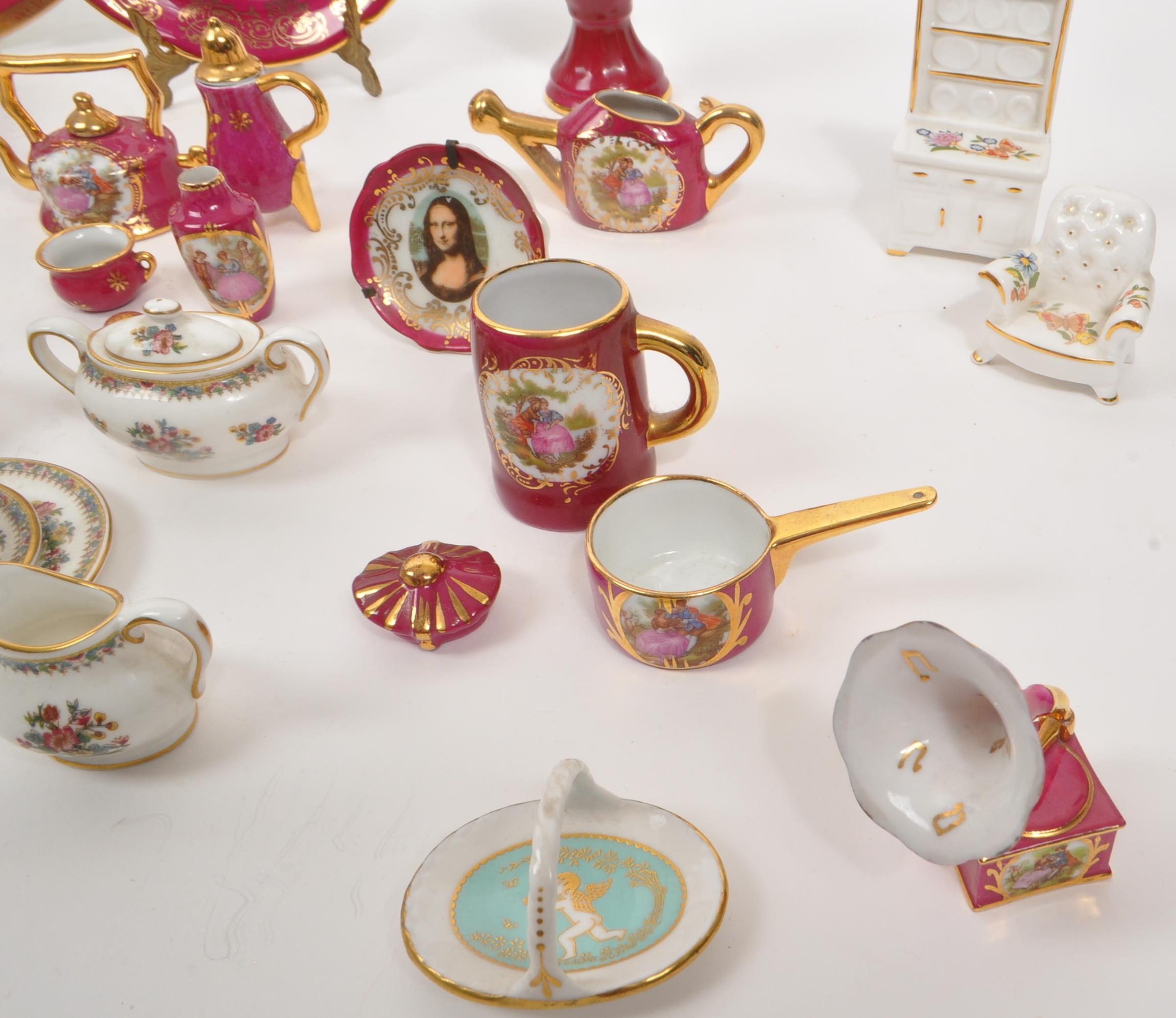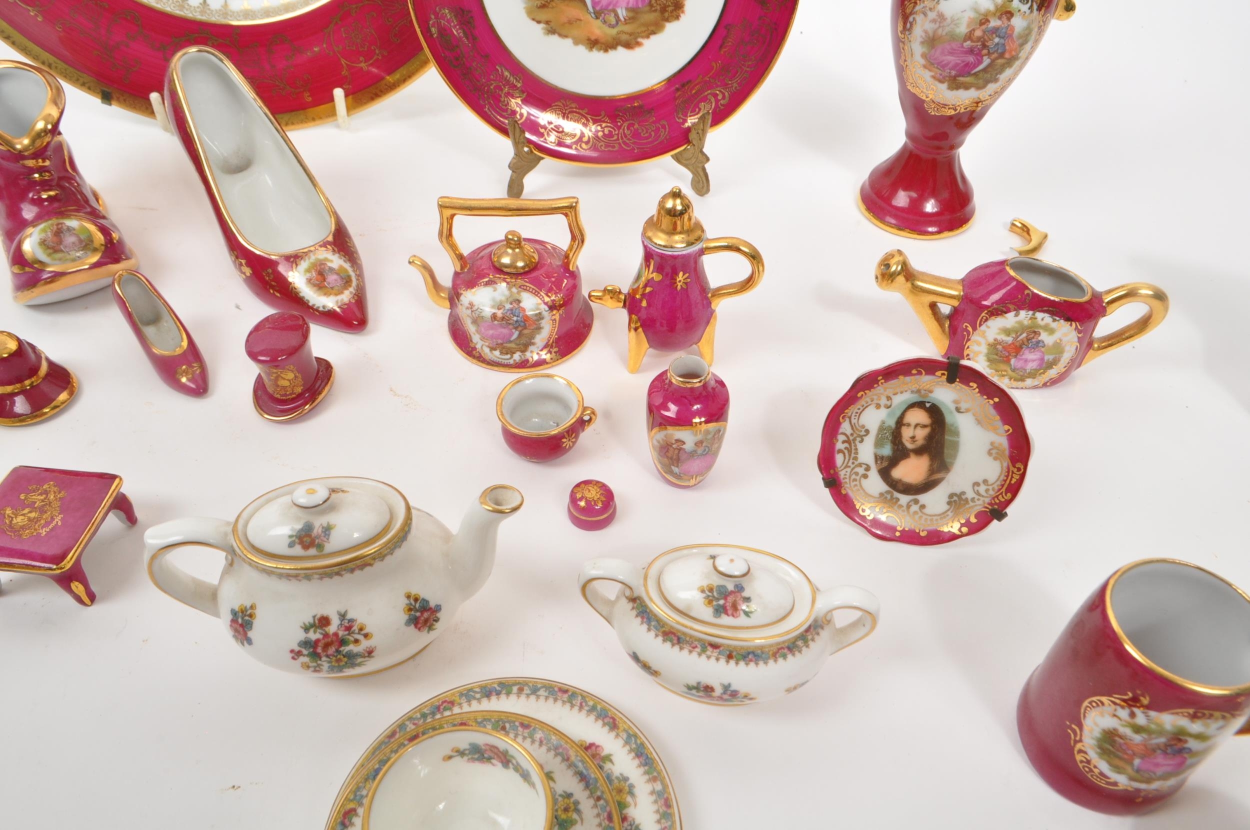 Limoges France / Coalport - A collection of 20th Century vintage porcelain china Limoges France burgundy and gilt miniature trinkets comprising of watering can, teapot, shoes, swan, hat, gramophone, piano, pots and jug together with two plates. Accompanied by other miniature china items by Coalport, Aynsley and Spode to include teacup and saucer, teapot, jug, sugar pot, armchair, kitchen unit, and lidded pot. Plate measuring approx. 25cm diameter.