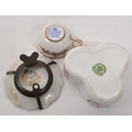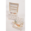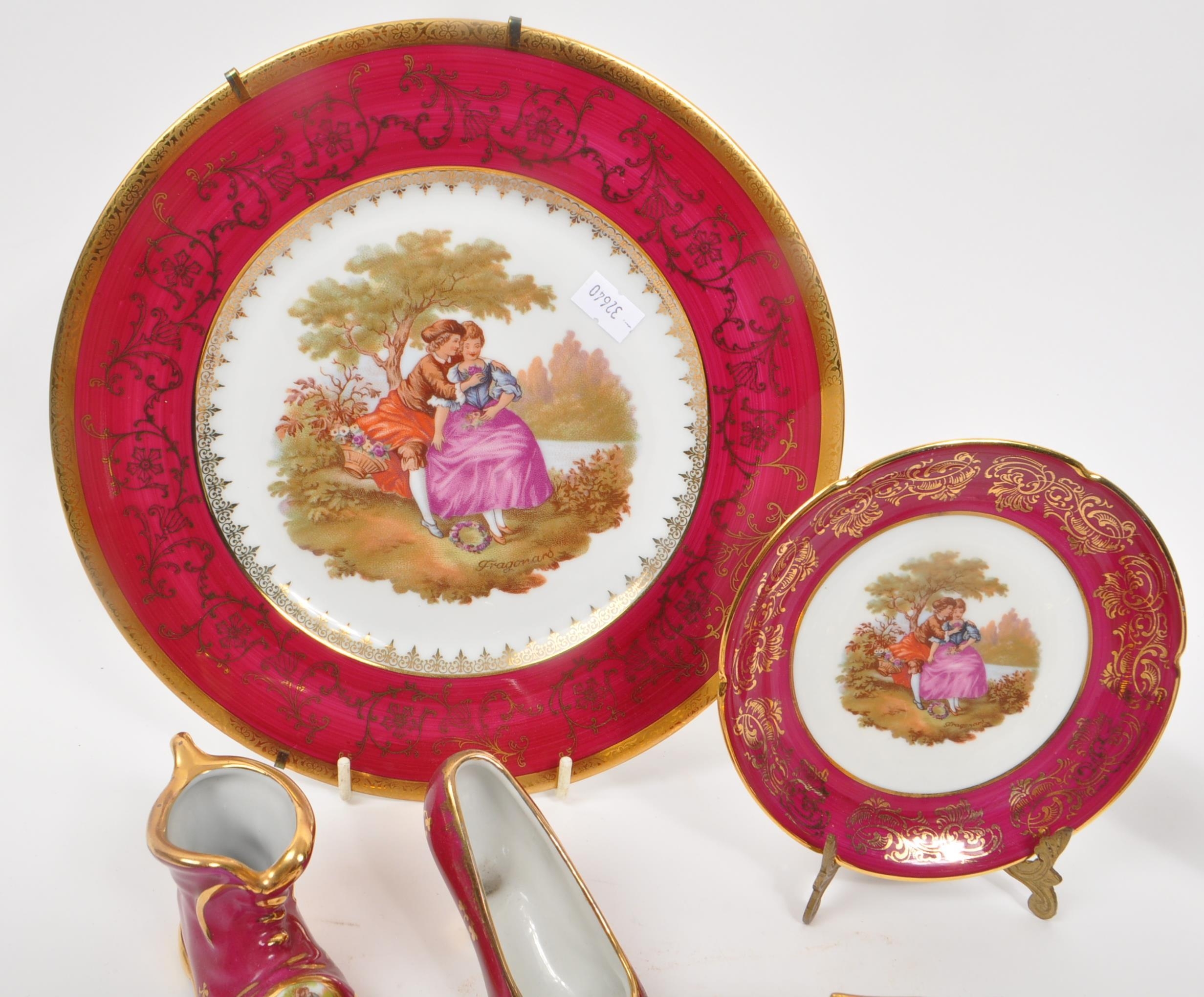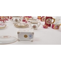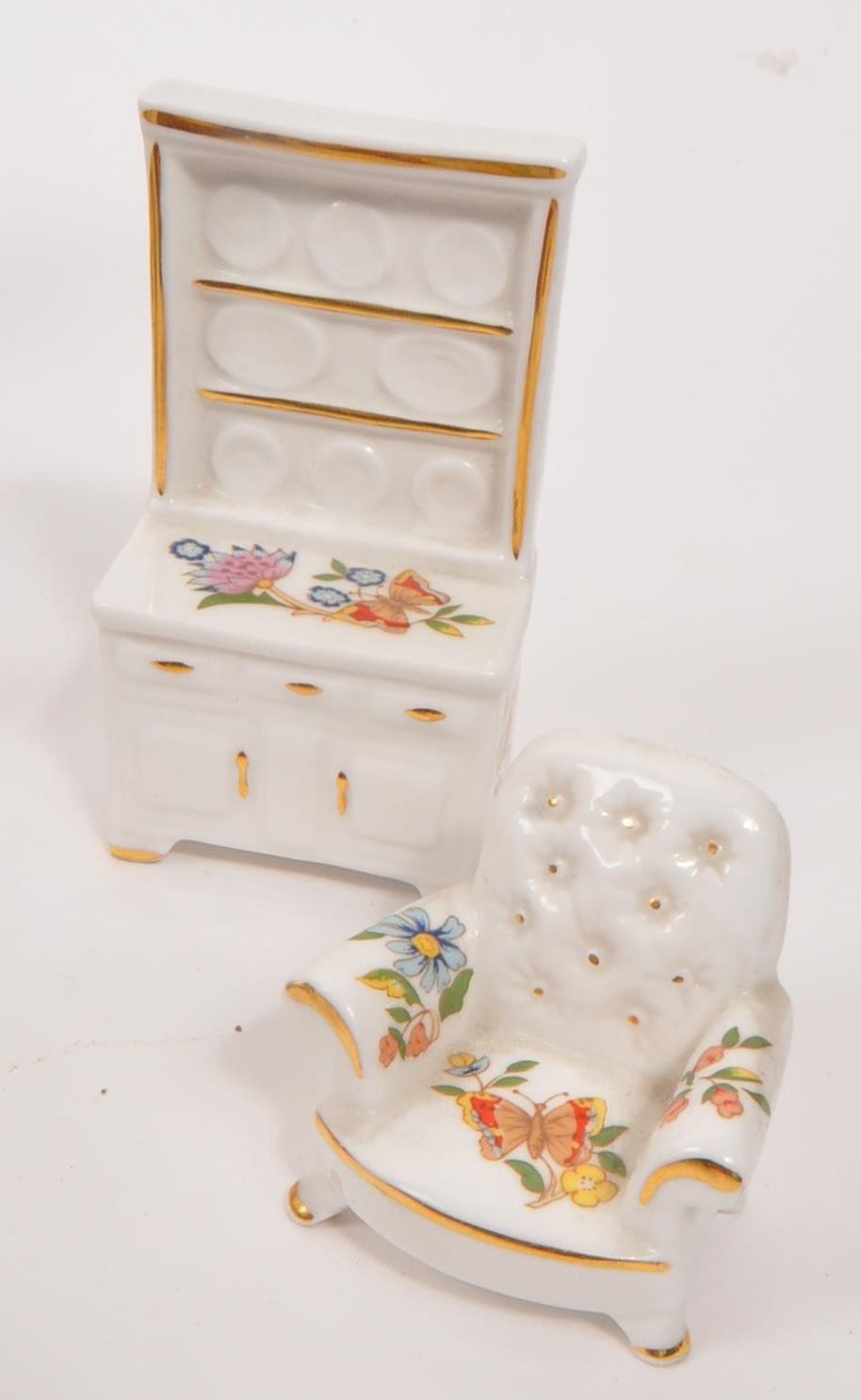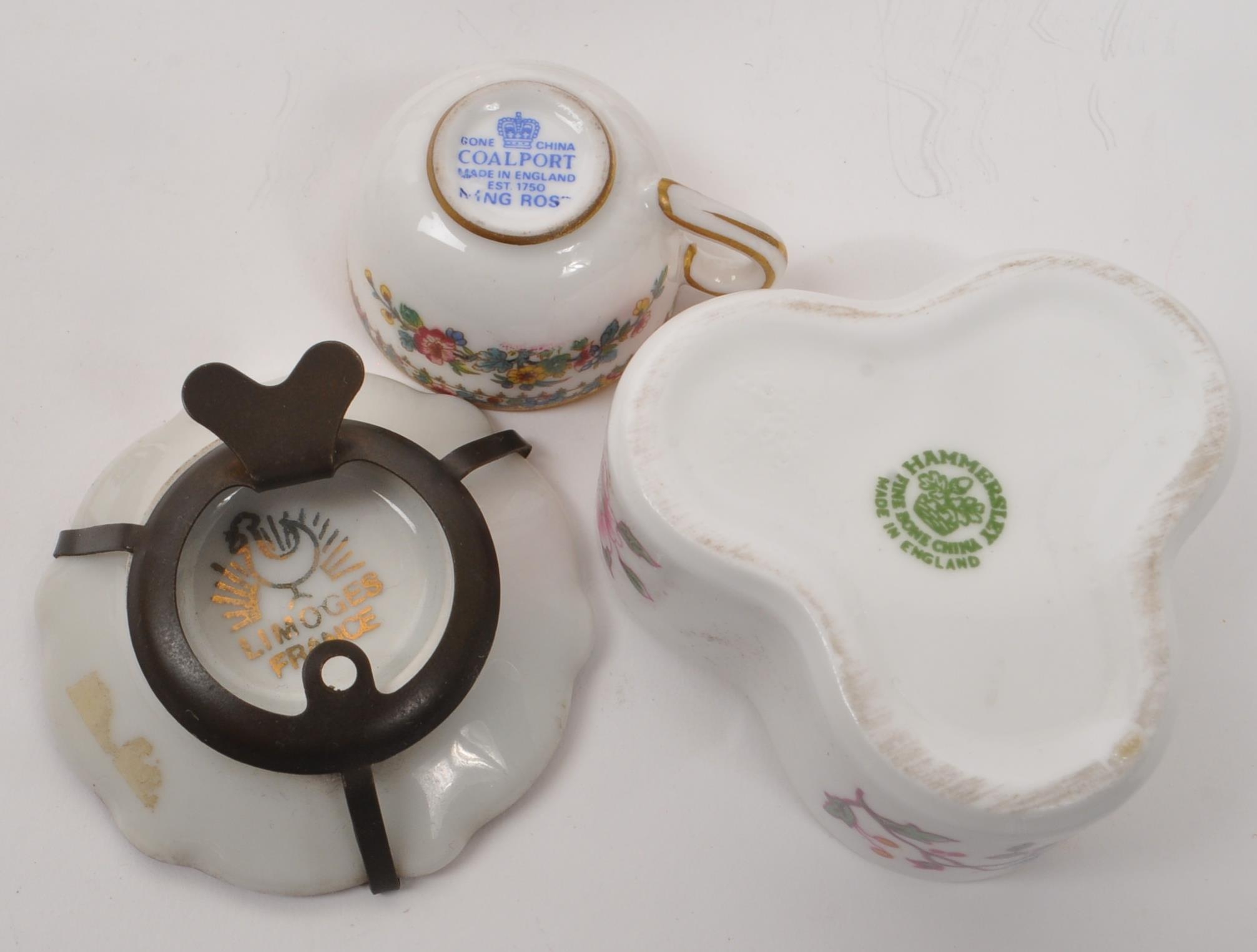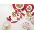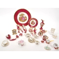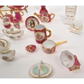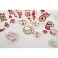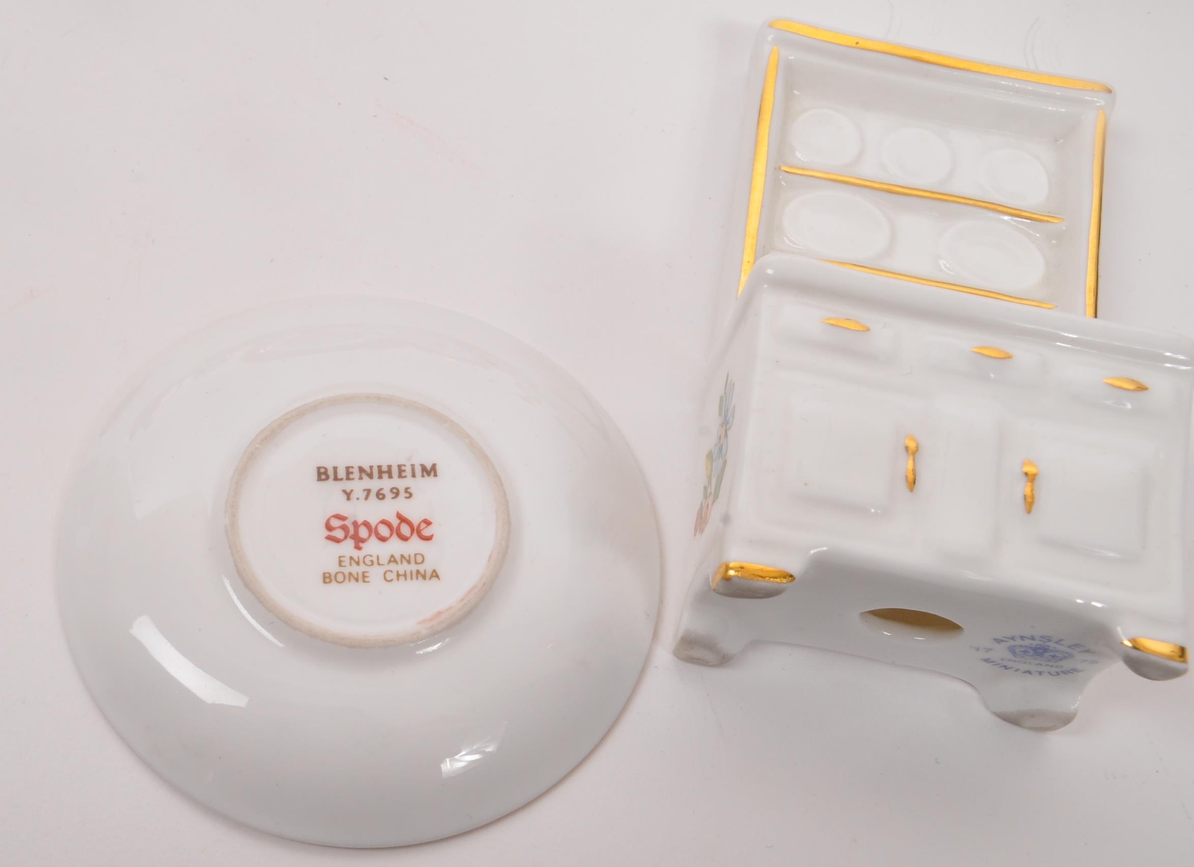 Limoges France / Coalport - A collection of 20th Century vintage porcelain china Limoges France burgundy and gilt miniature trinkets comprising of watering can, teapot, shoes, swan, hat, gramophone, piano, pots and jug together with two plates. Accompanied by other miniature china items by Coalport, Aynsley and Spode to include teacup and saucer, teapot, jug, sugar pot, armchair, kitchen unit, and lidded pot. Plate measuring approx. 25cm diameter.