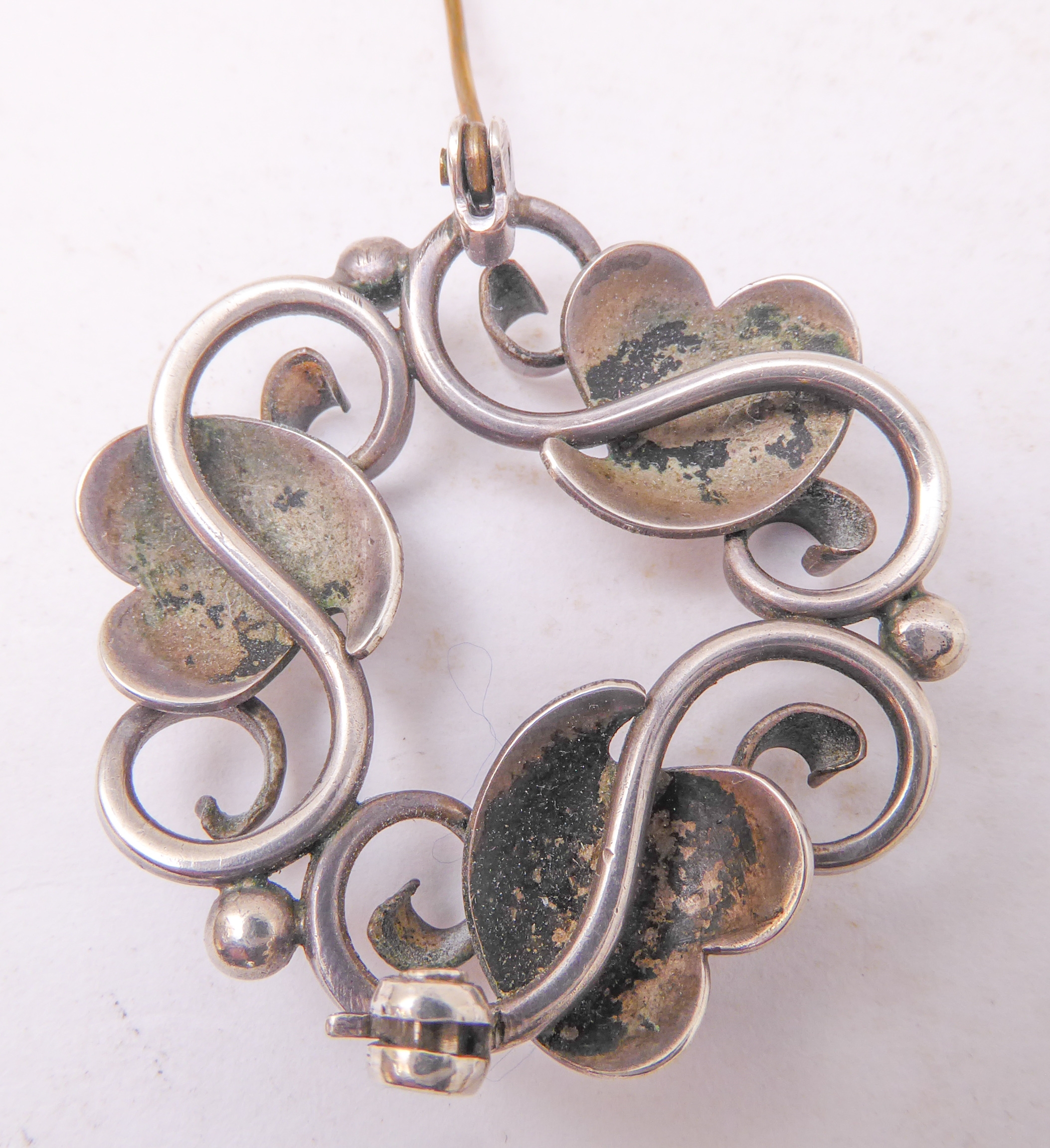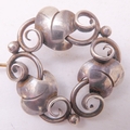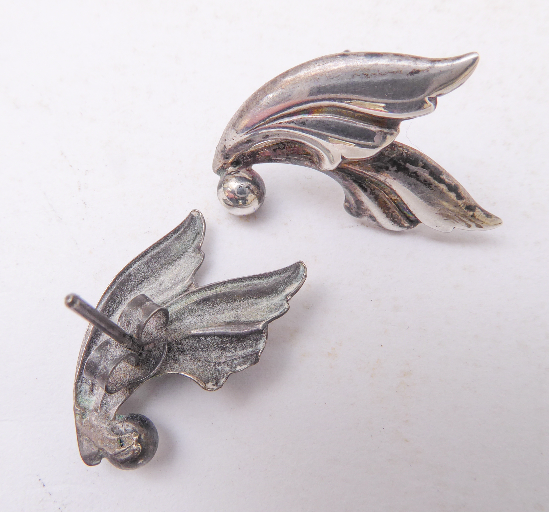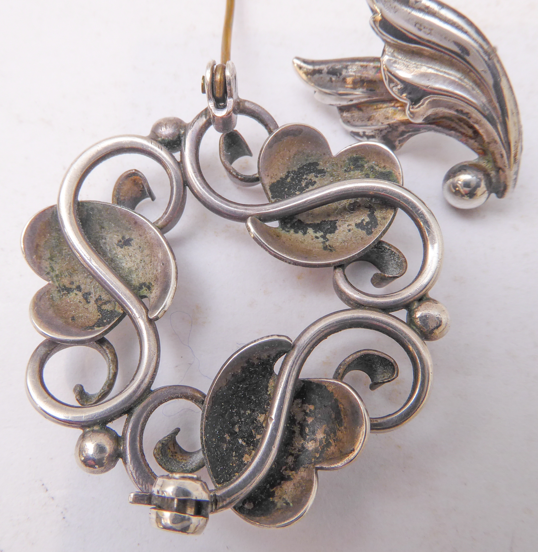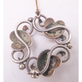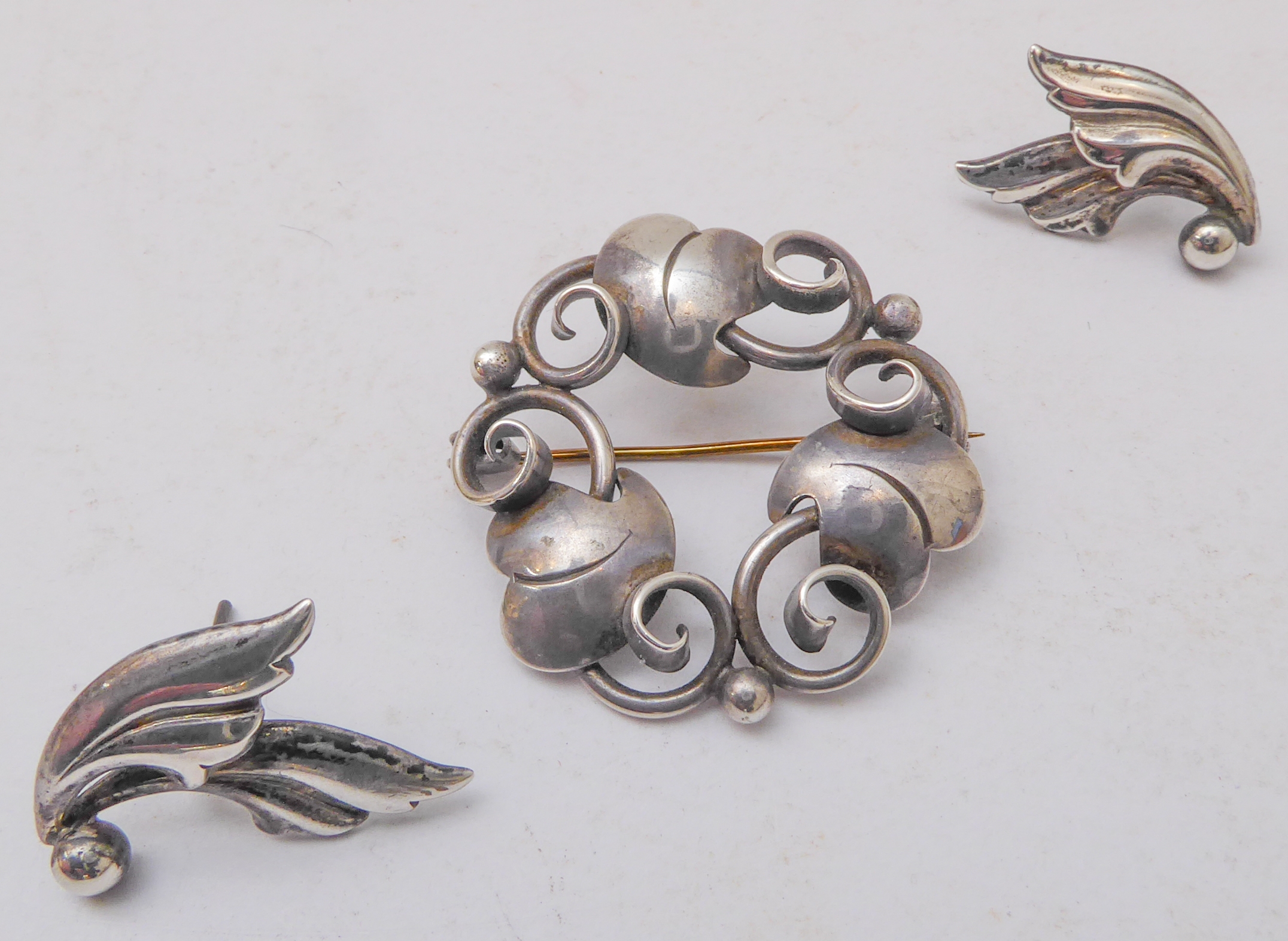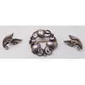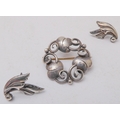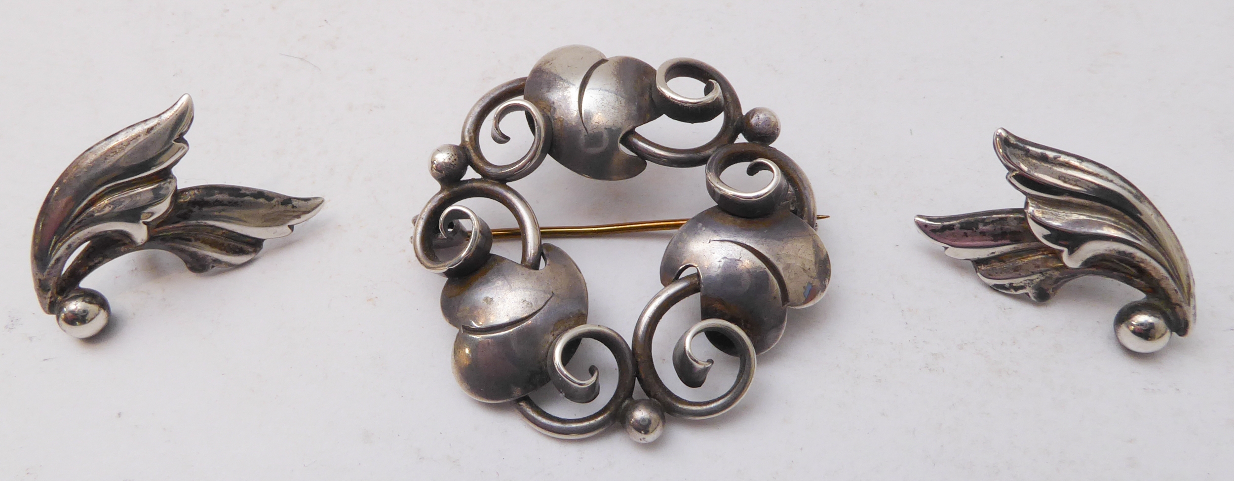 A Georg Jensen design silver-coloured brooch, together with a small pair of Jensen silver leaf-design ear-clips