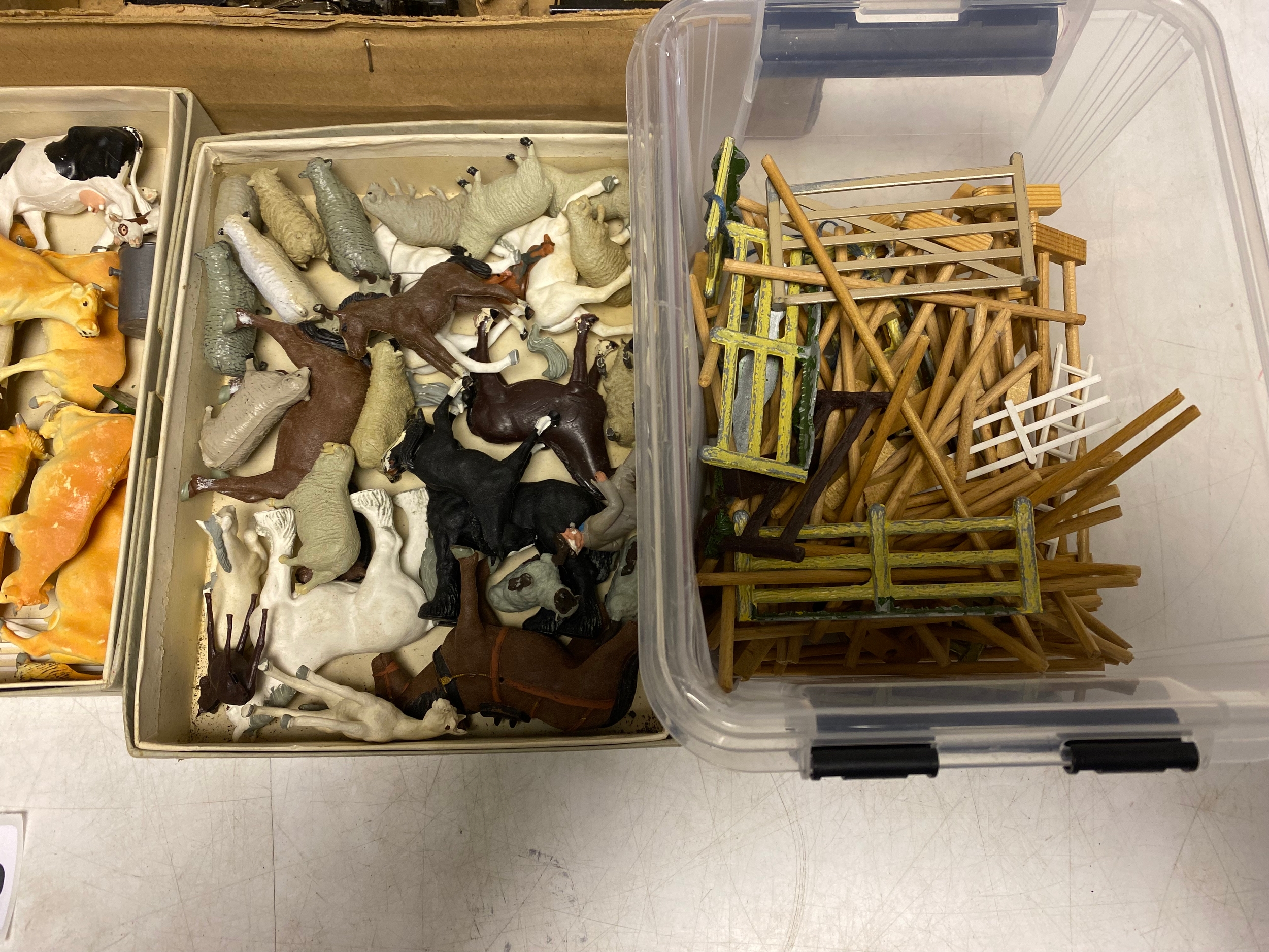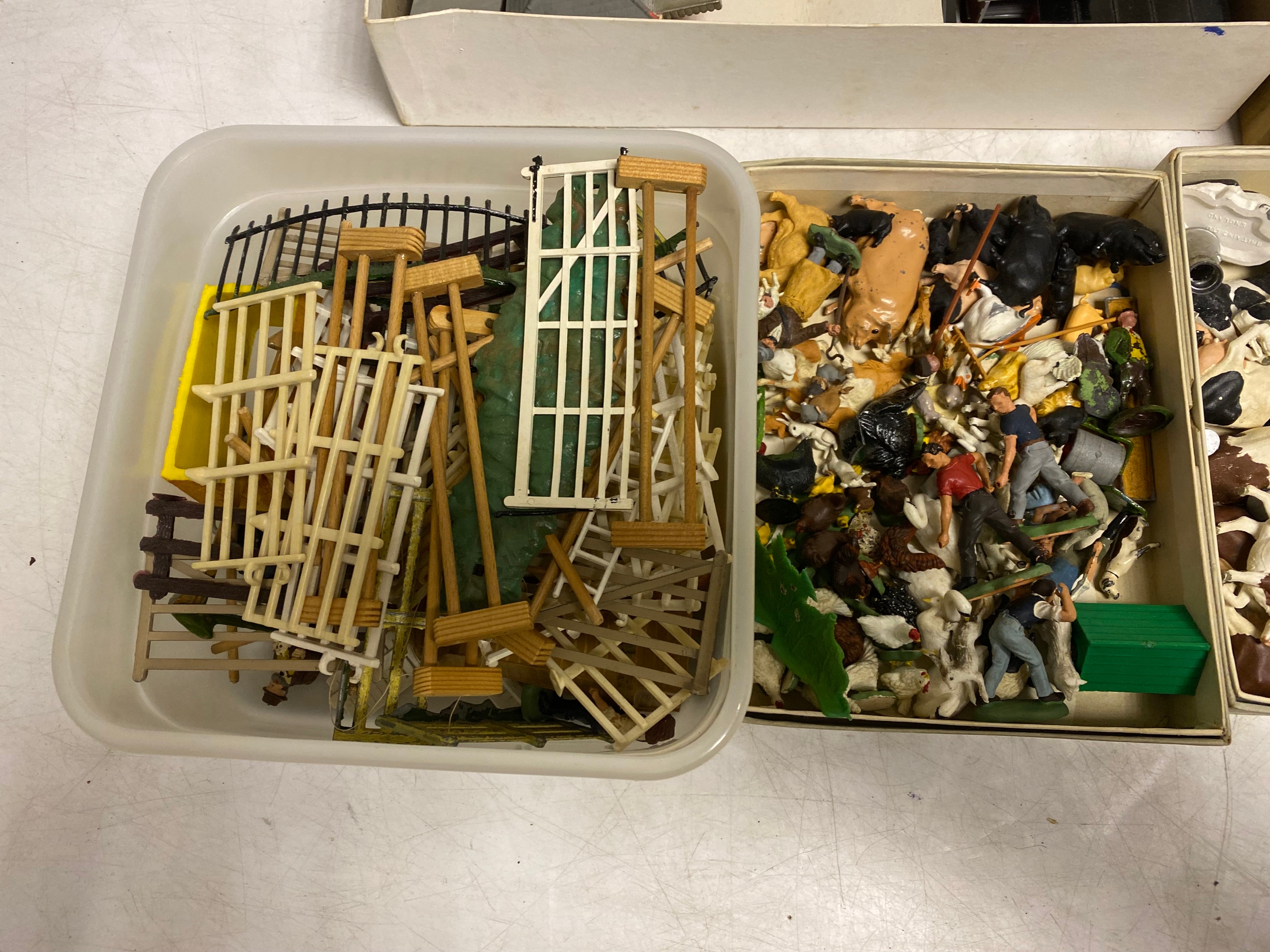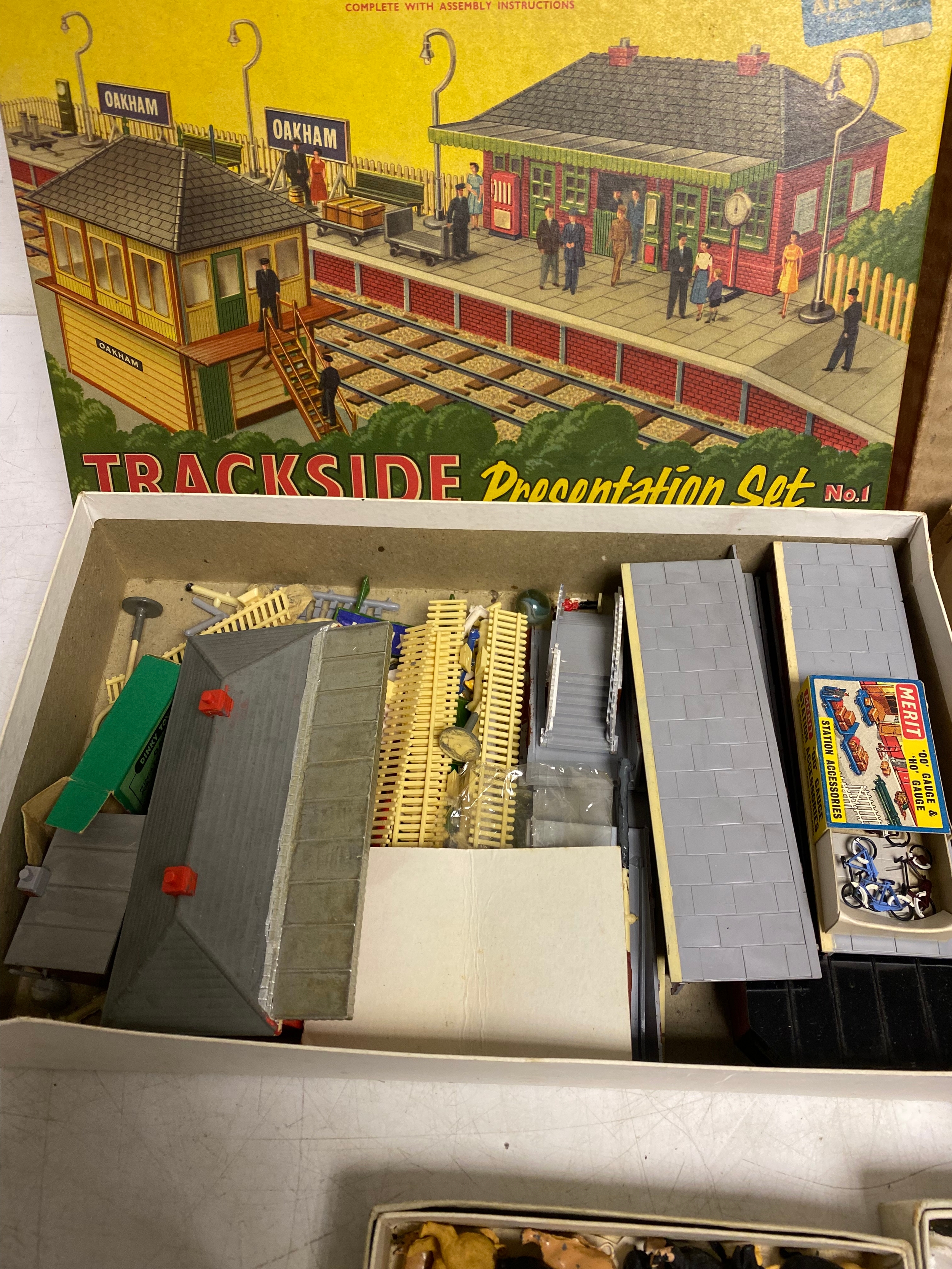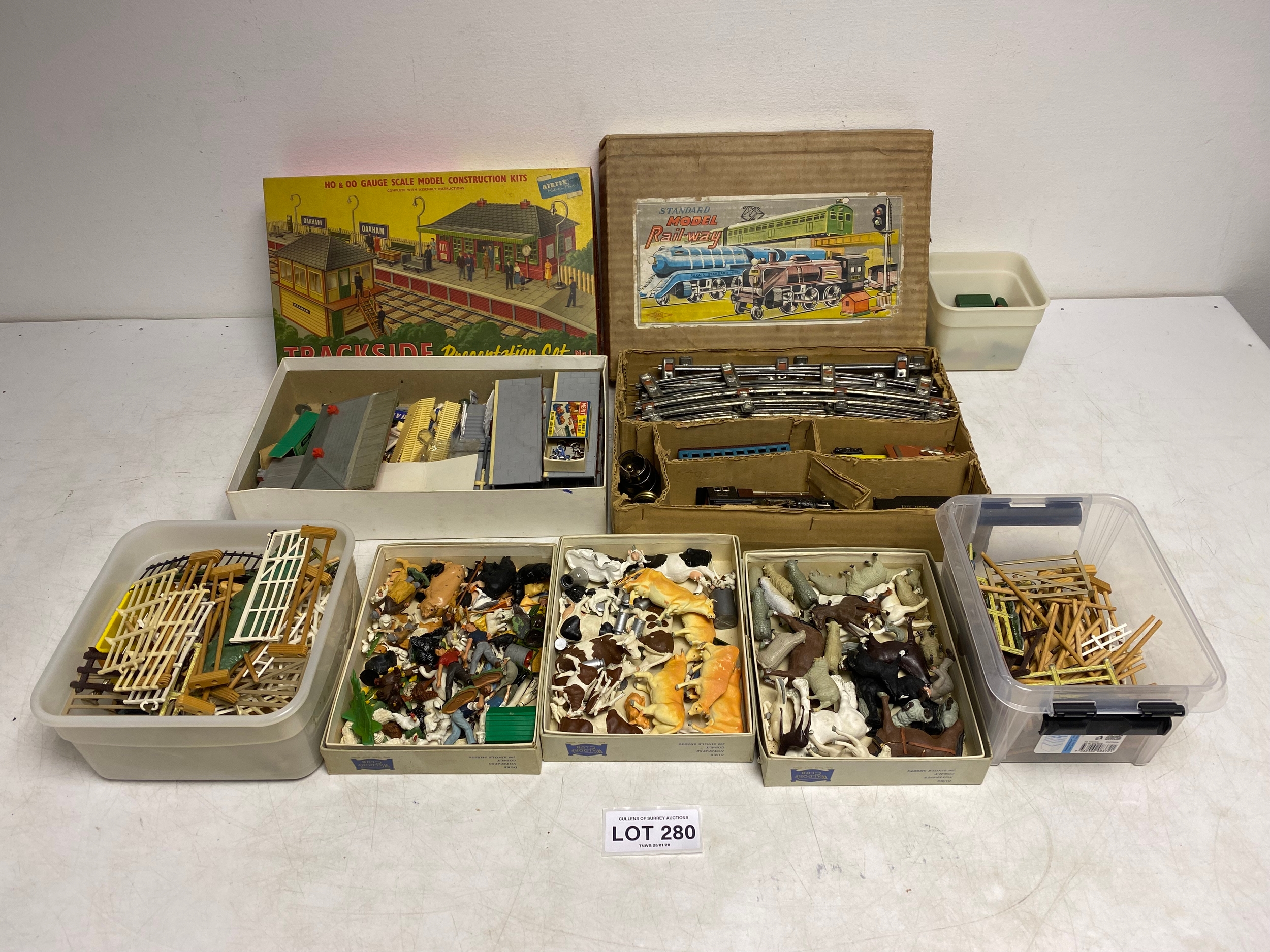 Assortment of vintage farm figures, animals and fencing as well as Boxed Airfix HO &OO Gauge Trackside Presentation Kit and Boxed Standard Model Rail-way