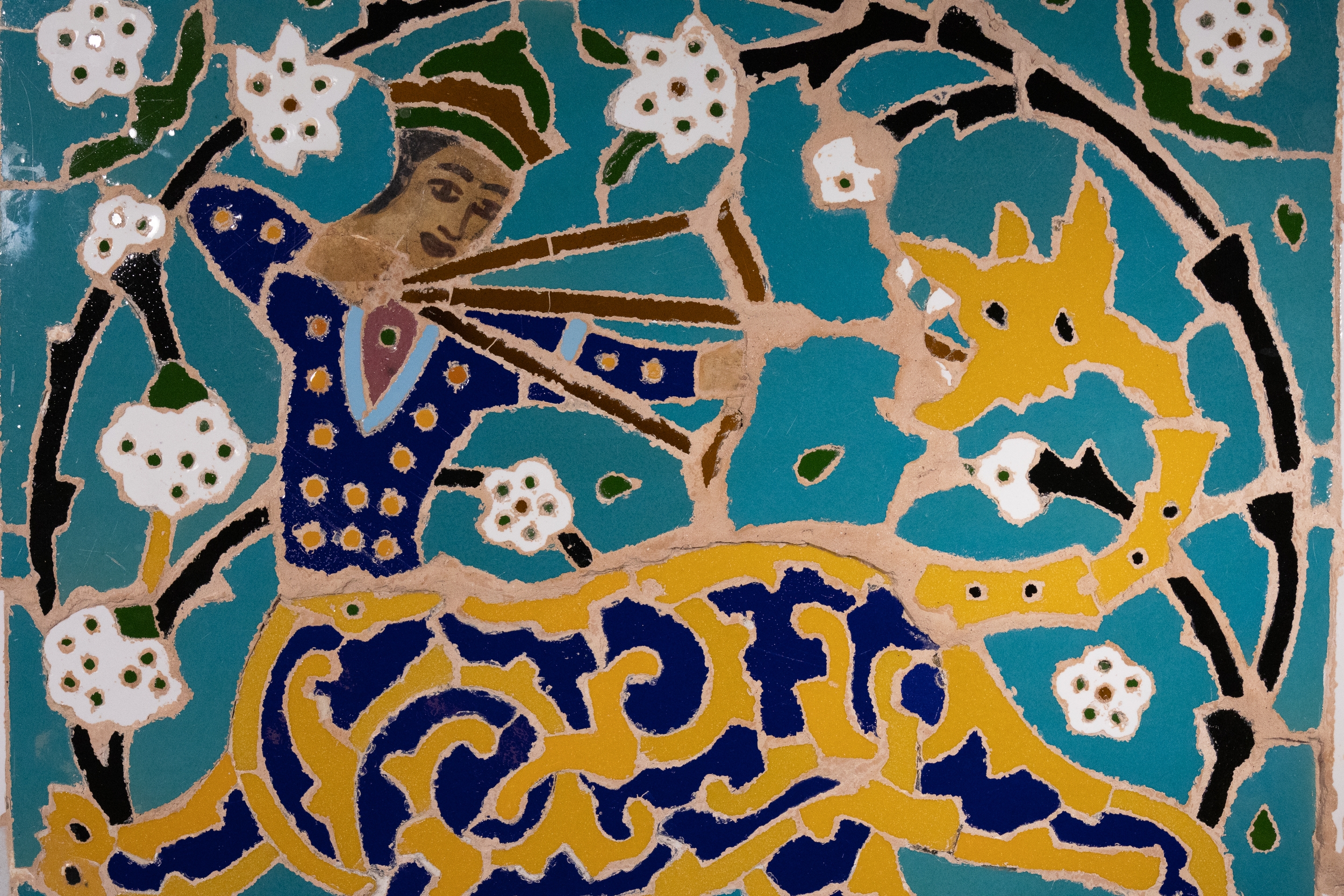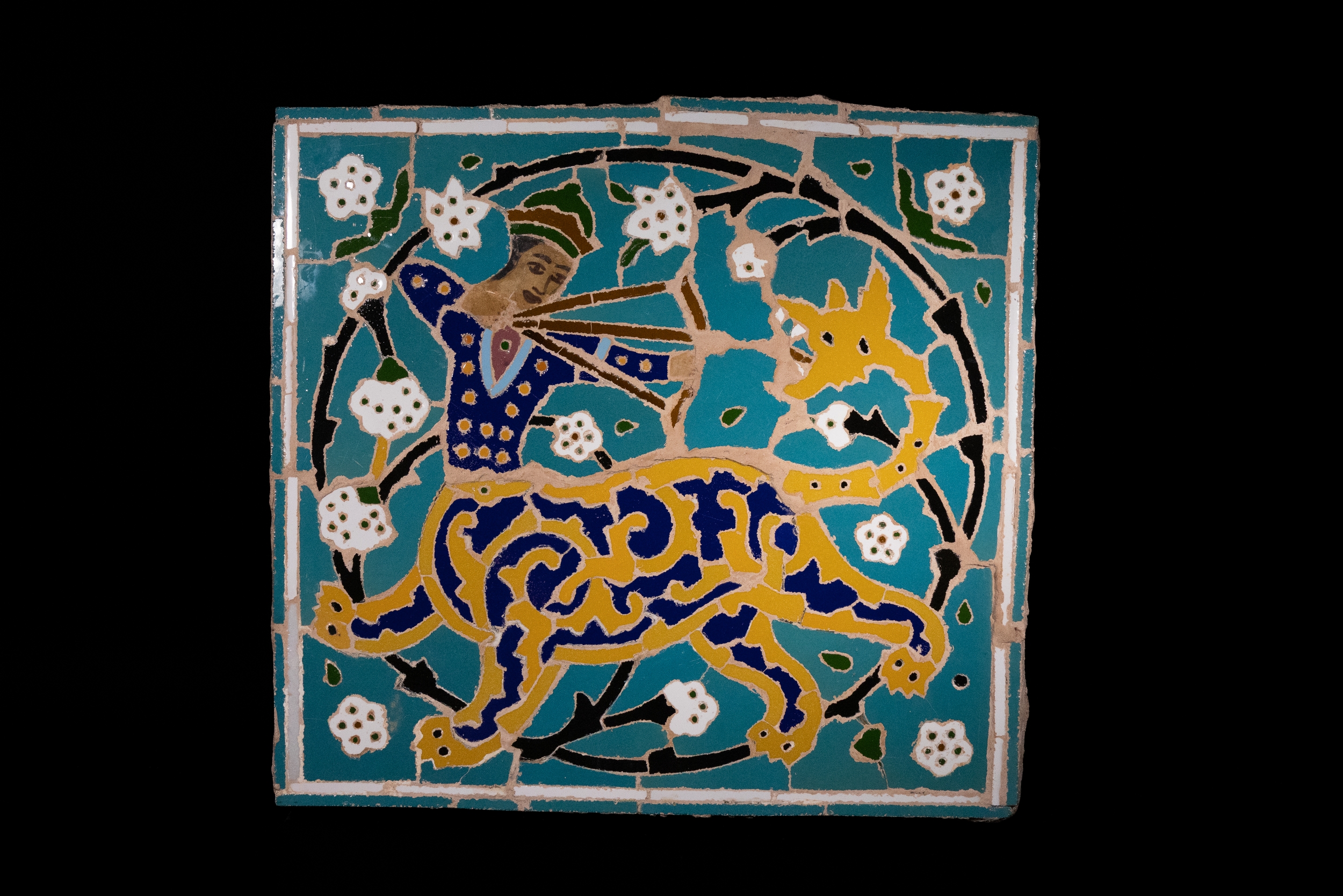 The design features a heroic hunter drawing a bow on the back of a majestic spotted leopard, poised mid-stride within a circular floral frame. The tile is constructed from individually cut and inlaid coloured faience tesserae set into a plaster base, in rich shades of turquoise, cobalt, white, mustard yellow, and black.