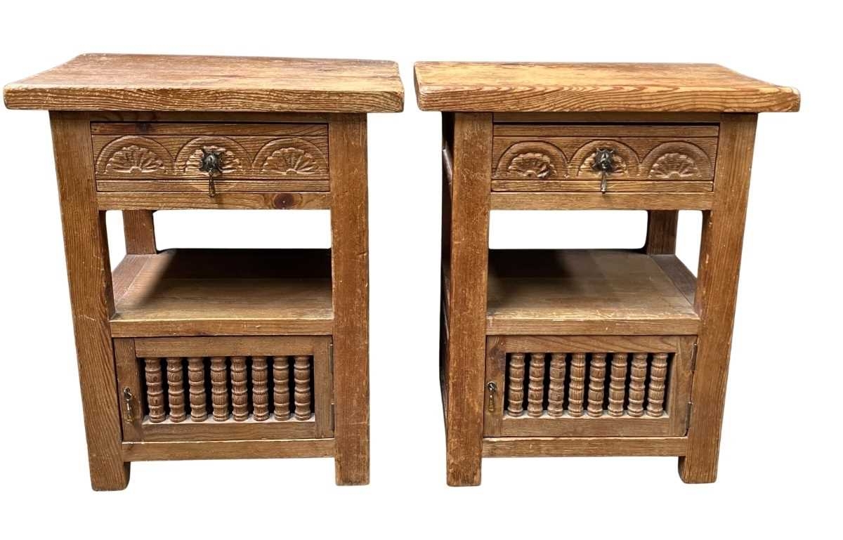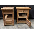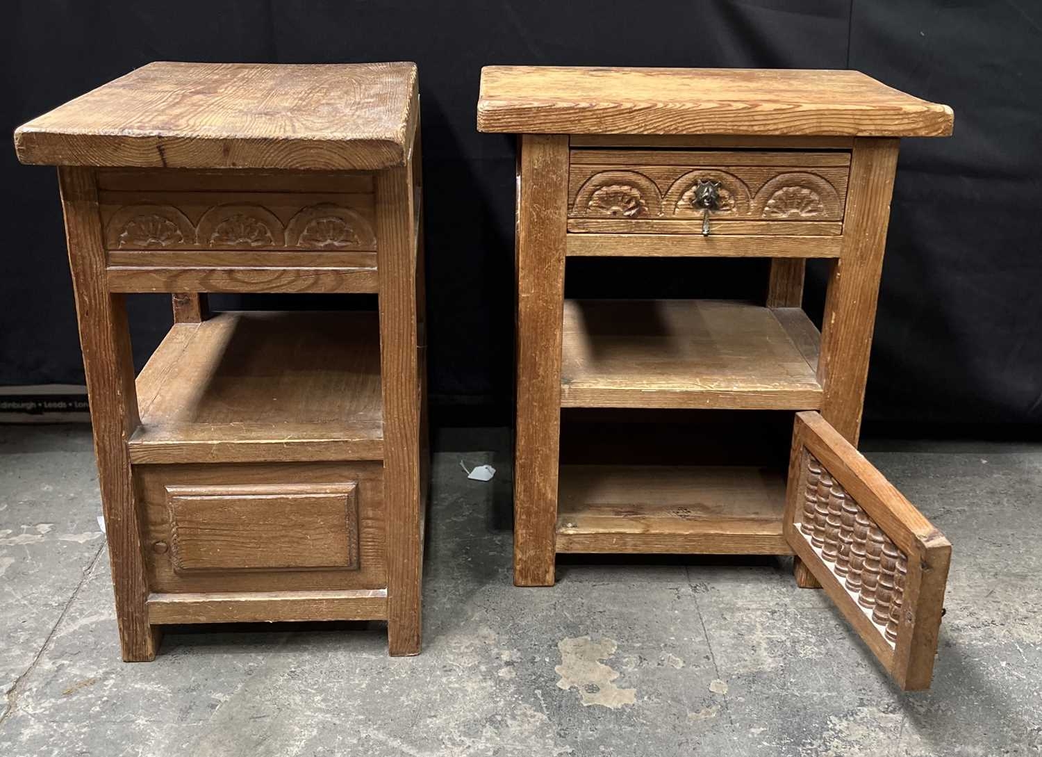 A pair of waxed pine bedside tables, single drawer beneath with metal pull, open undertier above a cupboard with spindle-fronted doors, height 58cm, width 49cm, depth 33cm (2)