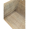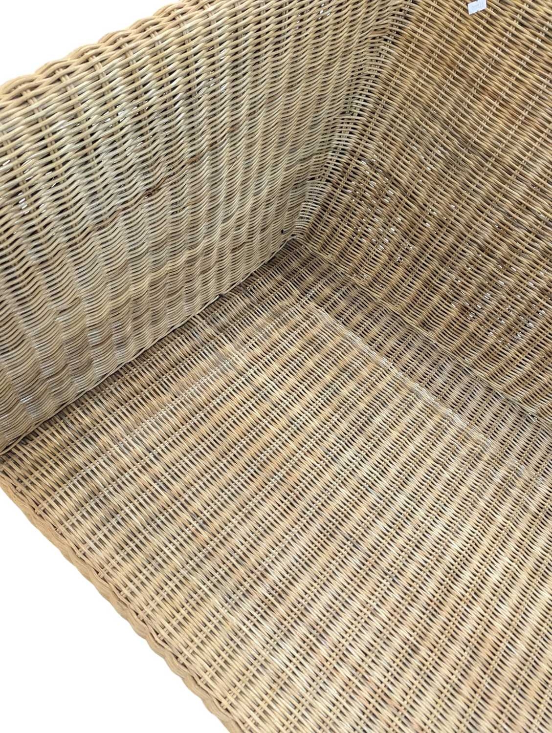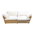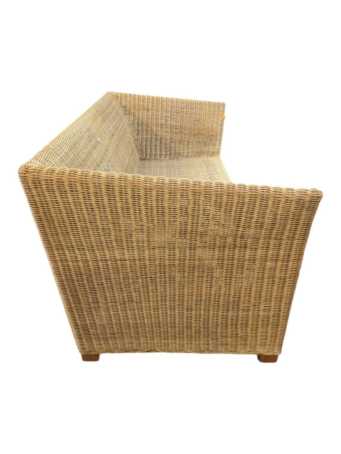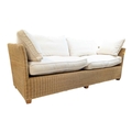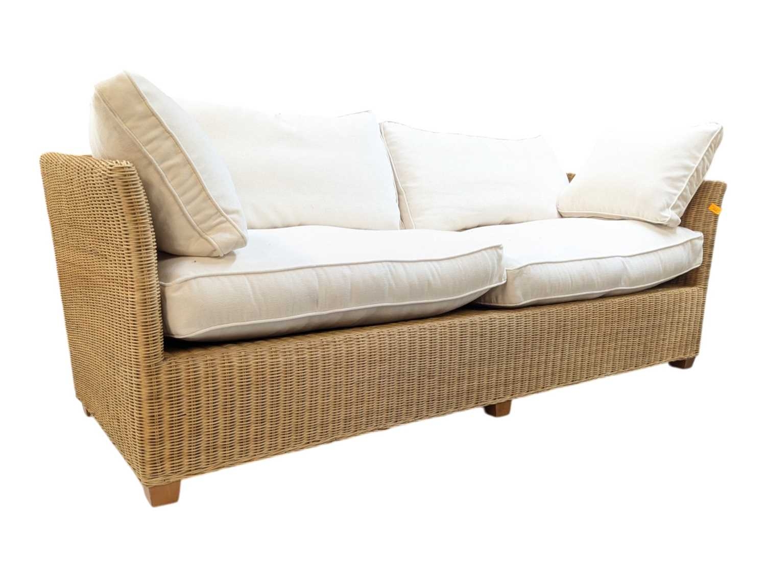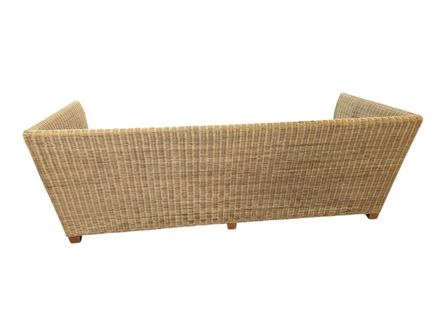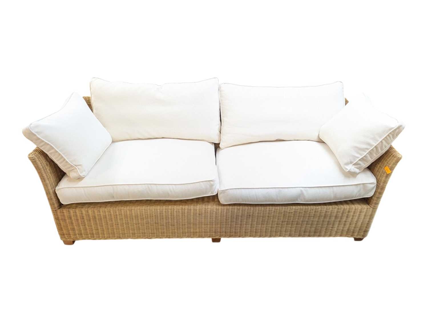 A large contemporary rattan whicker weave conservatory sofa with large squab white cushions. Measures approx: 74x204x86cm