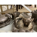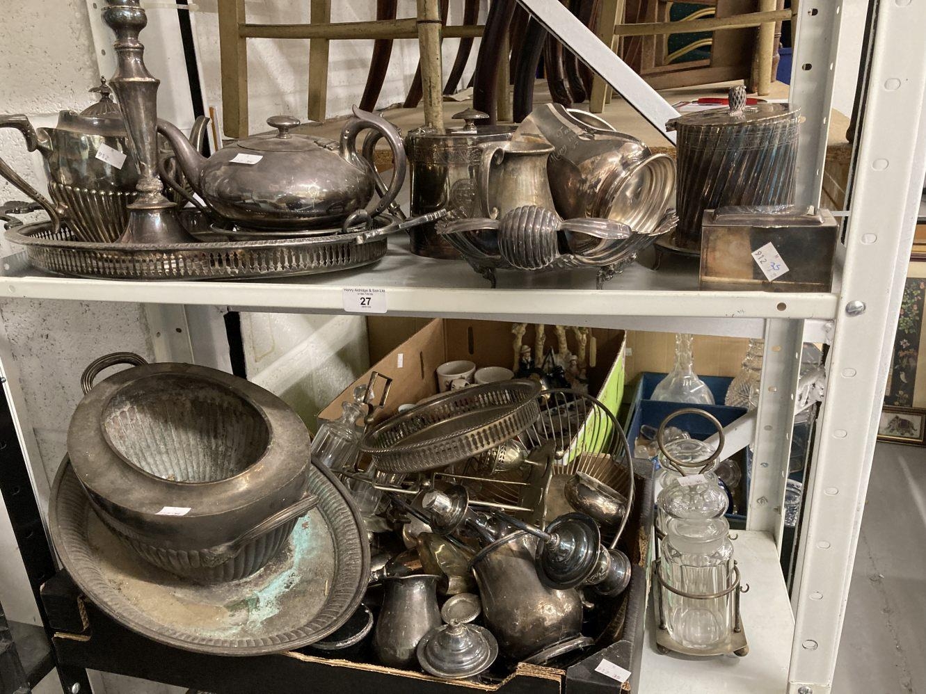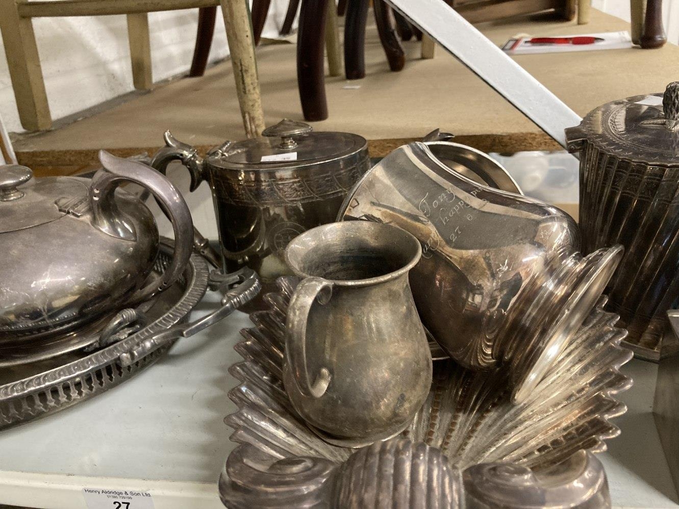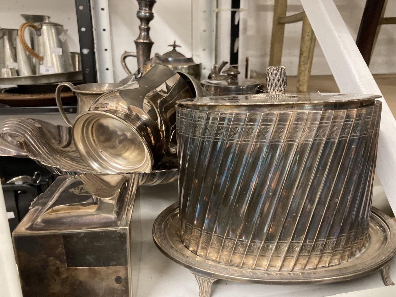 Platedware: Hotel ware a selection of caddies, teapots, tankards, goblets, serving dishes and trays by Walker & Hall, Elkington & Roberts, and Belk. 2 shelves.
