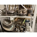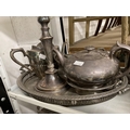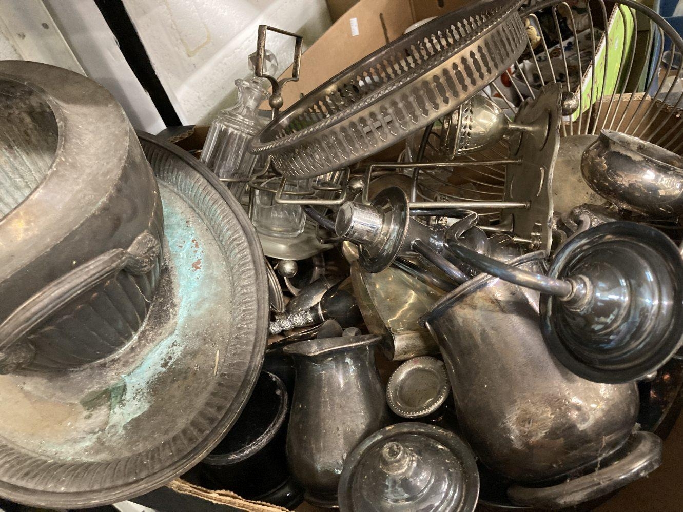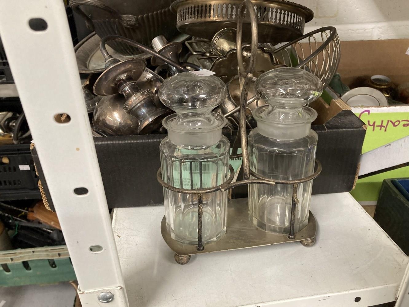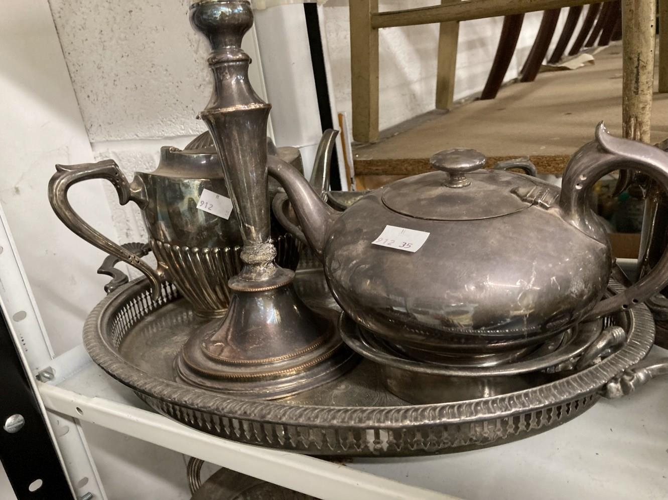 Platedware: Hotel ware a selection of caddies, teapots, tankards, goblets, serving dishes and trays by Walker & Hall, Elkington & Roberts, and Belk. 2 shelves.