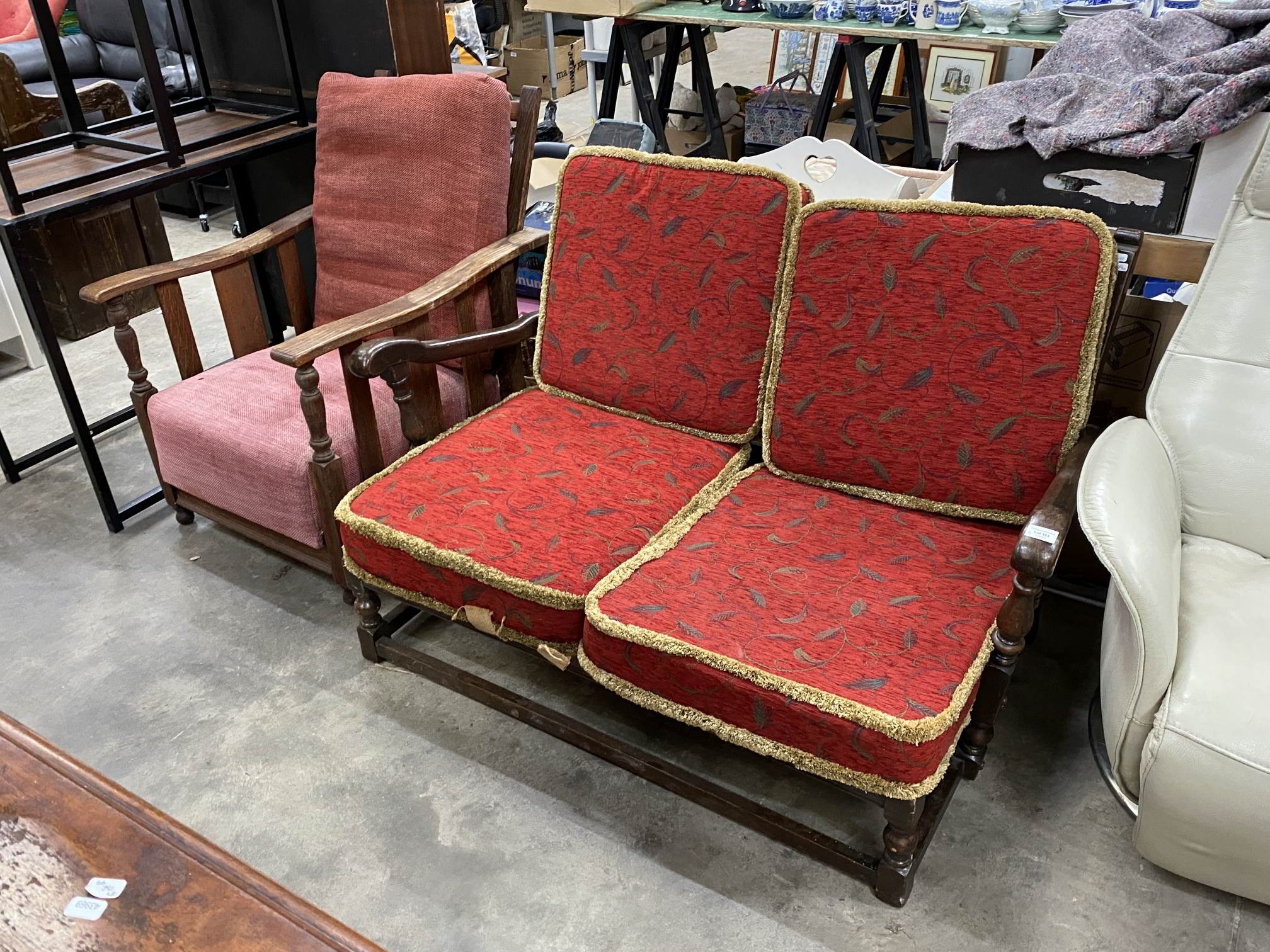 Ercol 'Old Colonial' oak framed settee 78H 130W 90D & an oak framed armchair 91H 67W