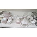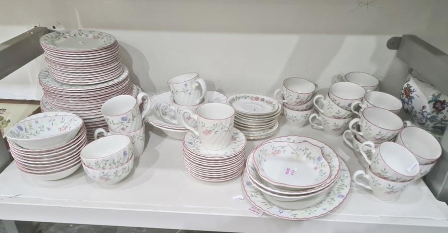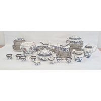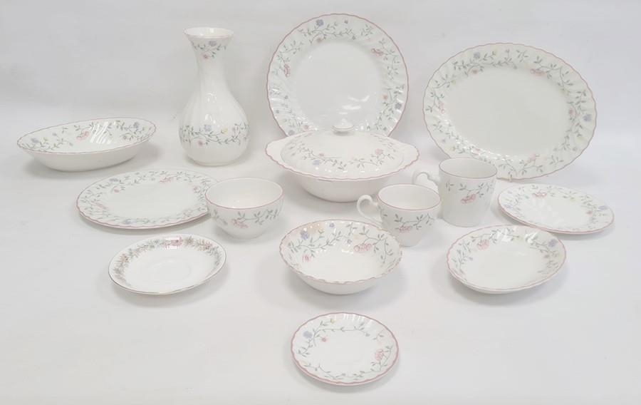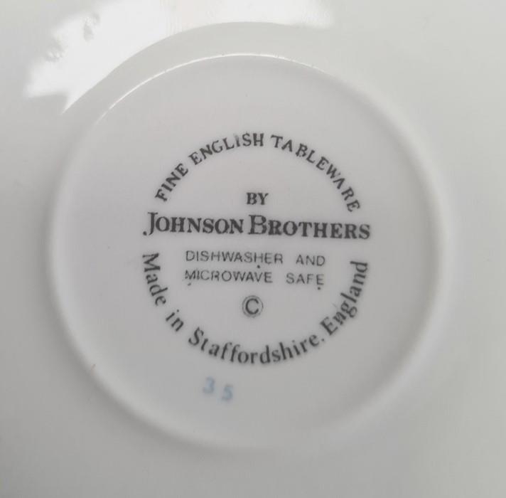 Johnson Brothers part table service in the Summer Chintz pattern designed by Julie Holland including three sizes of plates, vegetable tureen, bowls, vase, mugs, cups and saucers etc.