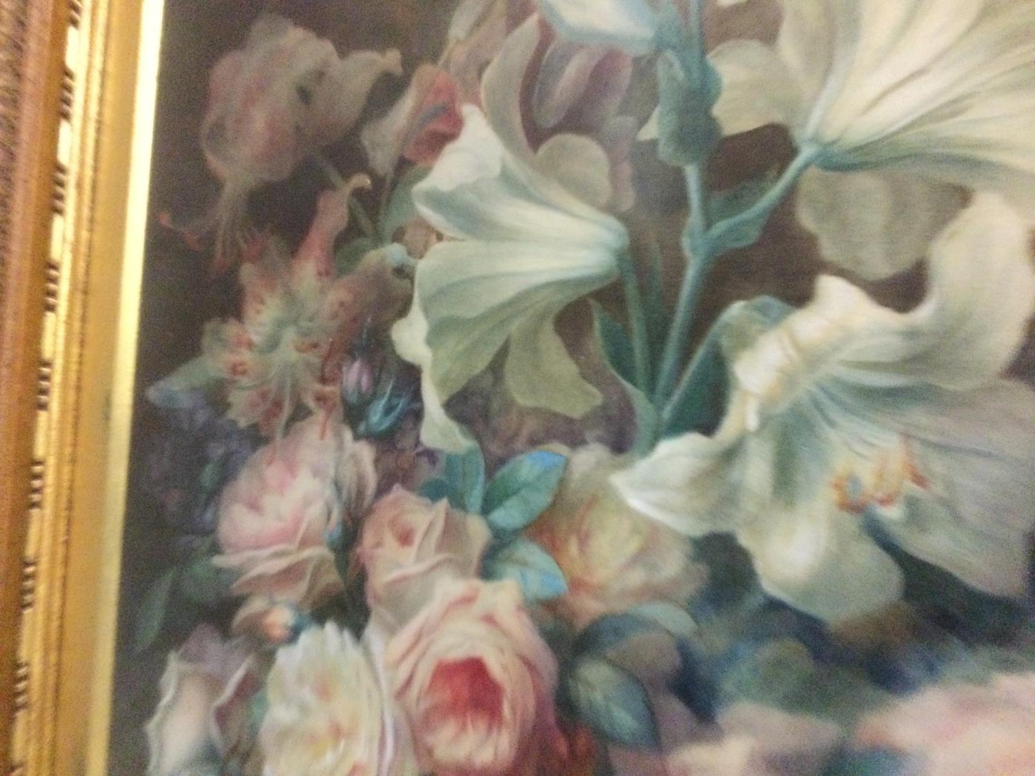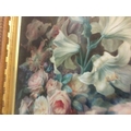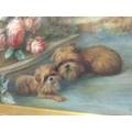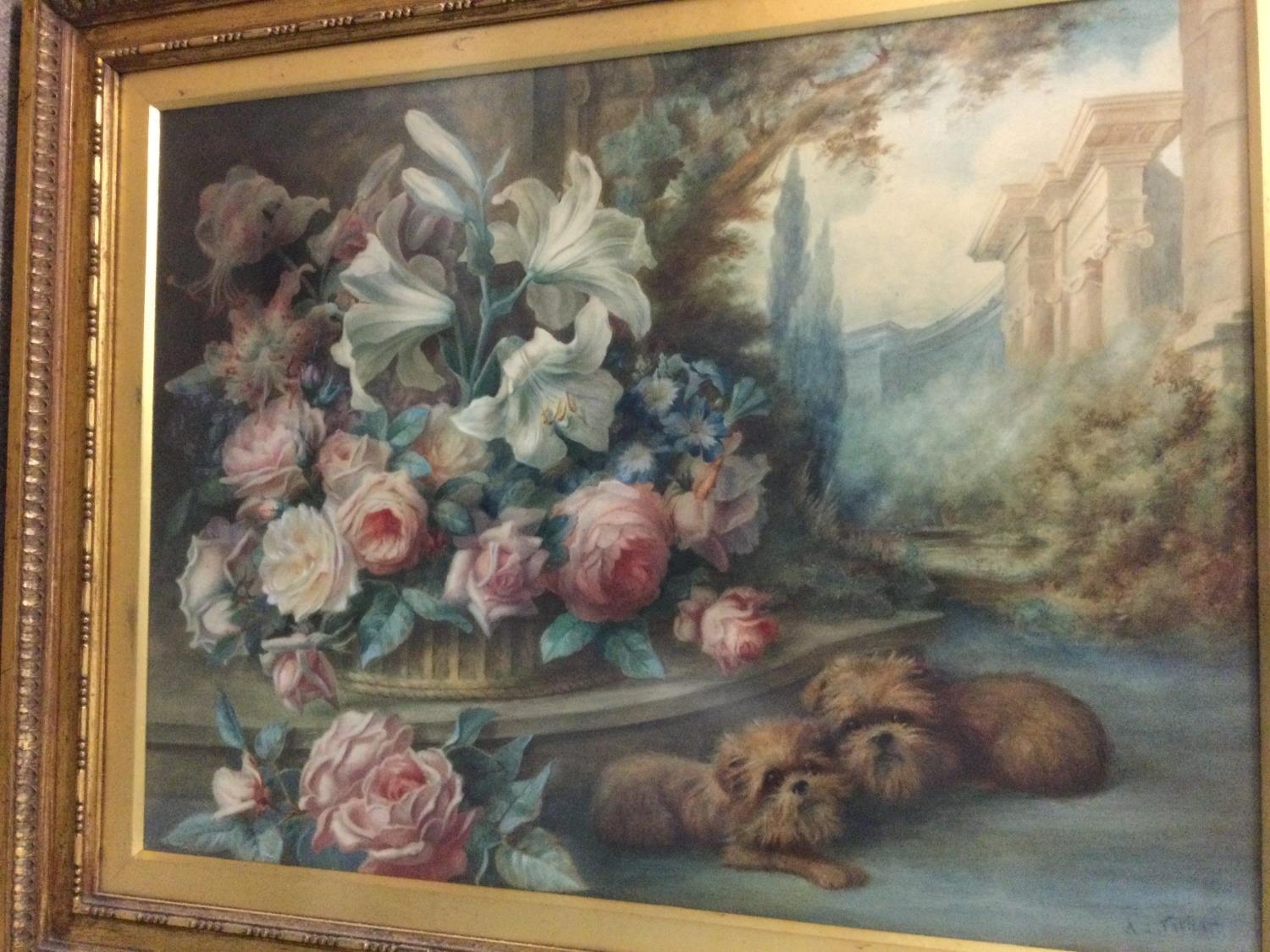 A gilt framed watercolour depicting dogs amongst flowers wit...