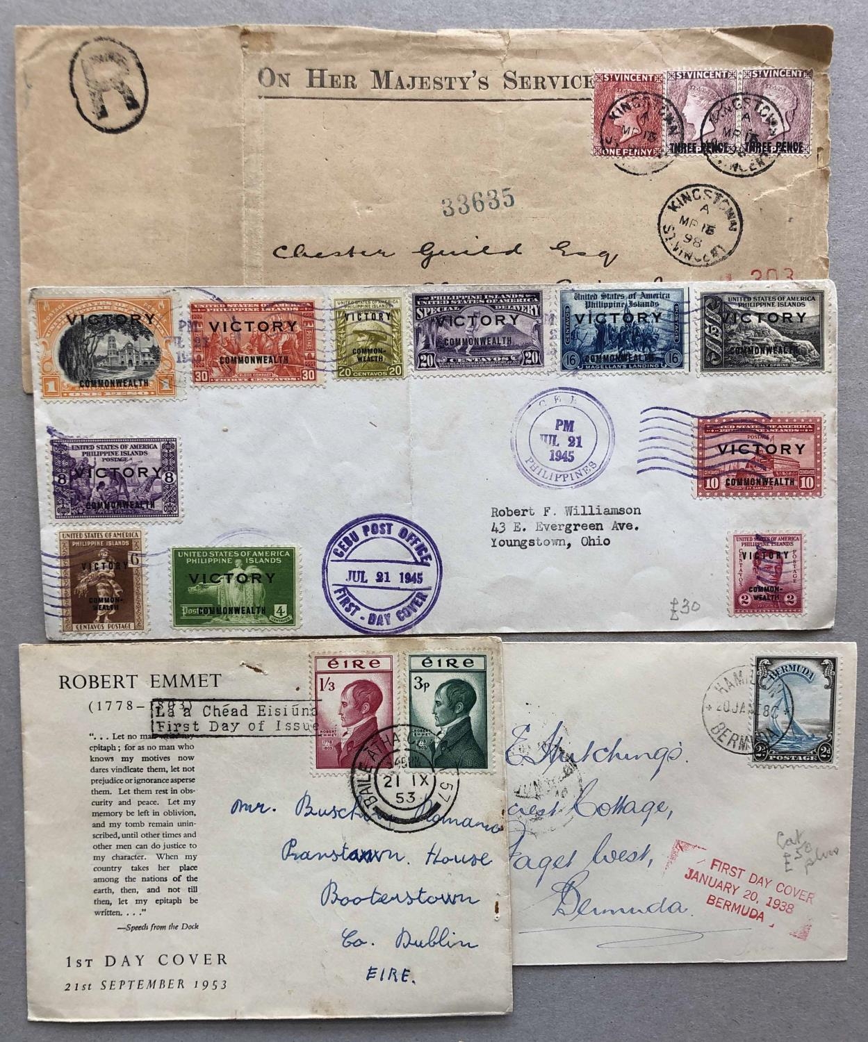 MISCELLANY OF EARLY TO MID-20th C. COMMONWEALTH & SOME FOREIGN COVERS: Group includes several Bermuda KGVI 1938 defin. FDCs, St. Vincent 1898 Regd. env to Boston, Mass., 21 Jul. 1945 env. Philippines to Ohio bearing set of 11 "VICTORY" opts. to 1 peso., Ireland 1953 Emmet FDC, etc. (c.30 items)