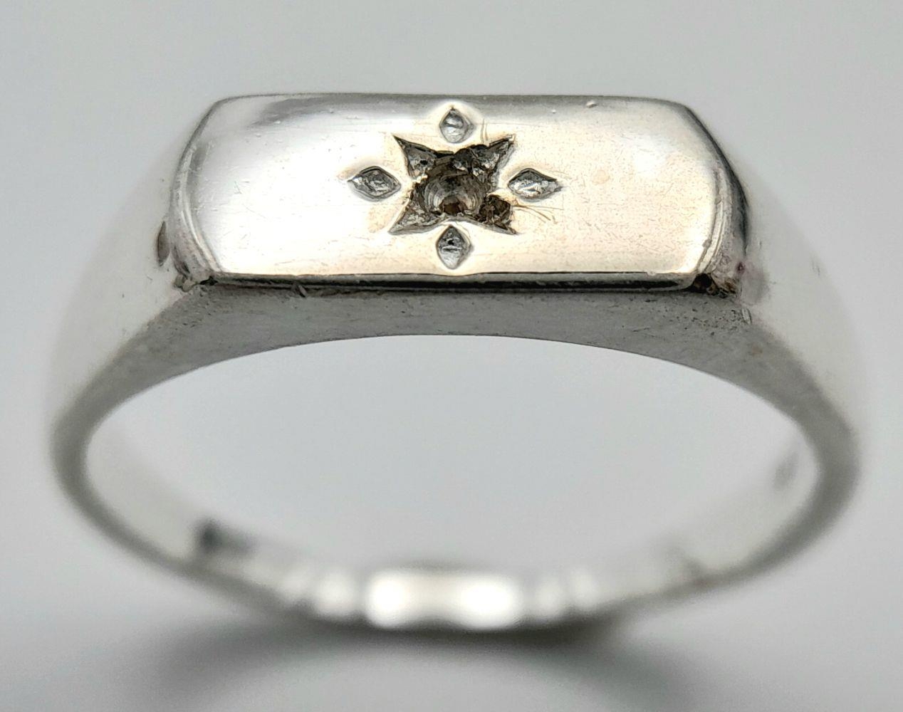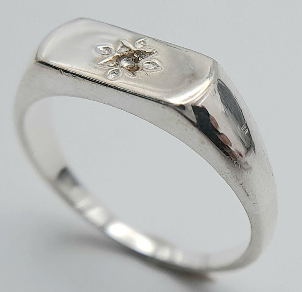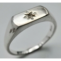 A Sterling Siver Diamond Set Signet Ring Size N1/2. The Crown Measures 1.1 x 6mm. Set with a central set Diamond. The Ring weighs 3.56 Grams.