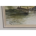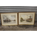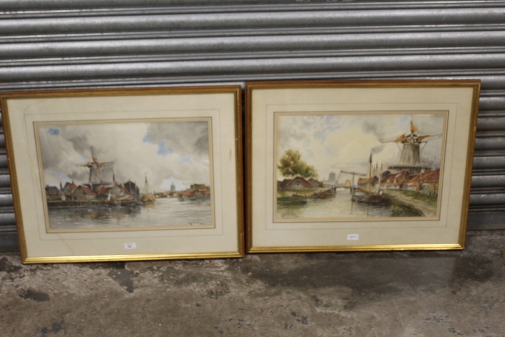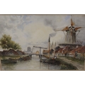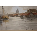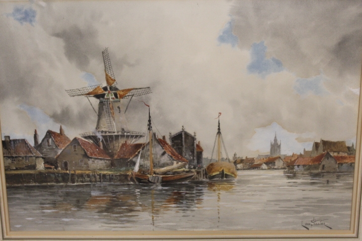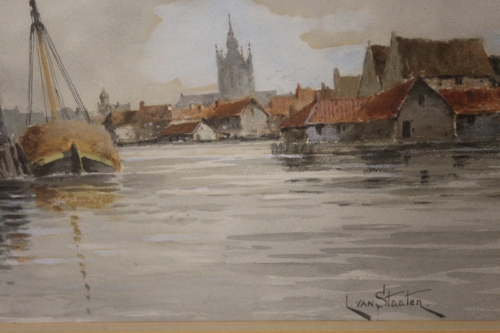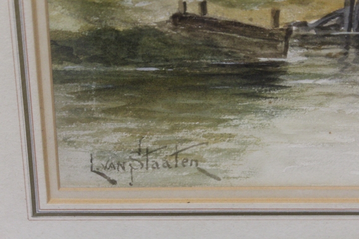 LOUIS VAN STAATEN (XIX-XX). Dutch school, a pair of Dutch river scenes with towns, figures and boats, signed lower left, and lower right, watercolours, framed and glazed, 36 x 54 cm
