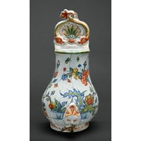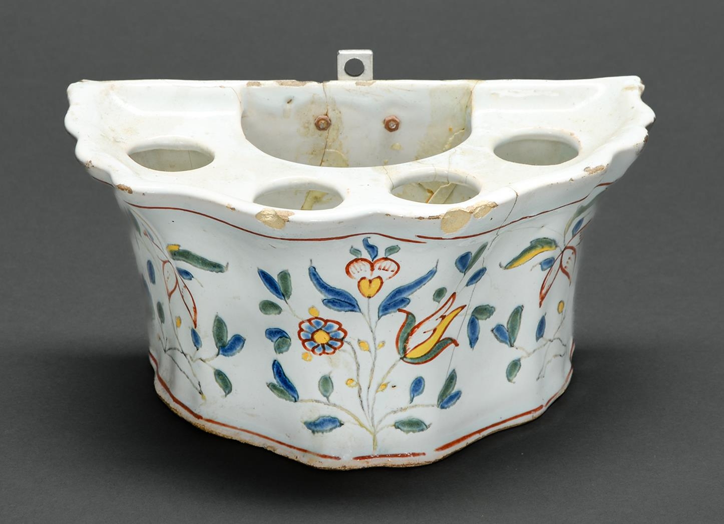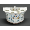 A French polychrome faience bough pot, late 18th c, painted in a naïve hand with flowers, 20cm l
