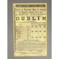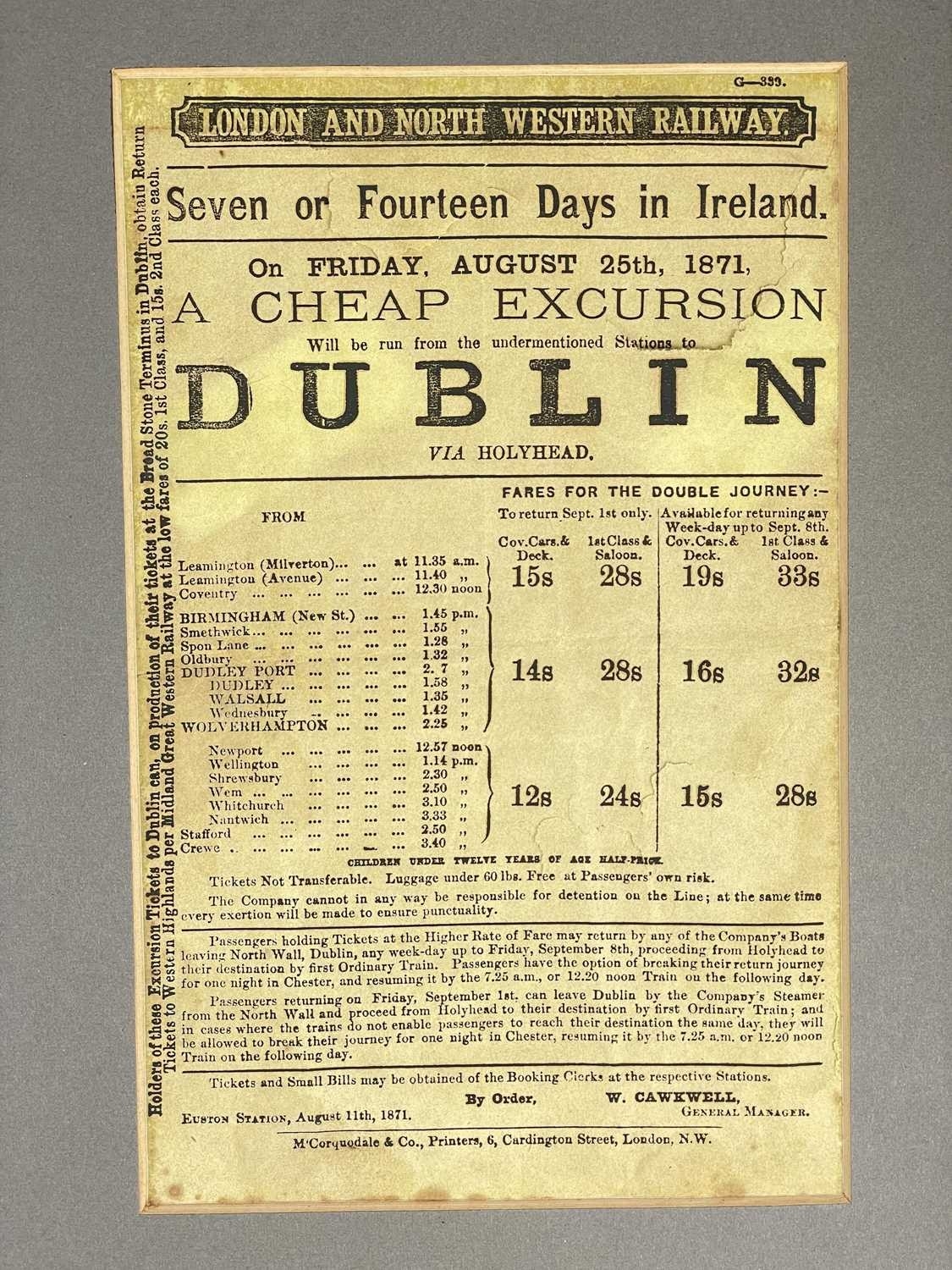 (Ephemera) 'Seven or Fourteen Days in Ireland. On Friday, August 25th, 1871, A Cheap Excursion....Dublin via Holyhead,' one leaf printed to recto, thin yellow paper stock, taped to mount, large tear through middle, 21,5cm x 13.5cm, London and North Western Railway, M'Corqudale & Co, London, [c/1871]; With a collection of book plates, some being hand-coloured and three facsimile 'The Times'.