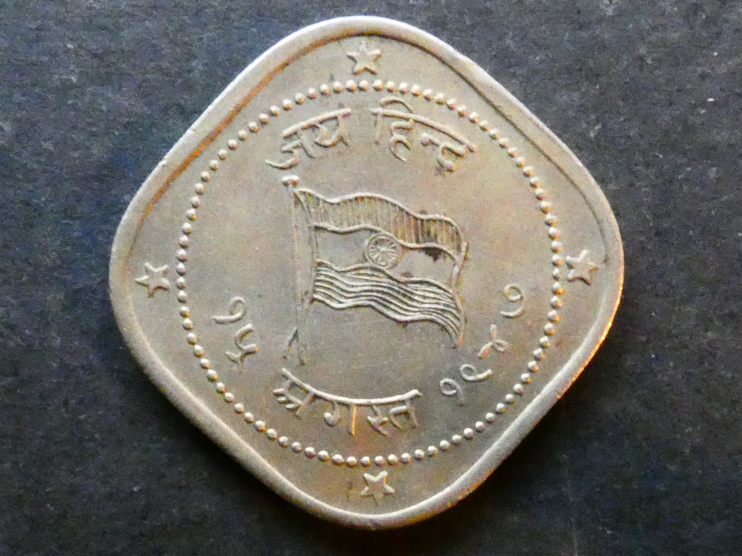 COIN. India, Republic, (2 Annas), ND, circa 1947, Independence commemorative, obverse; "Azad Hind 15th August 1947" in Nagari, around a map of India, reverse; "Jai Hind 15th August 1947" in Nagari, around the Indian national flag, medallic issue, struck on currency 2 Annas flan, KM-X104, VF+