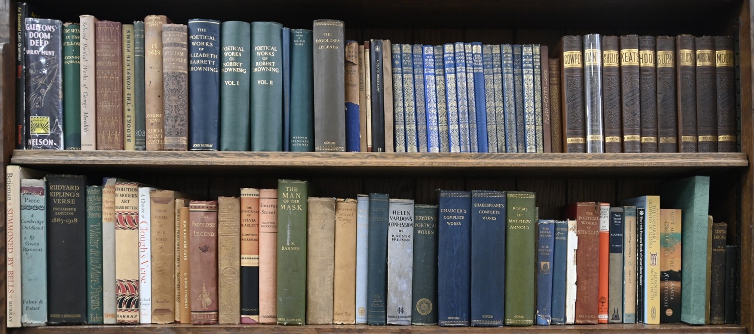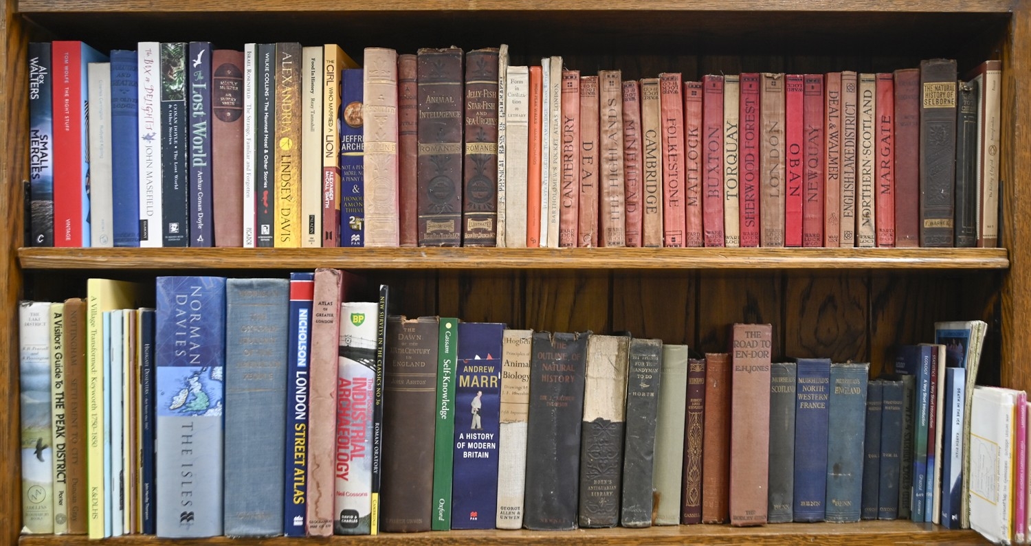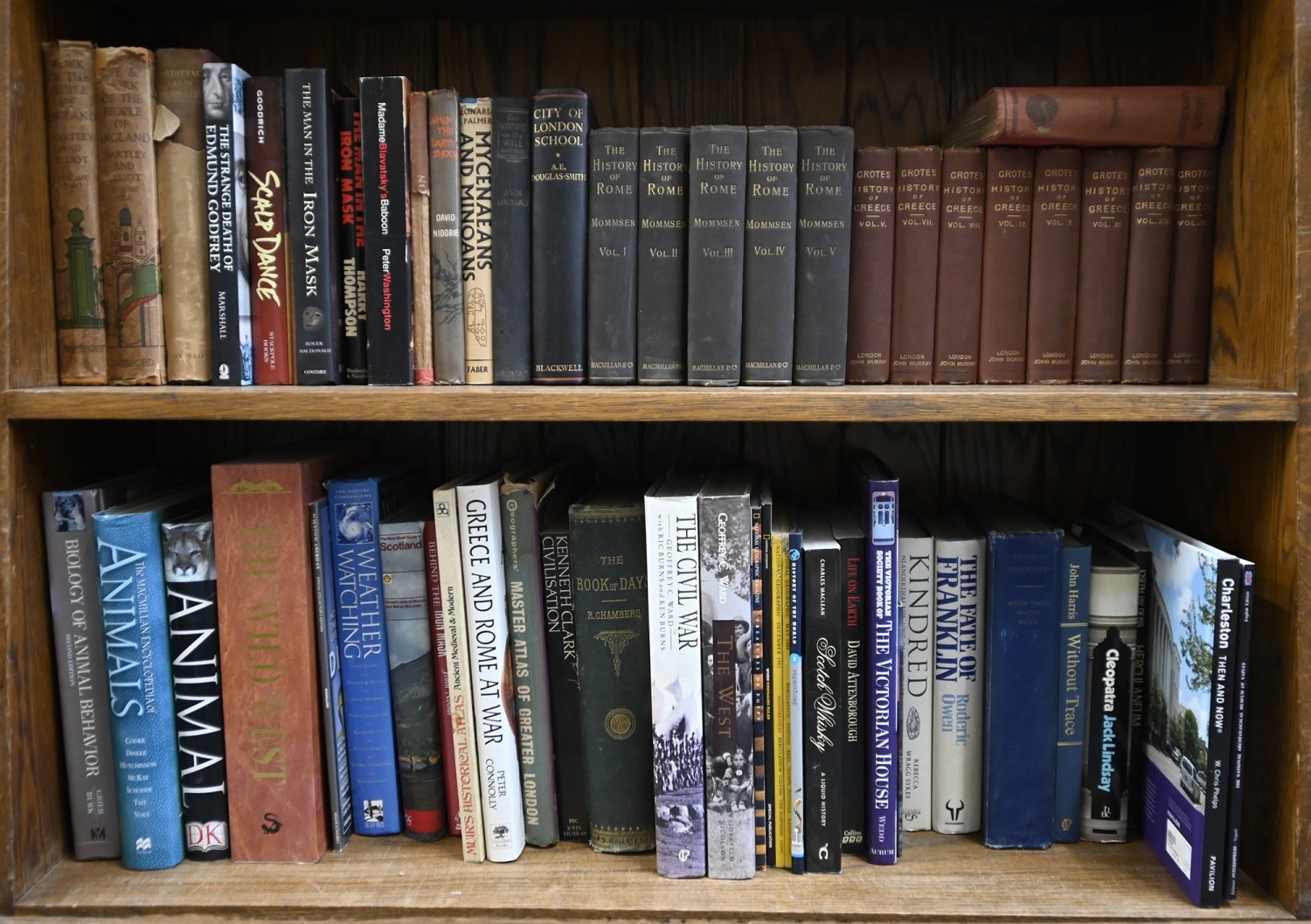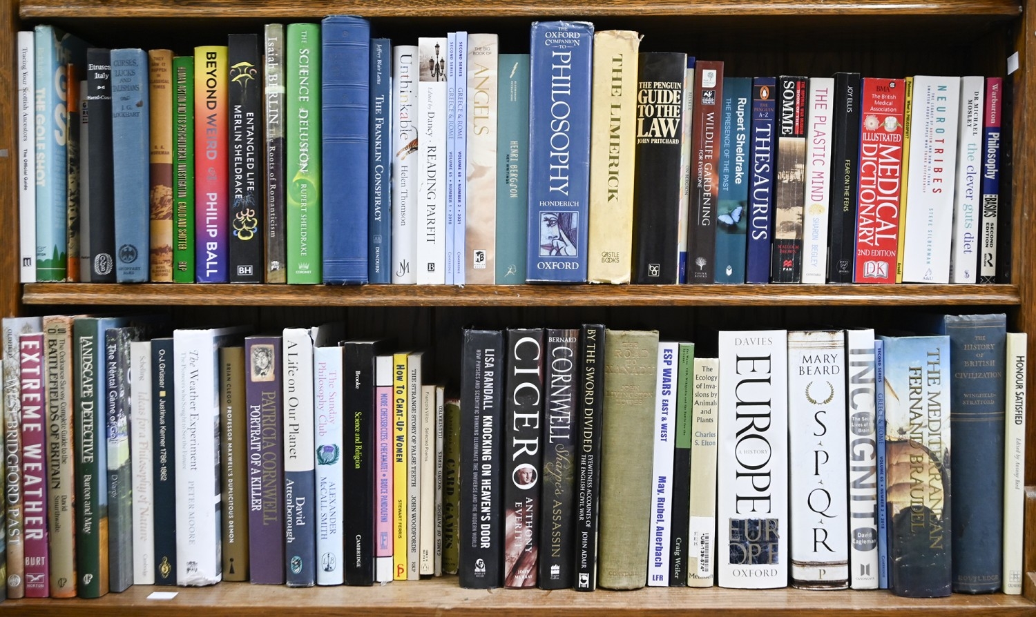 Books. Twelve shelves of general and academic stock, late 19th c and later, including ancient and later history and literature, some natural history and further science, travel, crime, etc., mostly hardback, mixed sizes