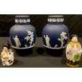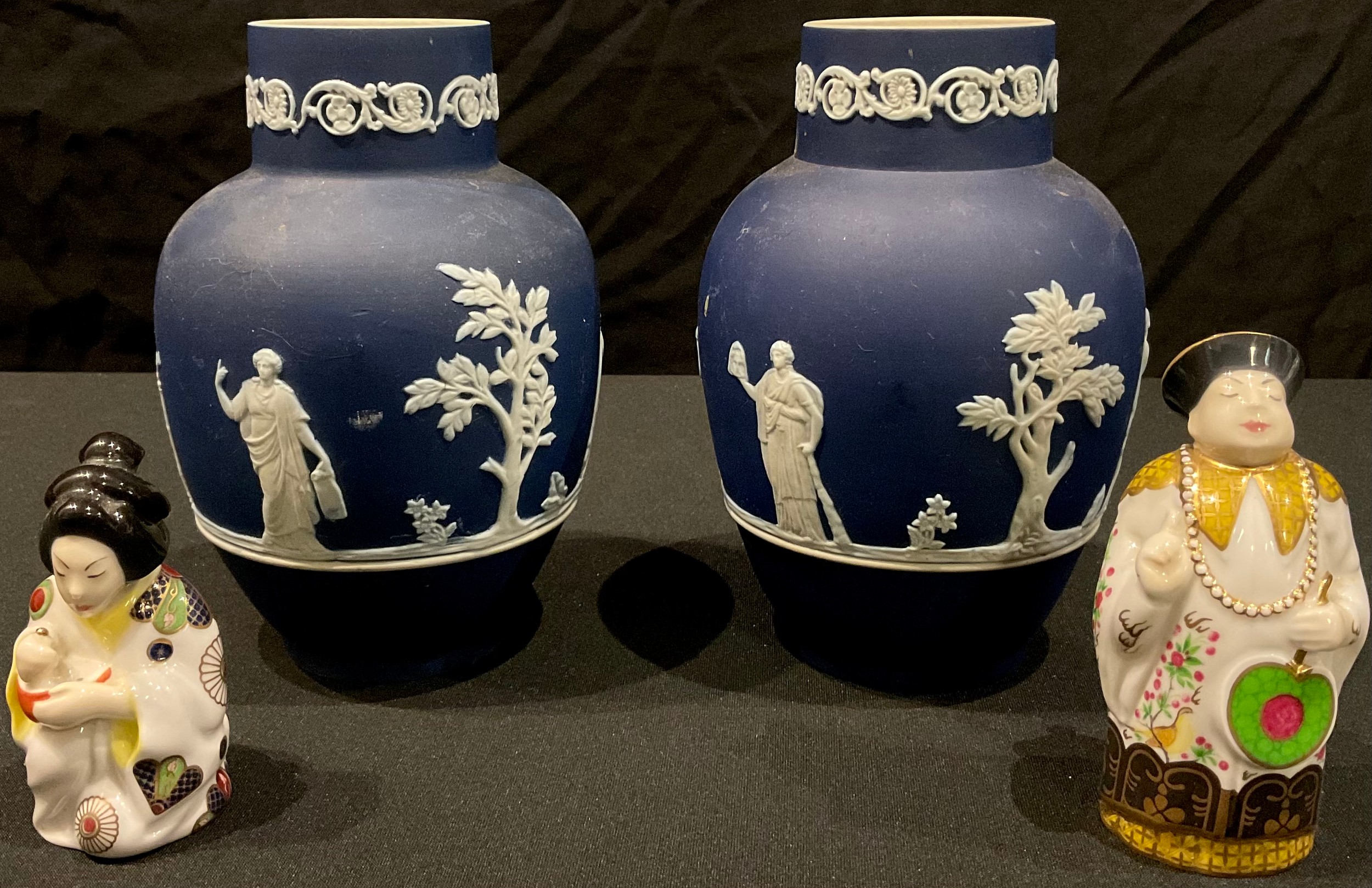 A Royal Worcester The Connoisseur Collection candle snuffer, Japanese Girl, 8cm, printed mark; another Mandarin, 10cm, printed mark; a pair of late 19th century Adams Tunstall ovoid Jasperware type vases, sprigged with classical figures in a landscape, 15cm, impressed marks, c.1890
