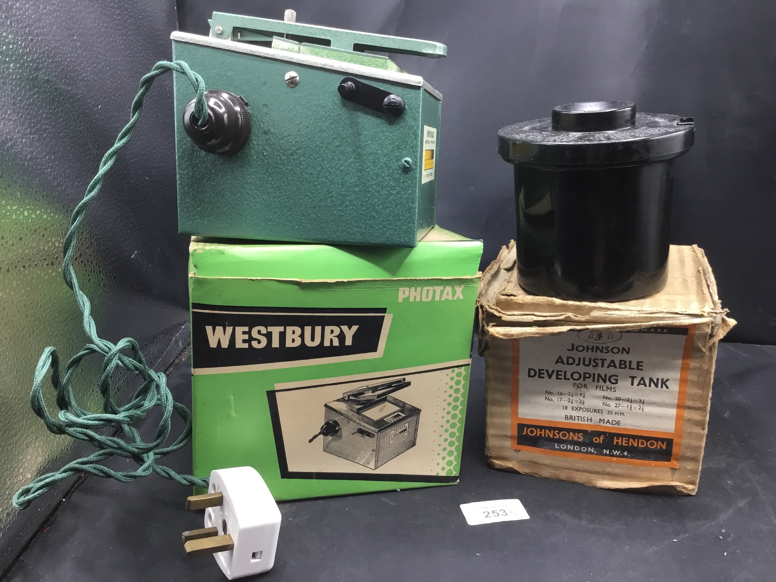 Boxed Vintage Westbury Photax Contact Printer With Exposure Control and a Boxed Vintage Johnson Developing Tank