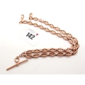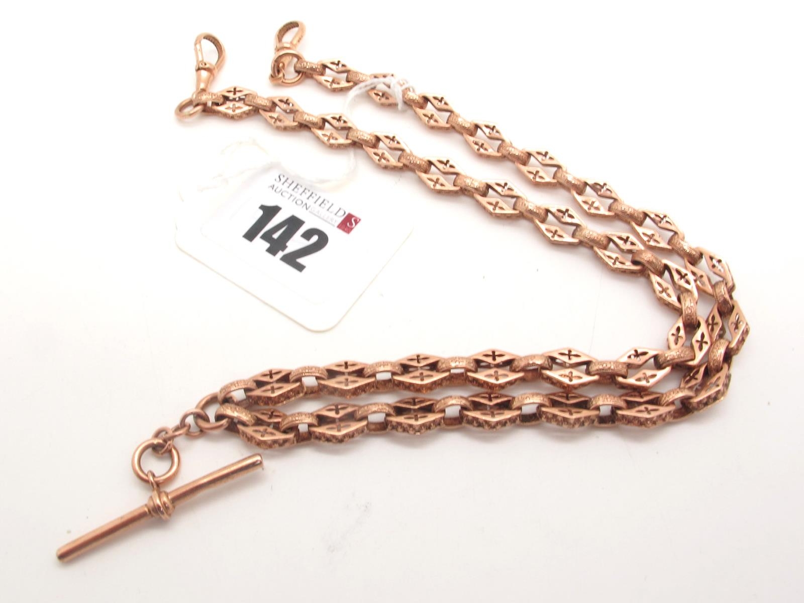 A 9ct Rose Gold Fancy Link Double Albert Chain, of textured and pierced design, to double swivel style clasps, suspending a T-bar, overall length approximately 46.5cm (overall weight 30grams).