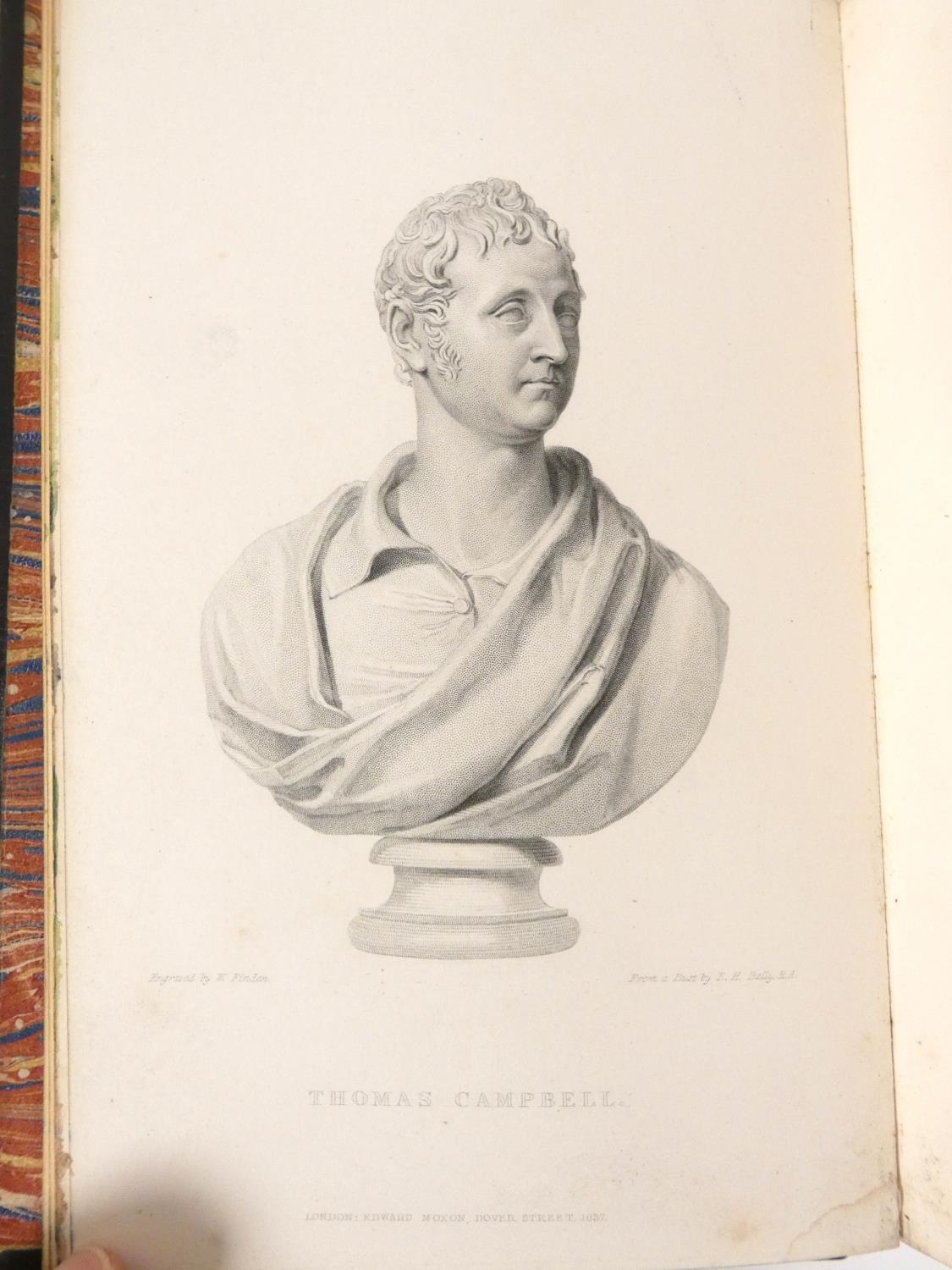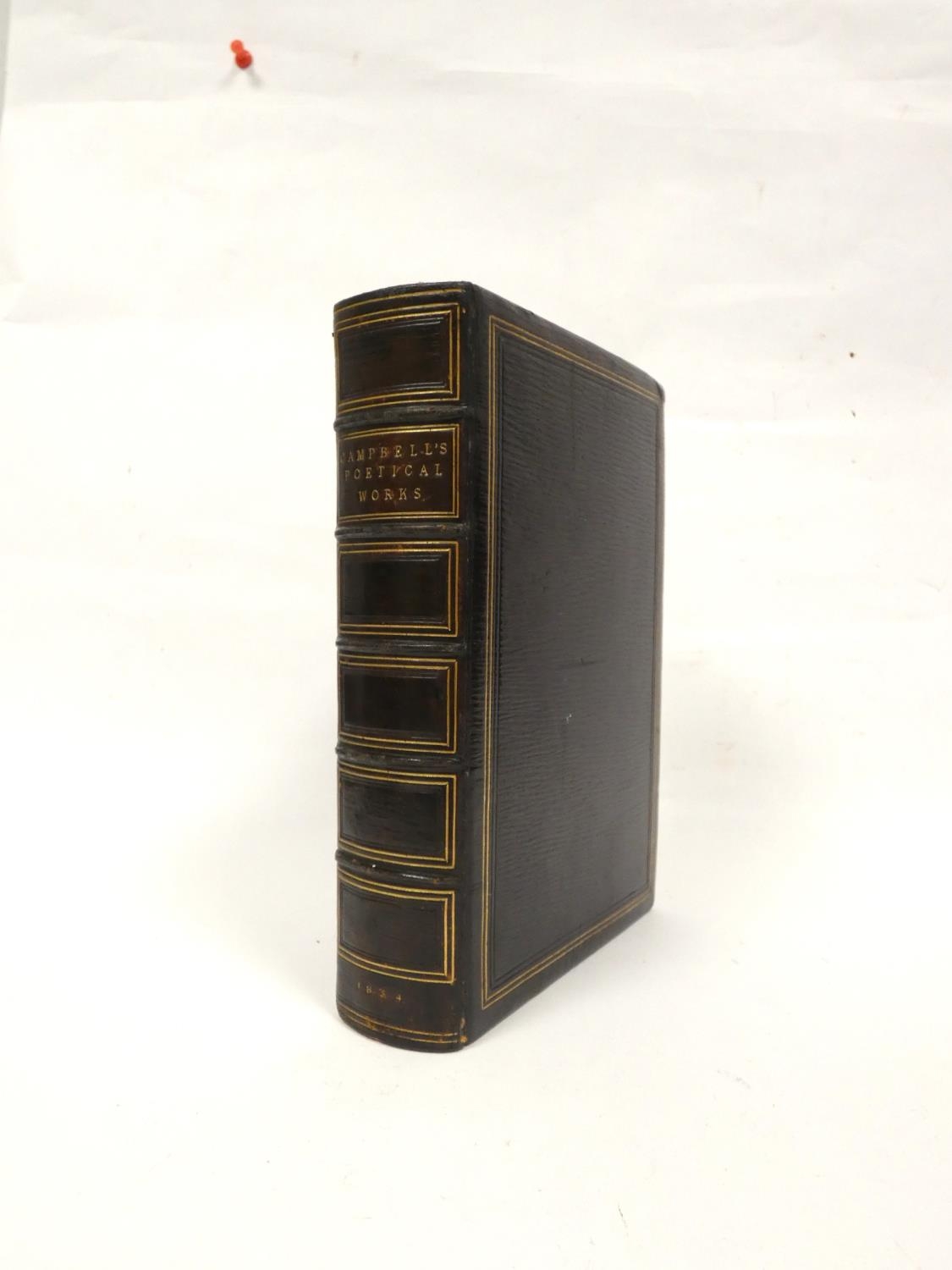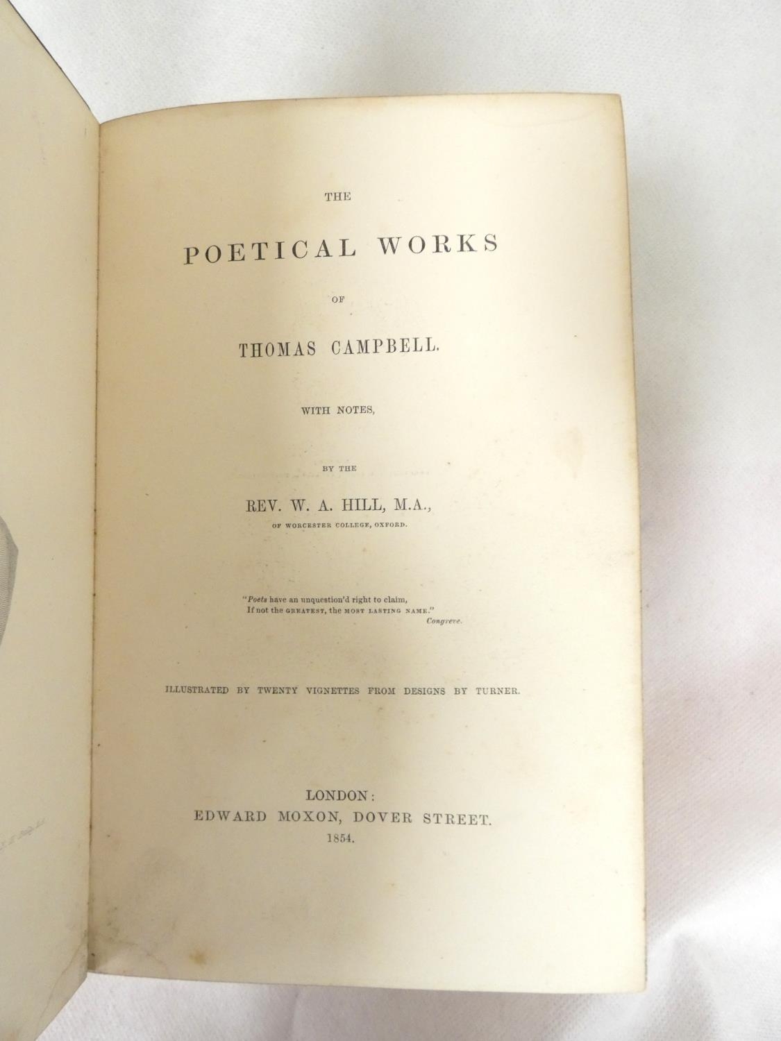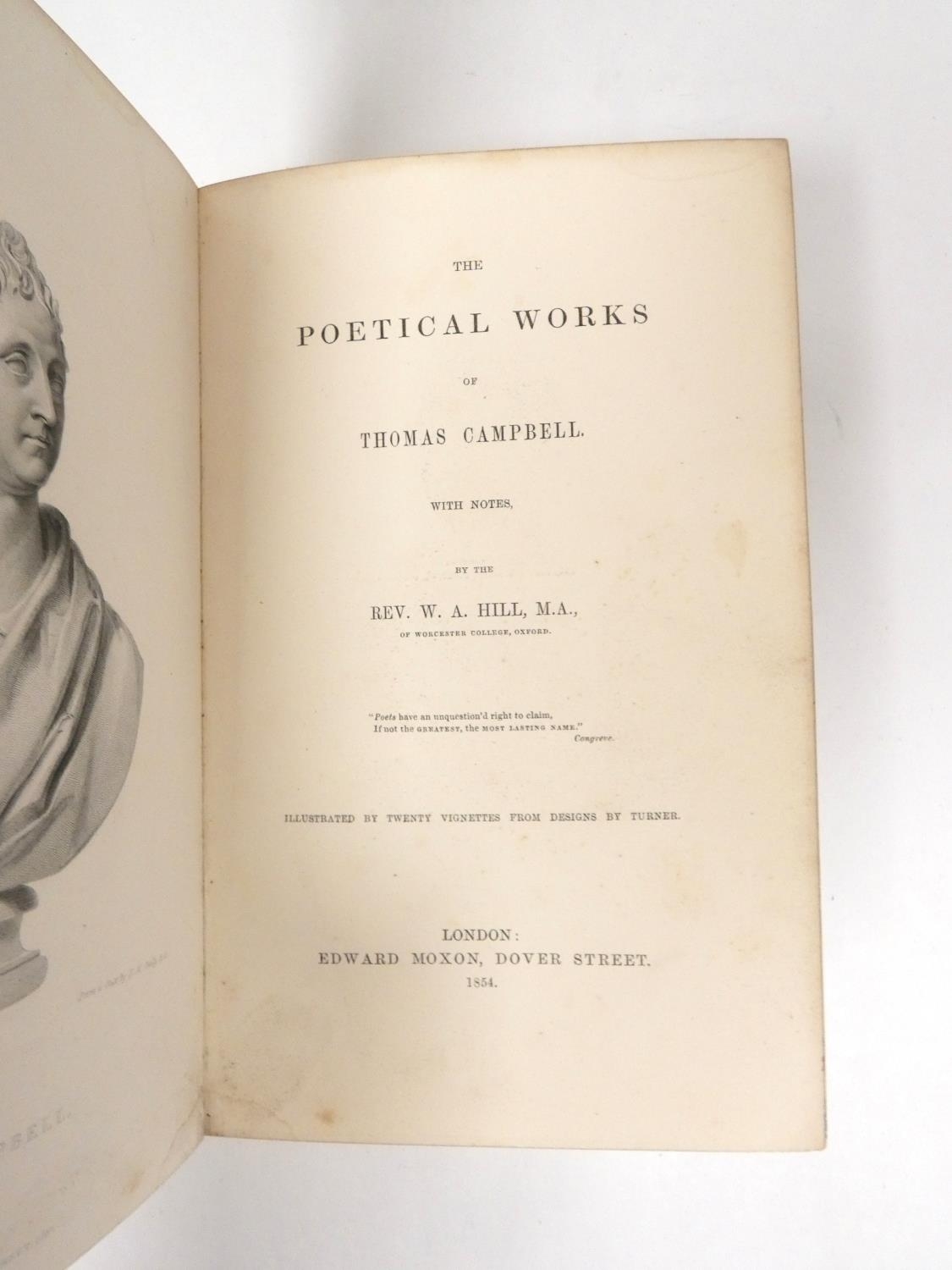 FORE-EDGE PAINTING. Campbell Thomas. The Poetical Works. Eng. frontis. & text vignettes. Nice dark morocco, marbled endpapers, a.e.g. with a good fore-edge painting of Linlithgow Palace, figures in the foreground. Edward Moxon, 1854.