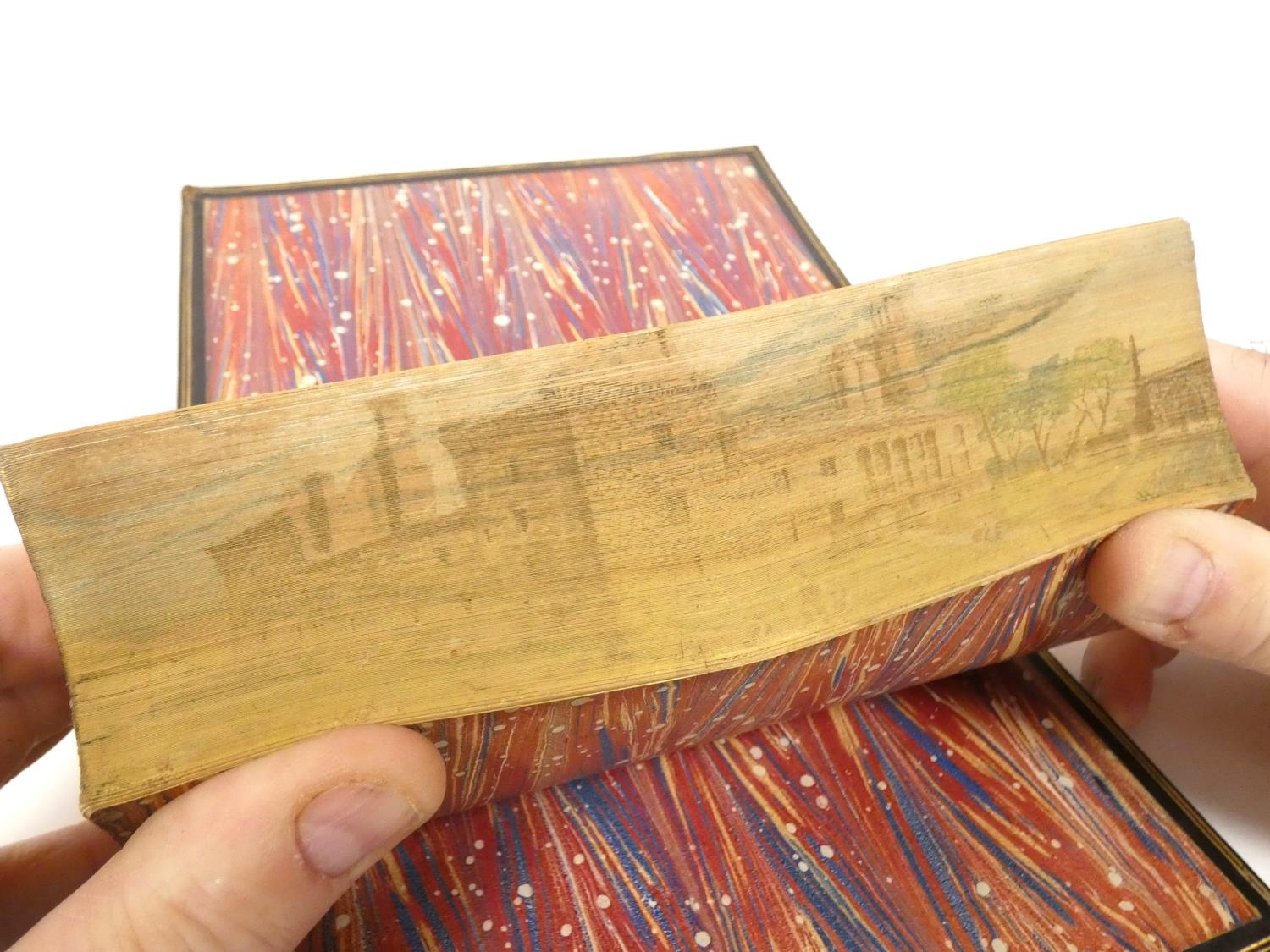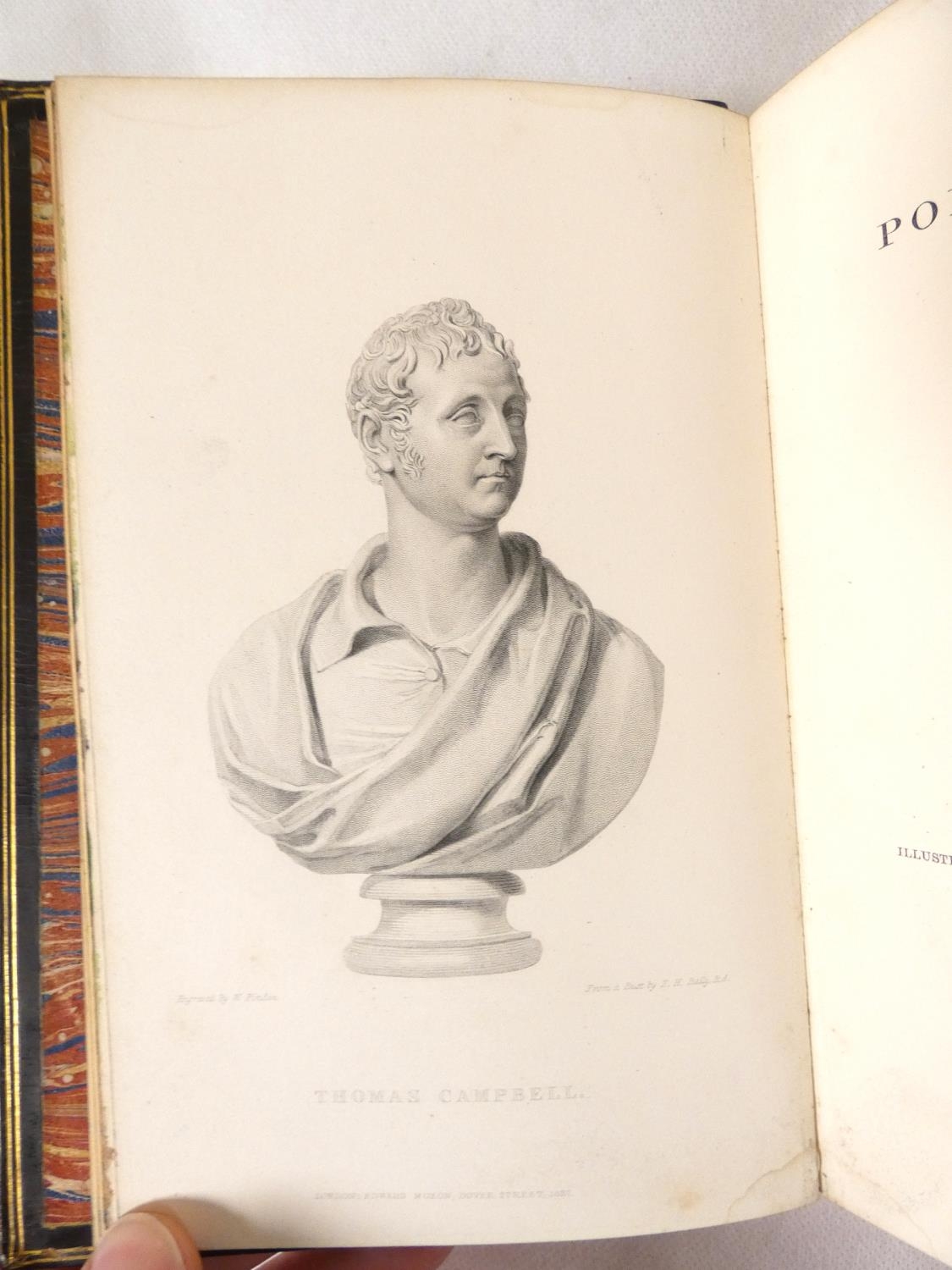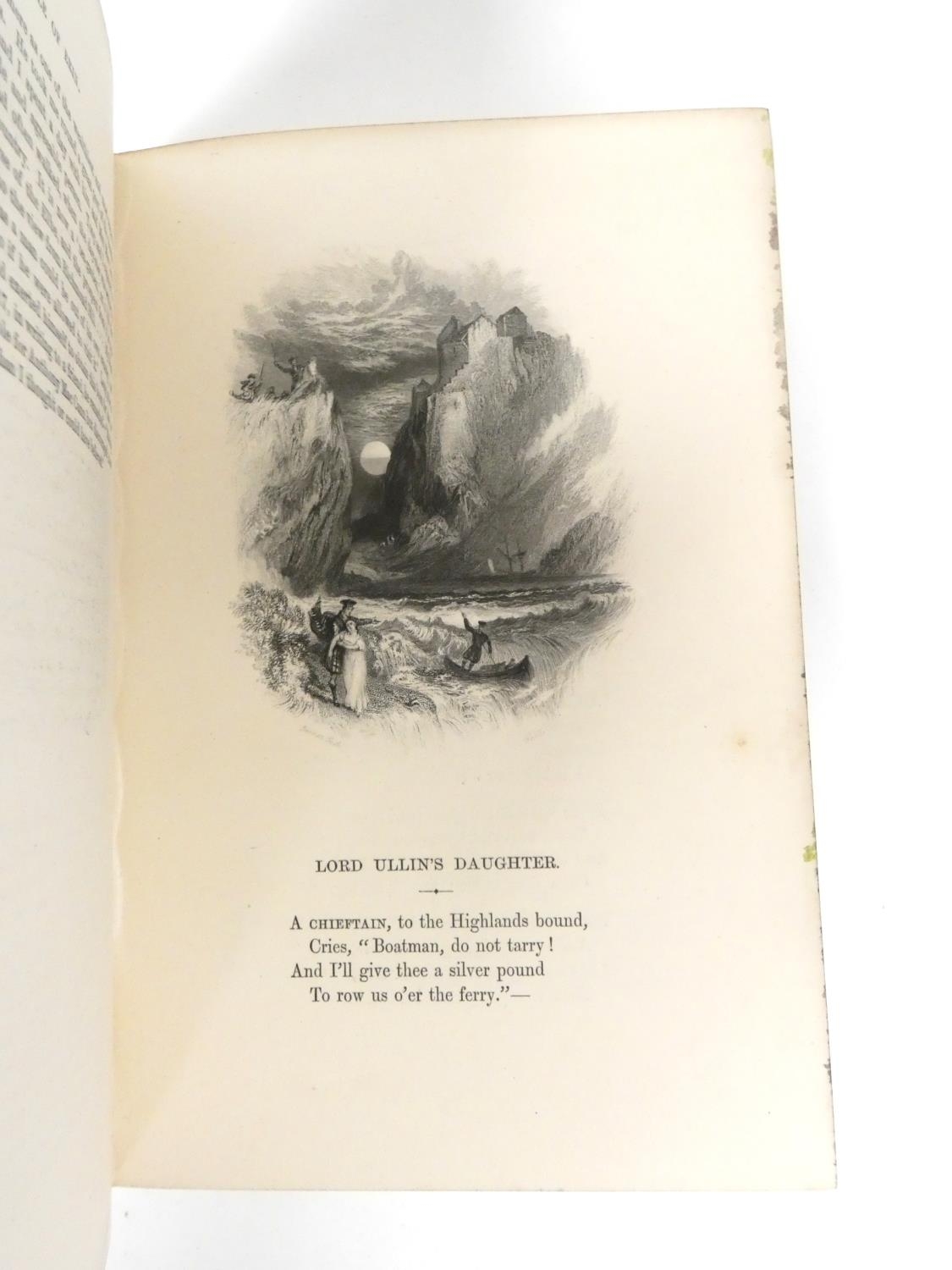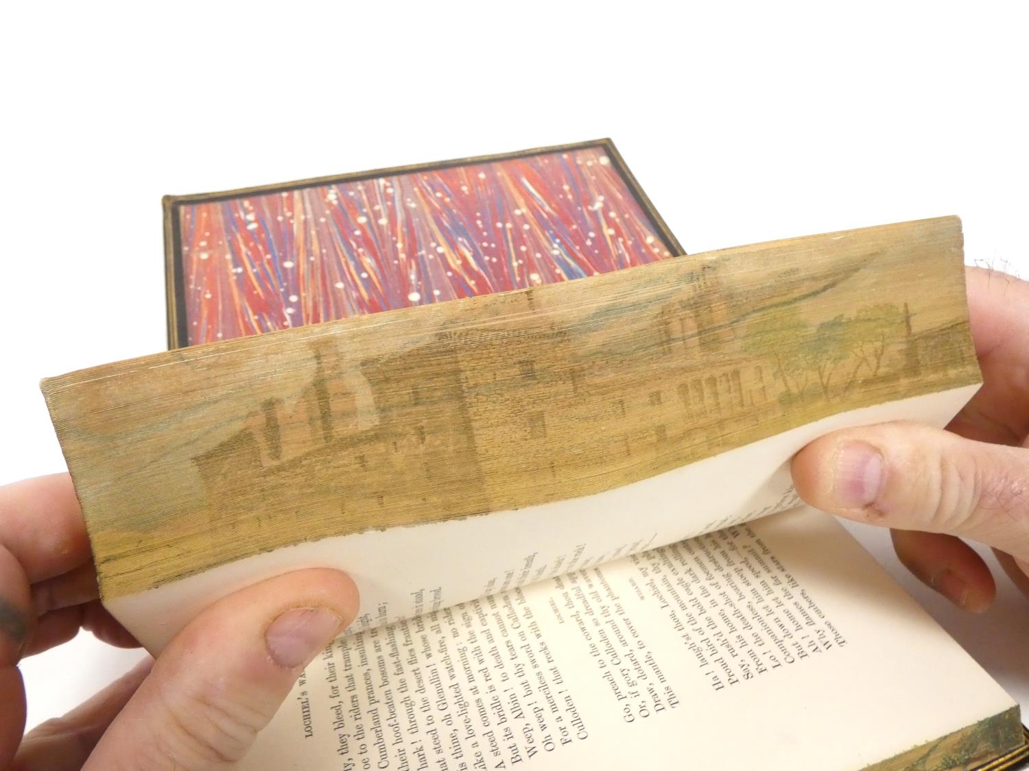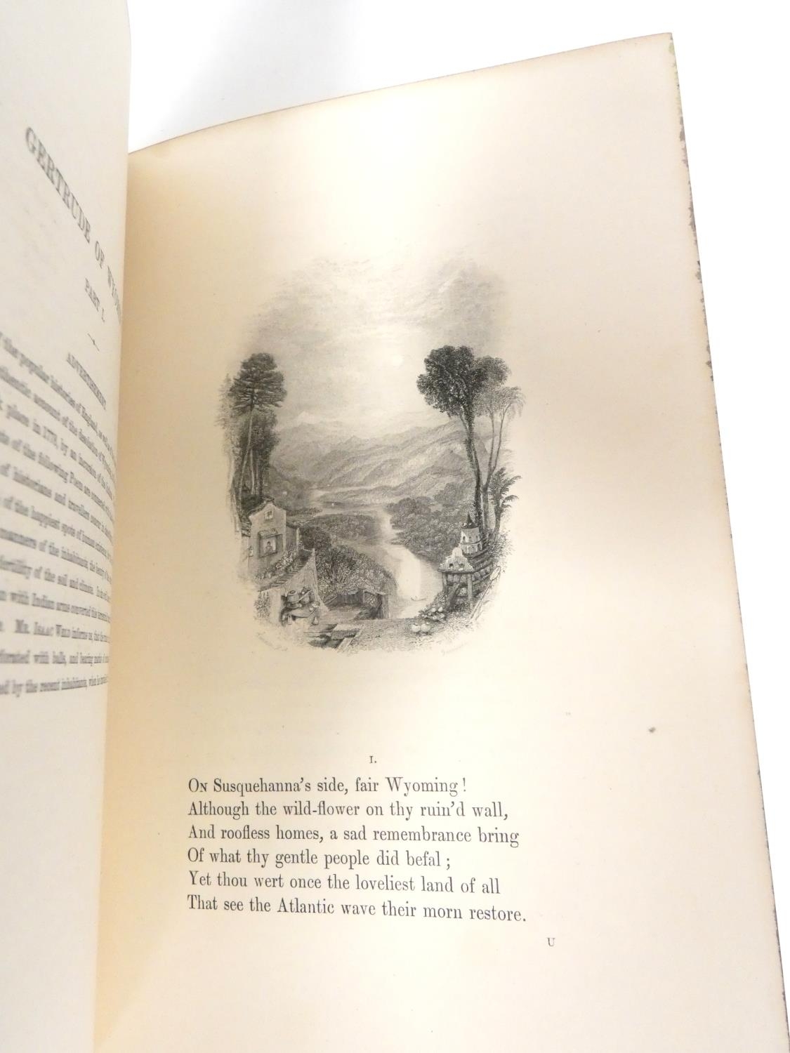 FORE-EDGE PAINTING. Campbell Thomas. The Poetical Works. Eng. frontis. & text vignettes. Nice dark morocco, marbled endpapers, a.e.g. with a good fore-edge painting of Linlithgow Palace, figures in the foreground. Edward Moxon, 1854.