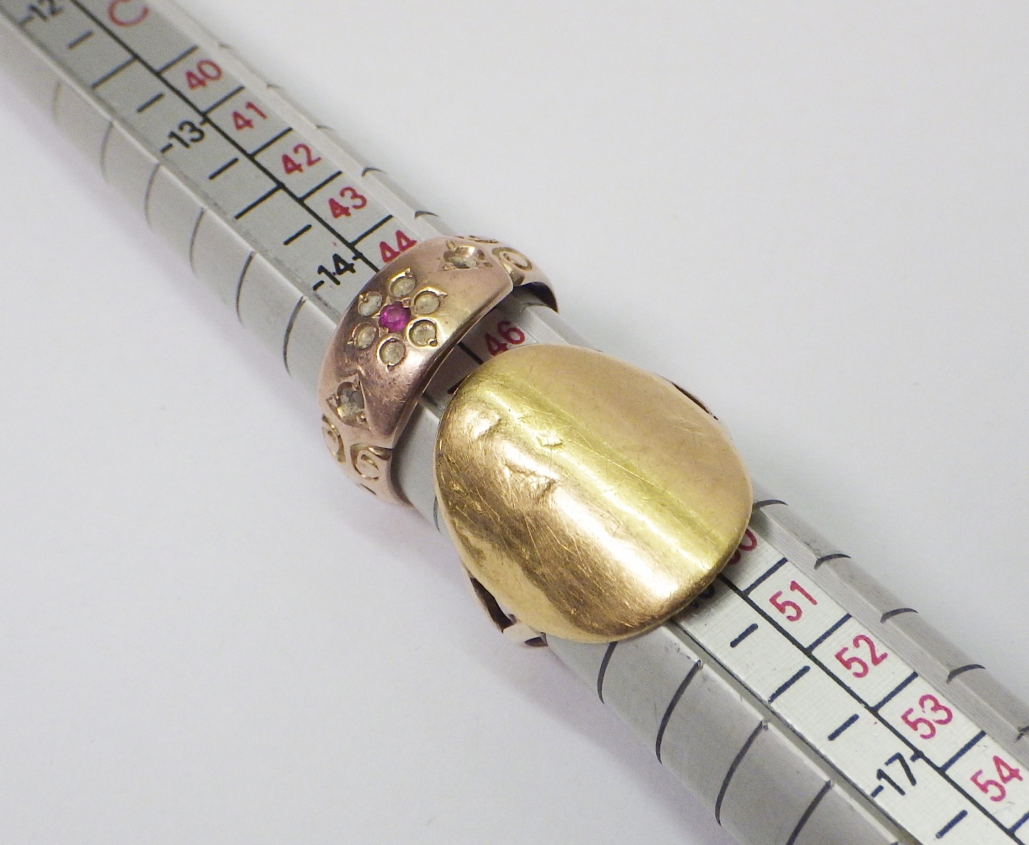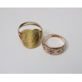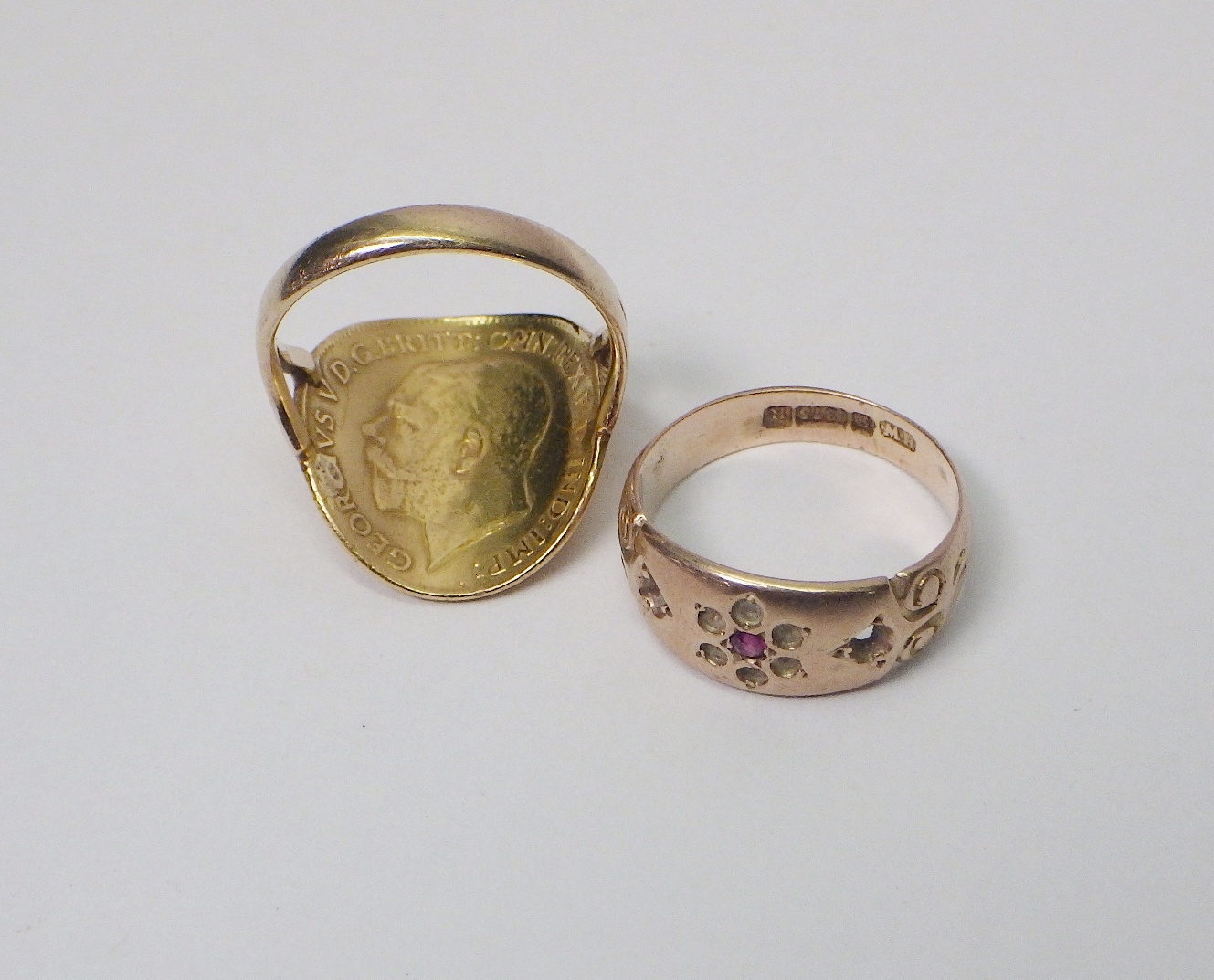 A George V half sovereign ring, heavily worn, 4.5g gross; a 9ct gold ring, a/f stones lacking, 2.5g. (2)