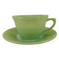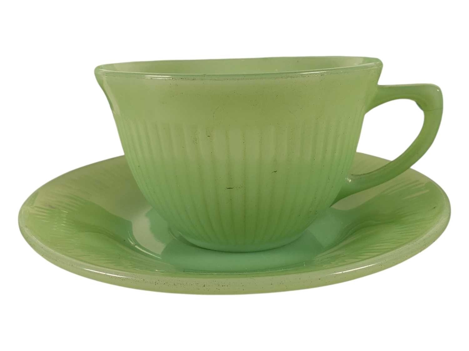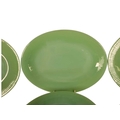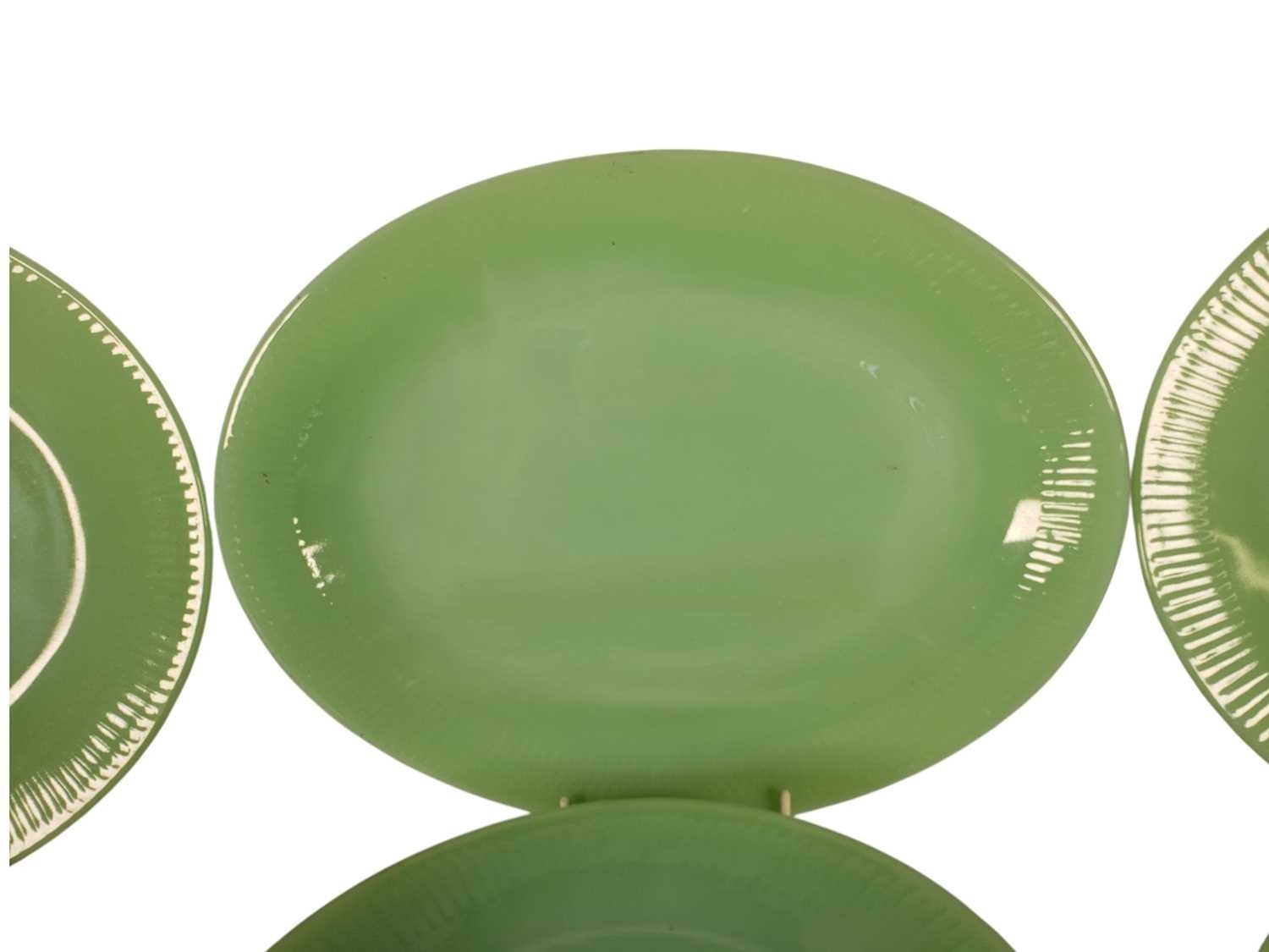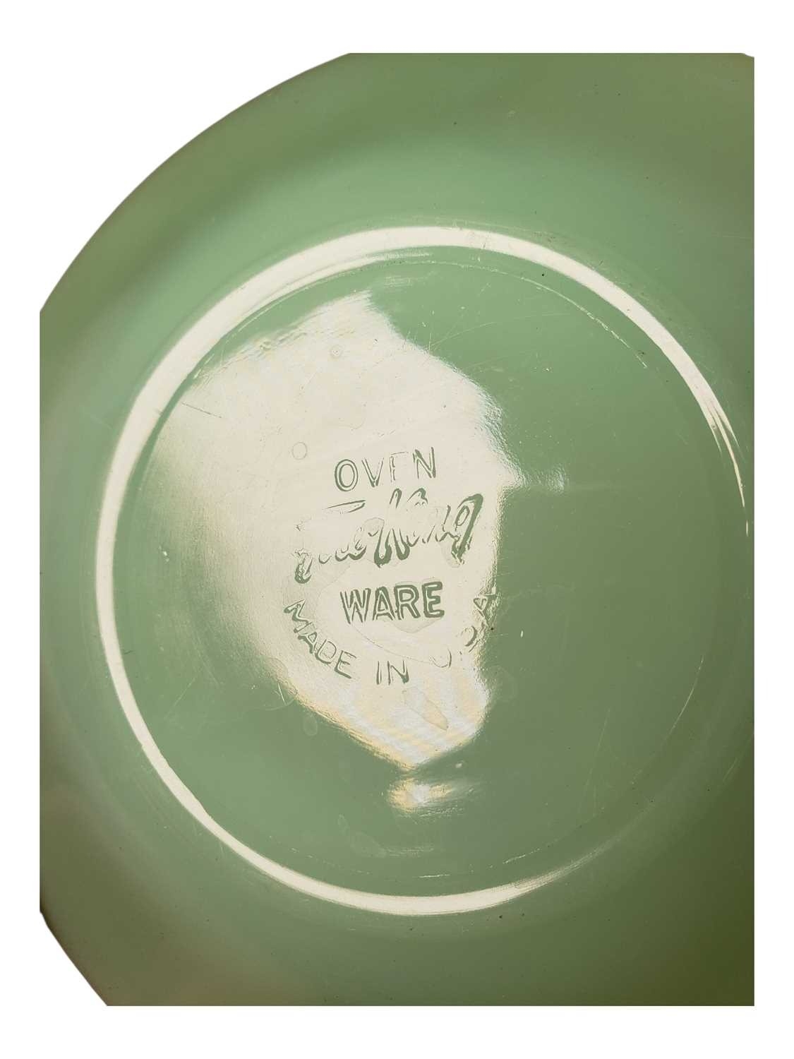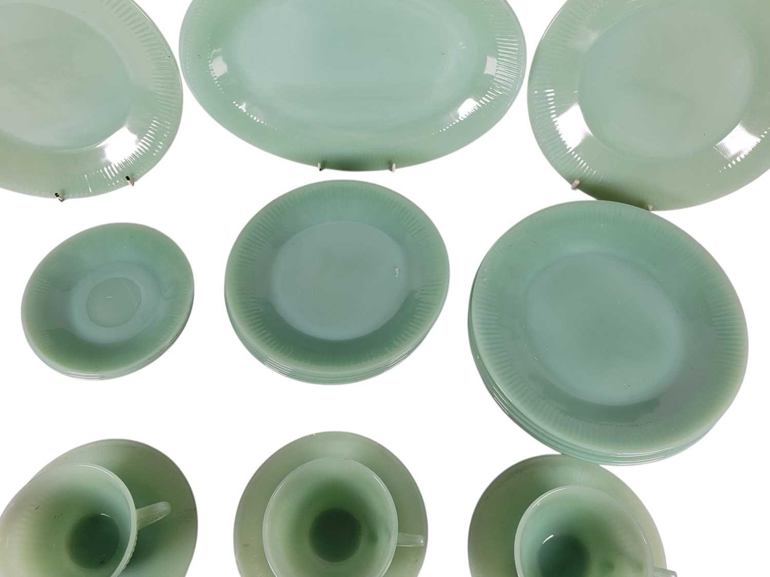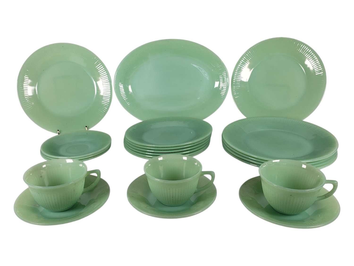 Fire King Ware, U.S.A. - A vintage mid 20th century green glass dinner service / ovenware. Including dinner plates, side plates, saucers, cups, cooking dishes and serving platter. With maker's mark to verso. Made by Anchor Hocking Glass Corporation. Approx. 30 pieces.