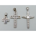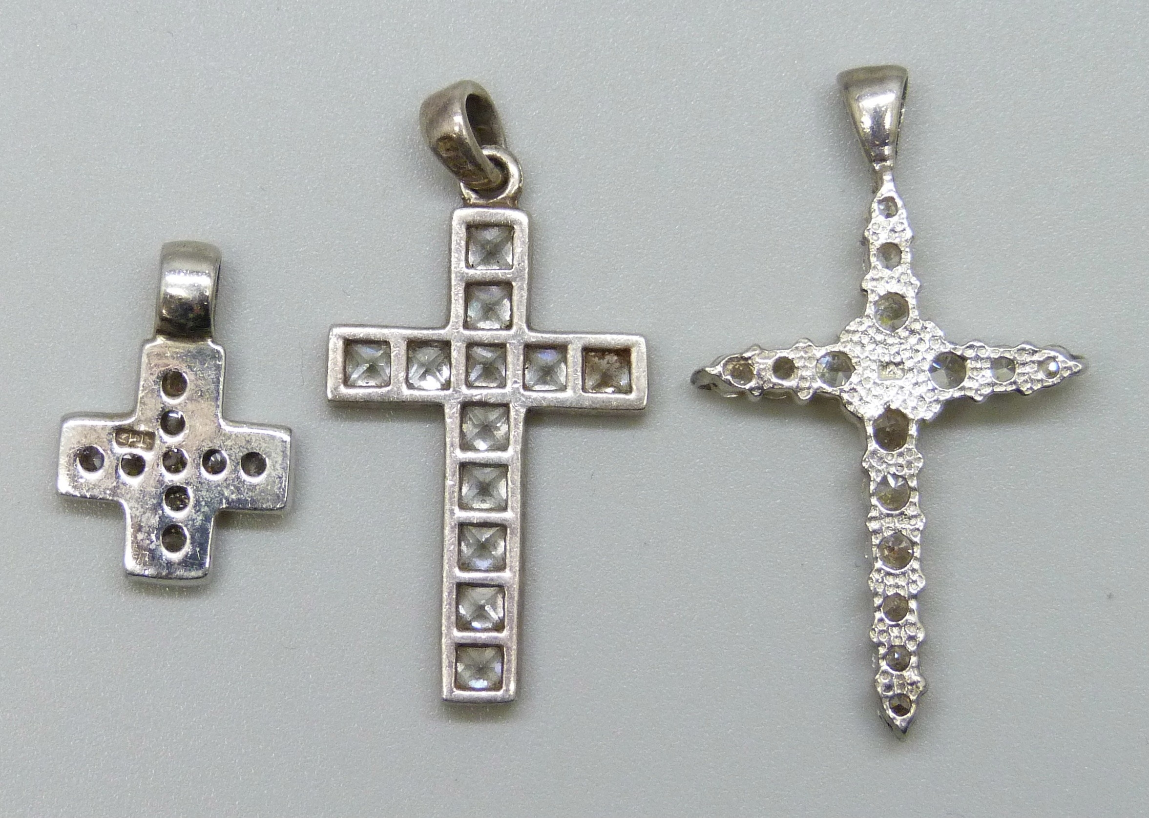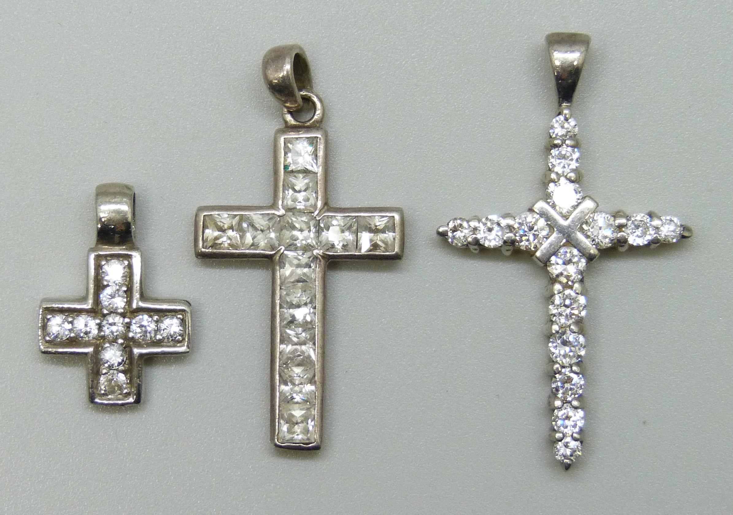 Three silver and cubic zirconia cross pendants, 8g, largest 3.4cm including bail