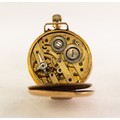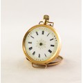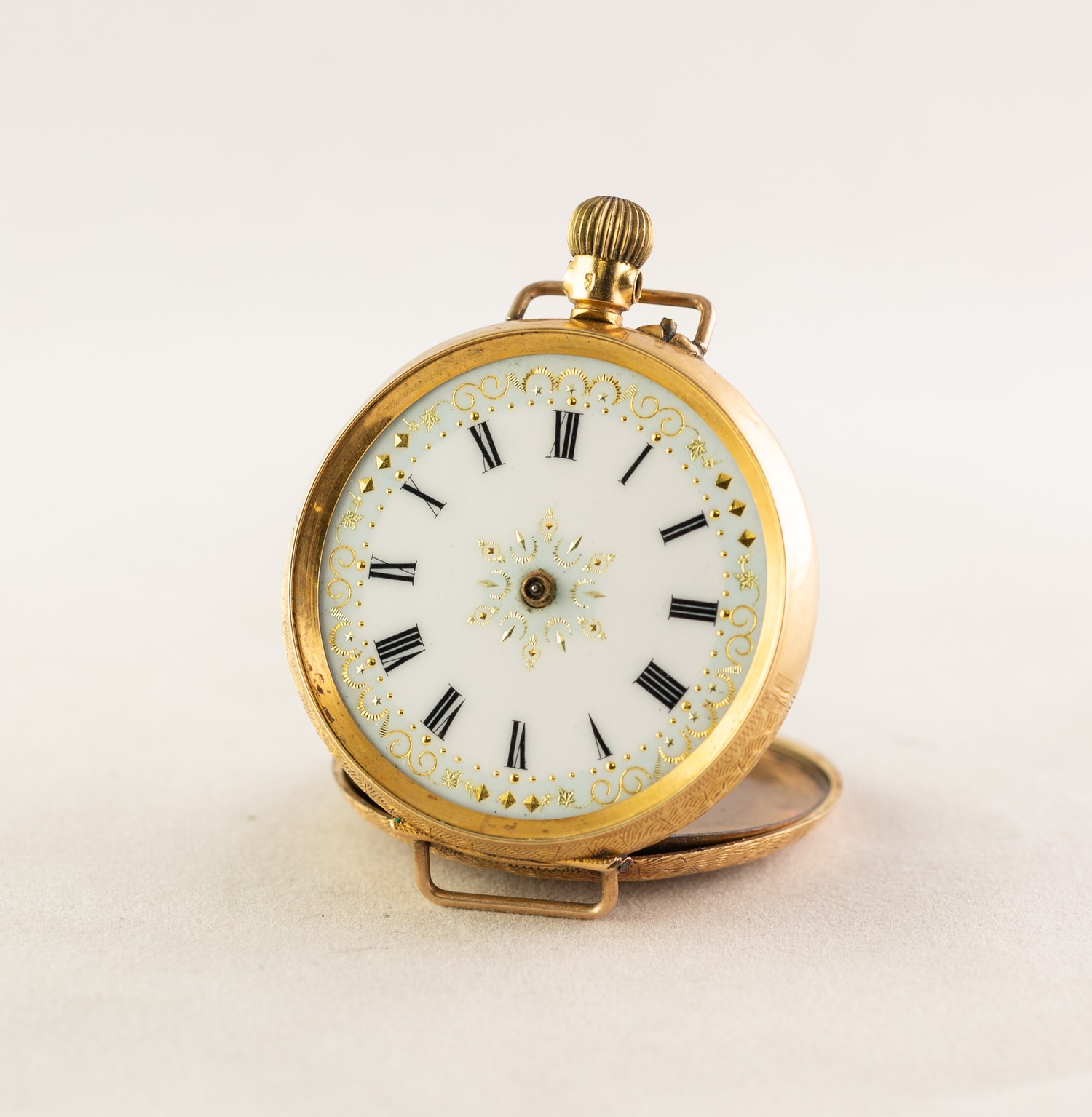 LADY'S 18k GOLD POCKET WATCH with keyless movement, white porcelain roman dial with gilt decorated dial, floral engraved case, 1 1/4in (3cm) diameter, 30.4 gms gross (circa 1900), (c/r working, lacks hands, glass and hanger, lugs added to facilitate a strap, case back has light denting