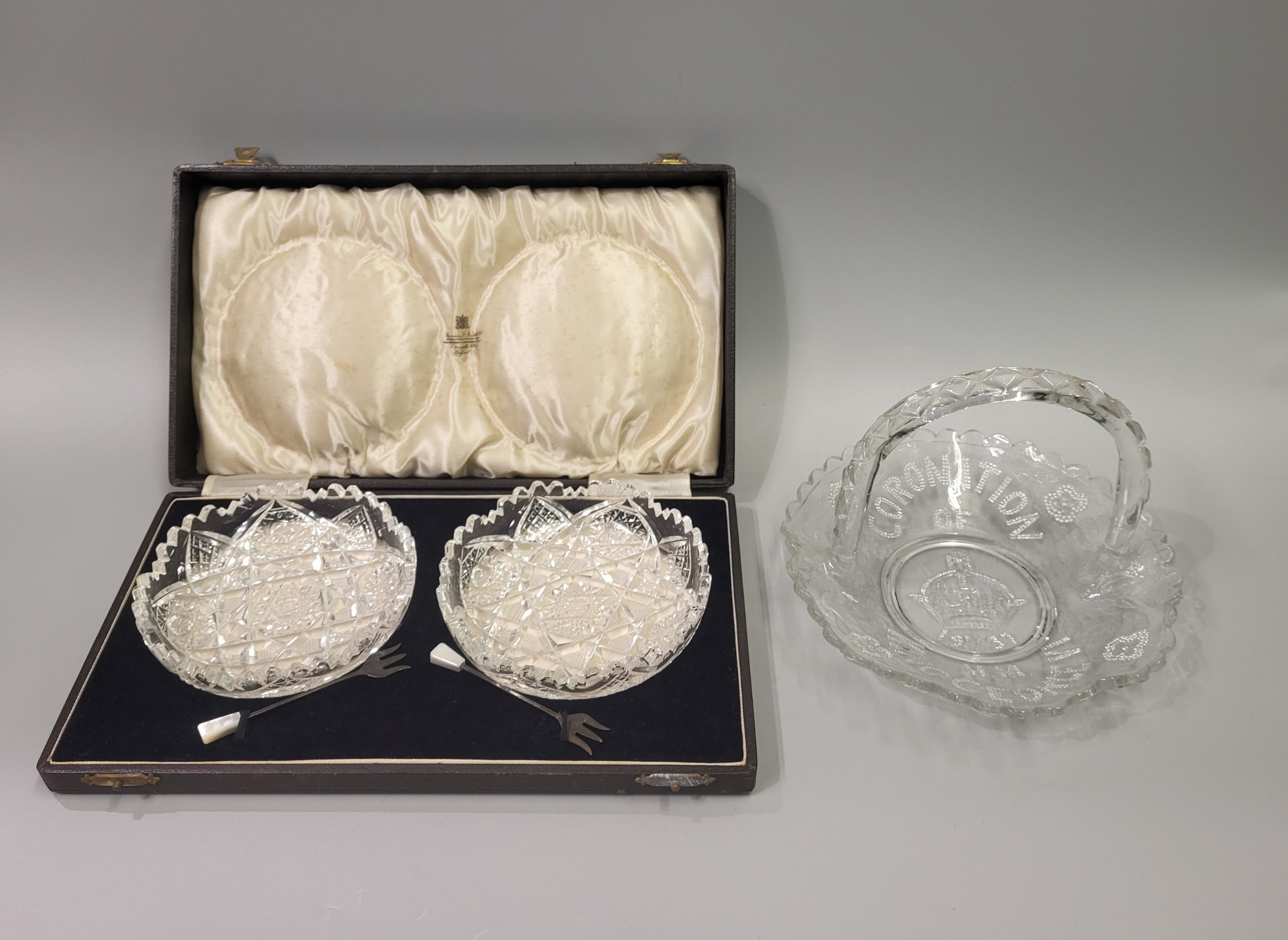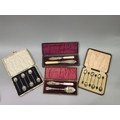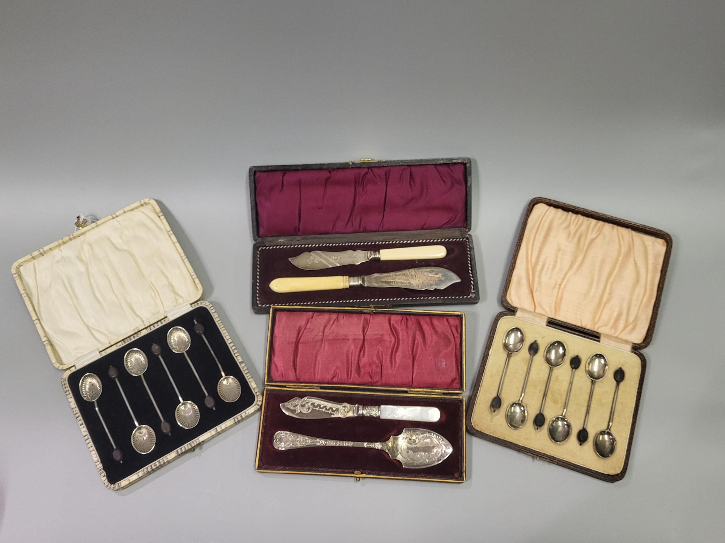 A LARGE MISCELLANEOUS COLLECTION OF ANTIQUE TABLE WARE, to include two cased sets of six coffee bean tipped sterling silver spoons, preserve spoons, mother-of-pearl handles, a pair of butter knives, carved, a cased pair of crystal olive dishes & matching olive fork, cased & retailed by Sharmin Neil, Belfast etc.