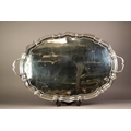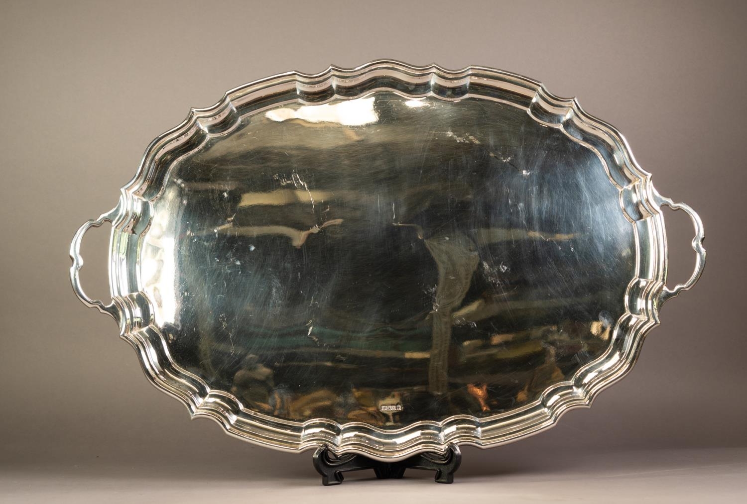 GEORGE V SILVER LARGE TWO HANDLED TEA TRAY BY CHARLES BOYTON & SON, of oval form with plain centre, moulded border and scroll end handles, 24” x 17 ¾” (61cm x 45.1cm) in between handles, Sheffield 1912, 114oz