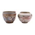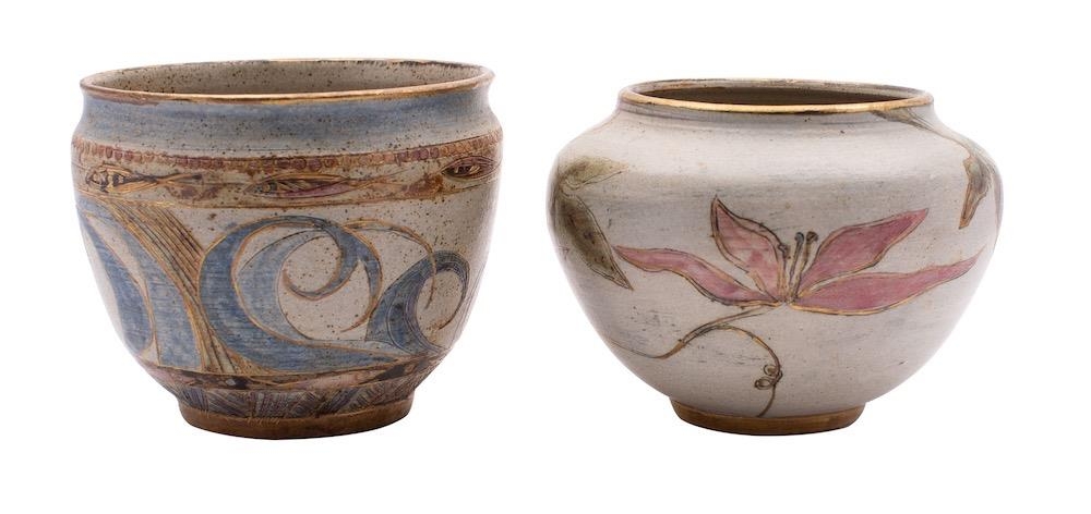 *Rachel May nee Forrester [b. 1989] two stoneware bowls one decorated with flowers and foliage the companion painted and incised with a narrow band of fish above stylised waves, painted marks to both, 18 and 16cm diameter.