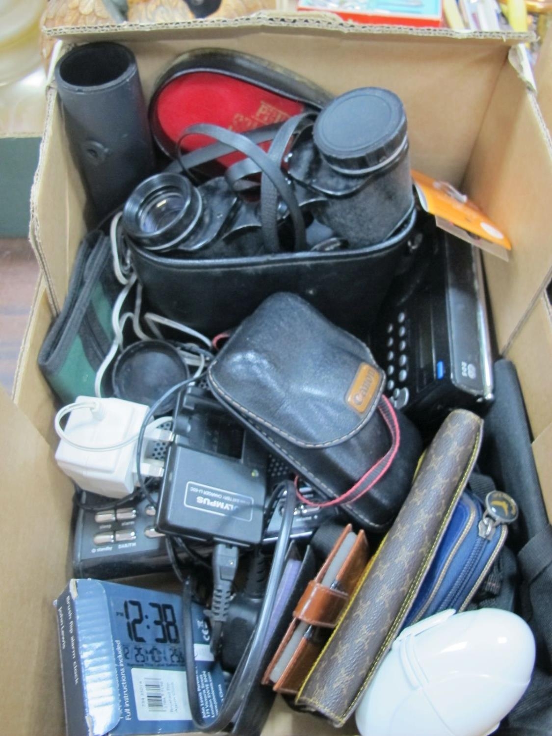 Prinzlux Binoculars, purses, radios, Sure Shot camera, etc:- One Box