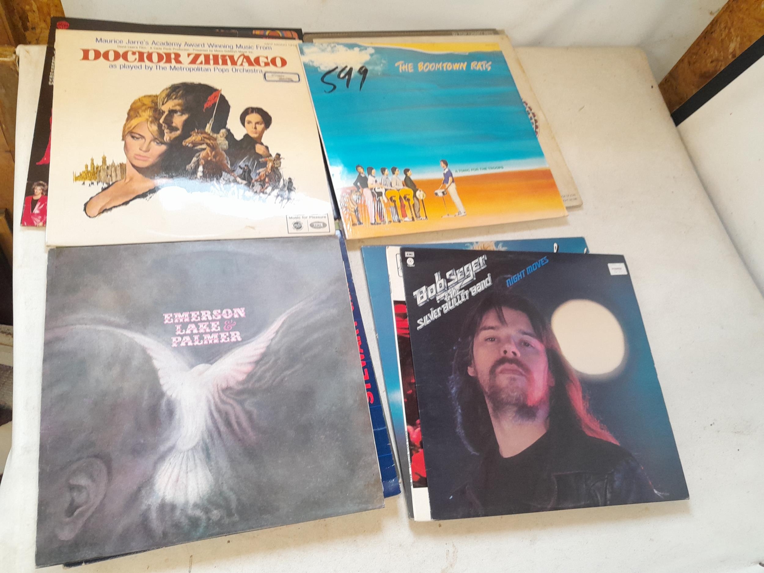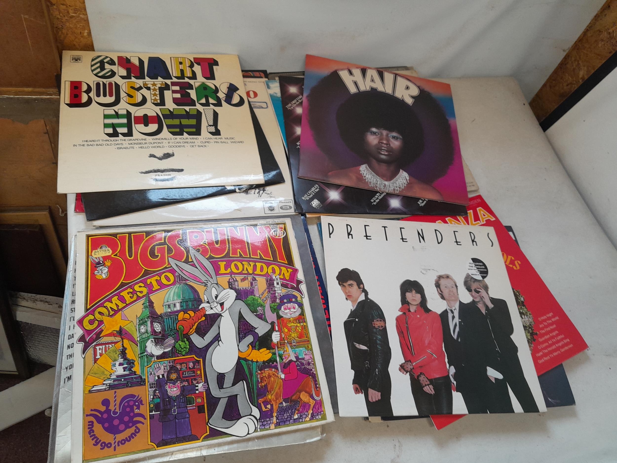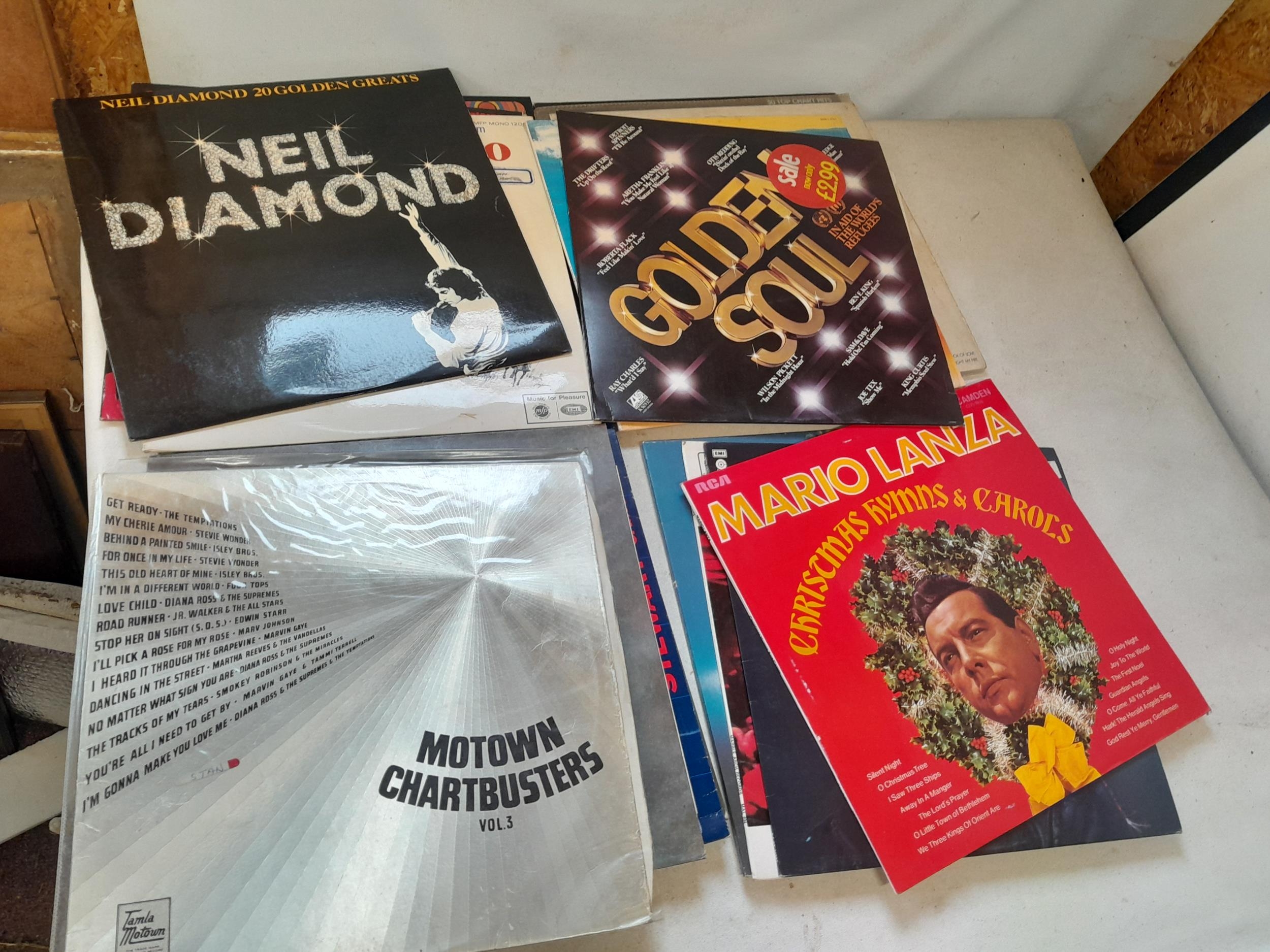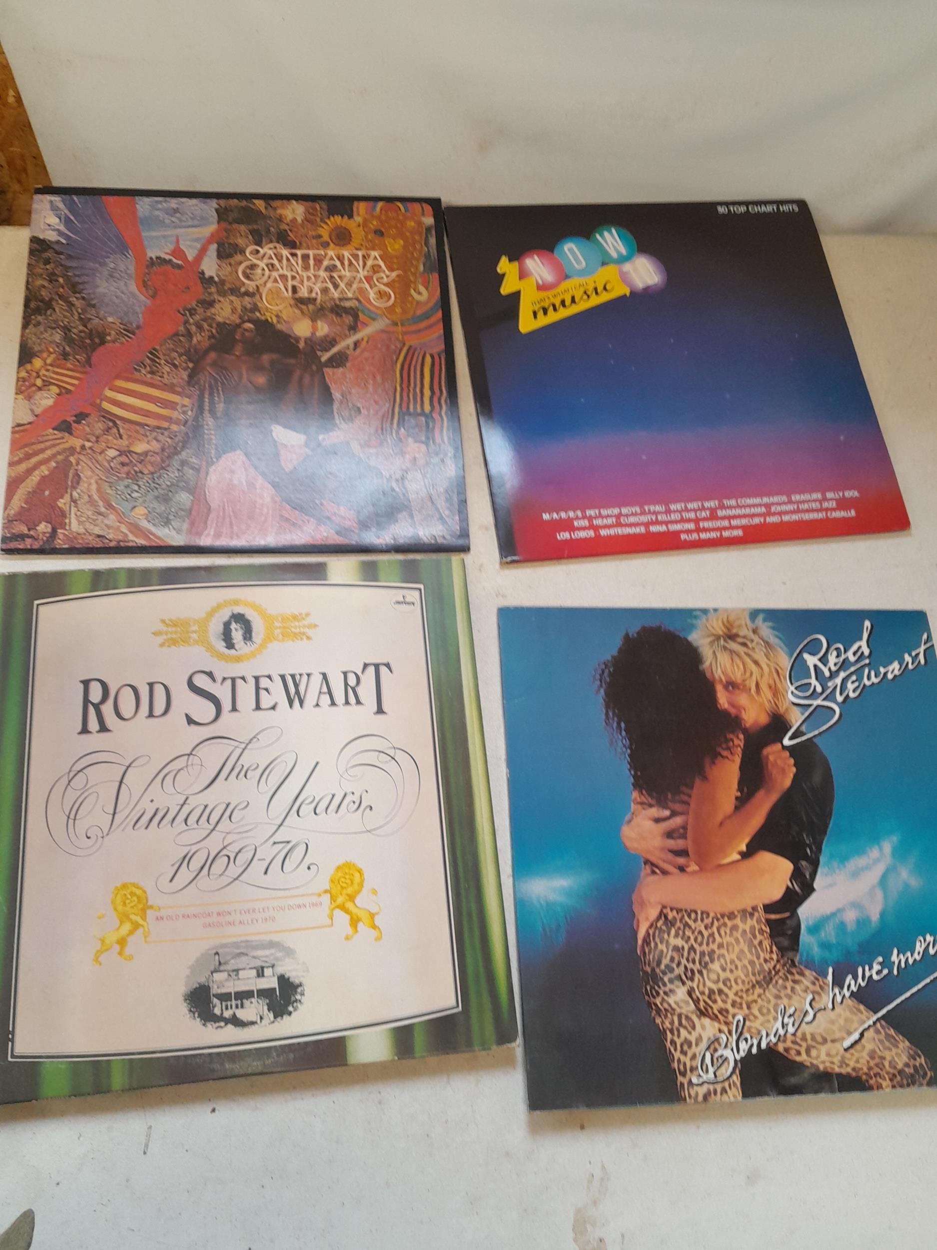 Various LP vinyl record albums : Rod Stewert, musicals, compilations, Four Tops Soul Spin Mono, Now 10 and others