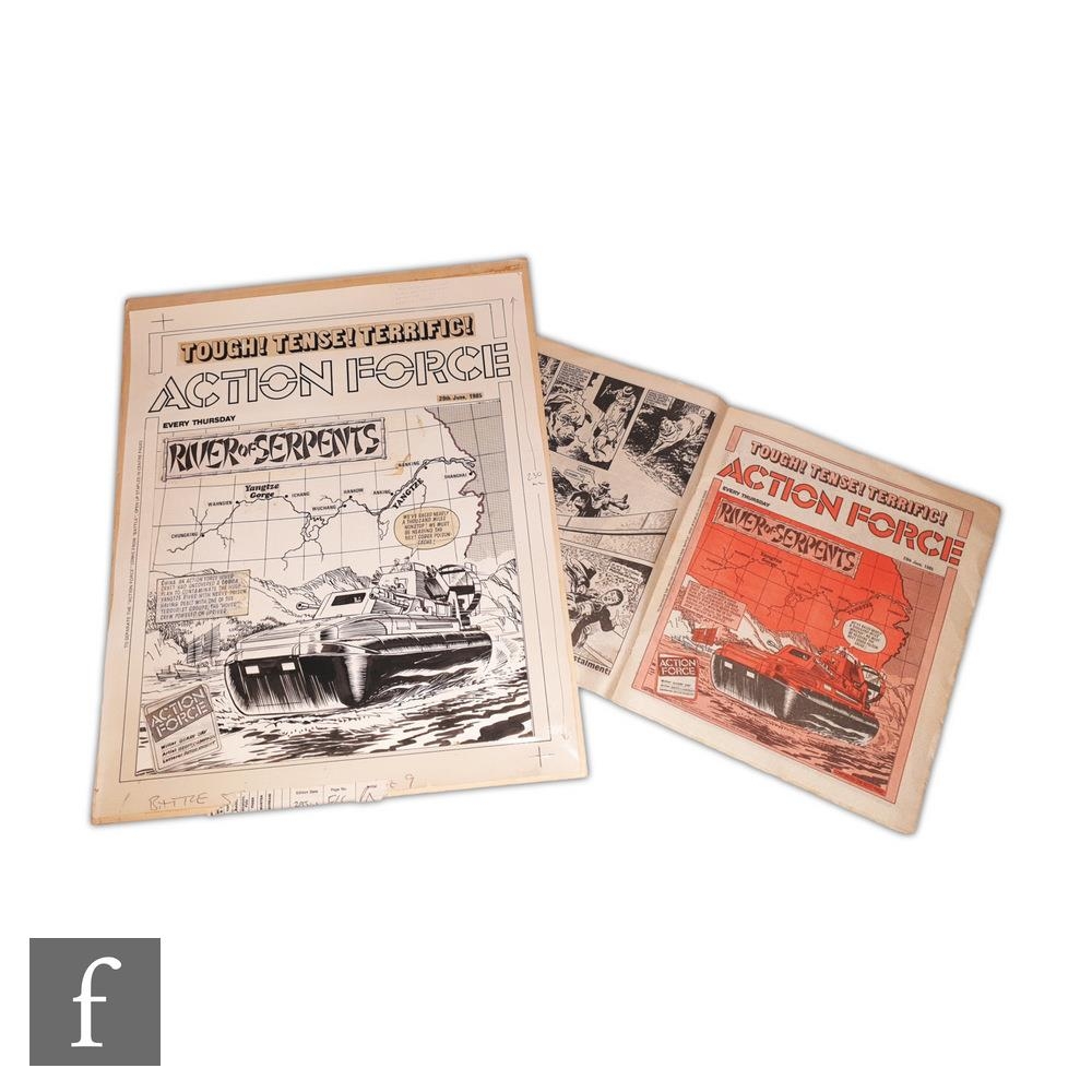 An Action Force original pen and ink drawing by Geoff Campion used for the cover of the Action Force supplement in Battle Weekly #528 22nd June 1985, 47.5 x 38.5cm, together with a copy of the comic.