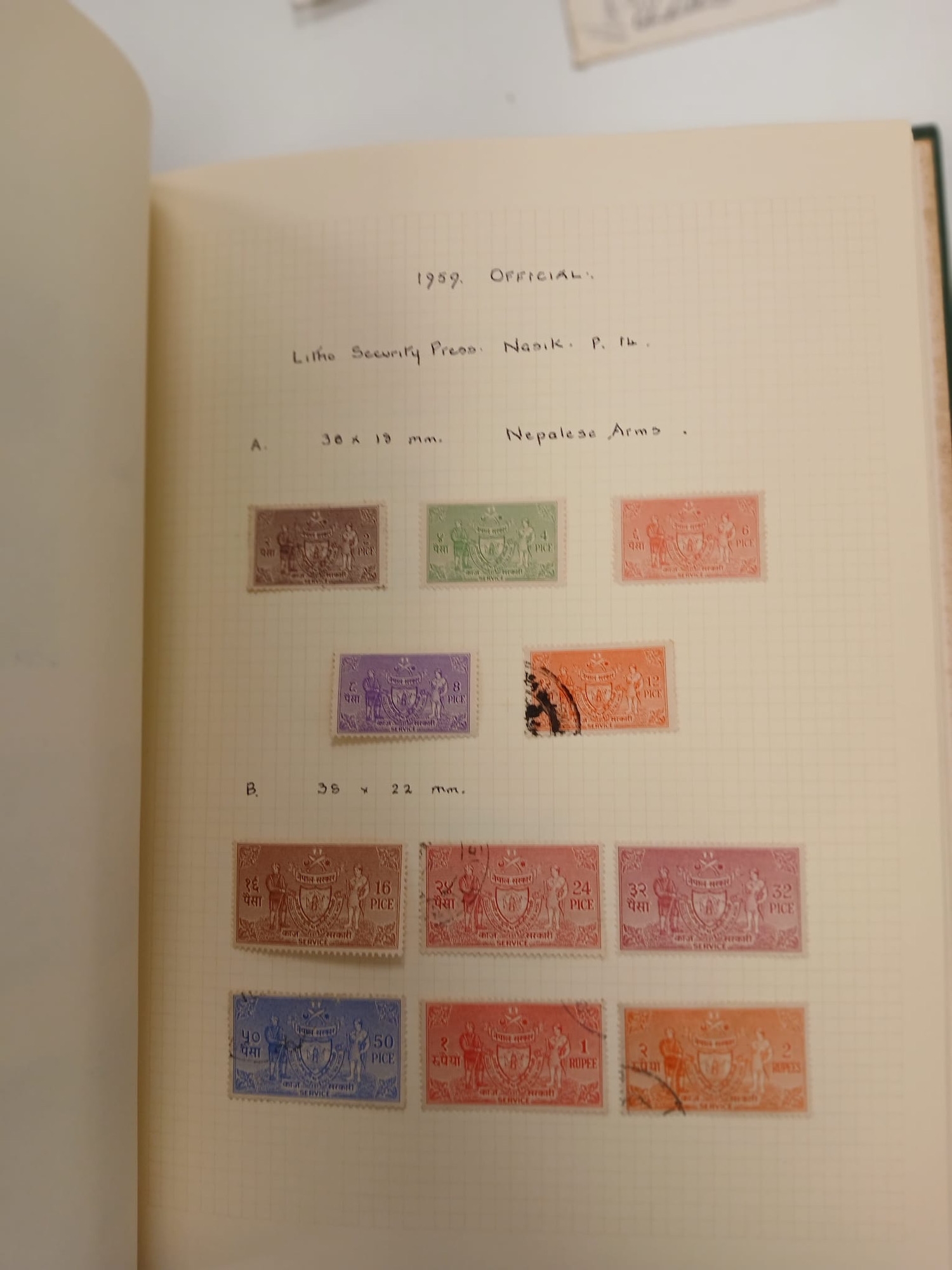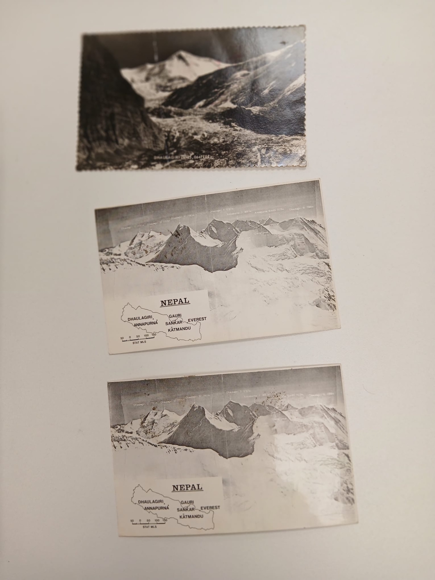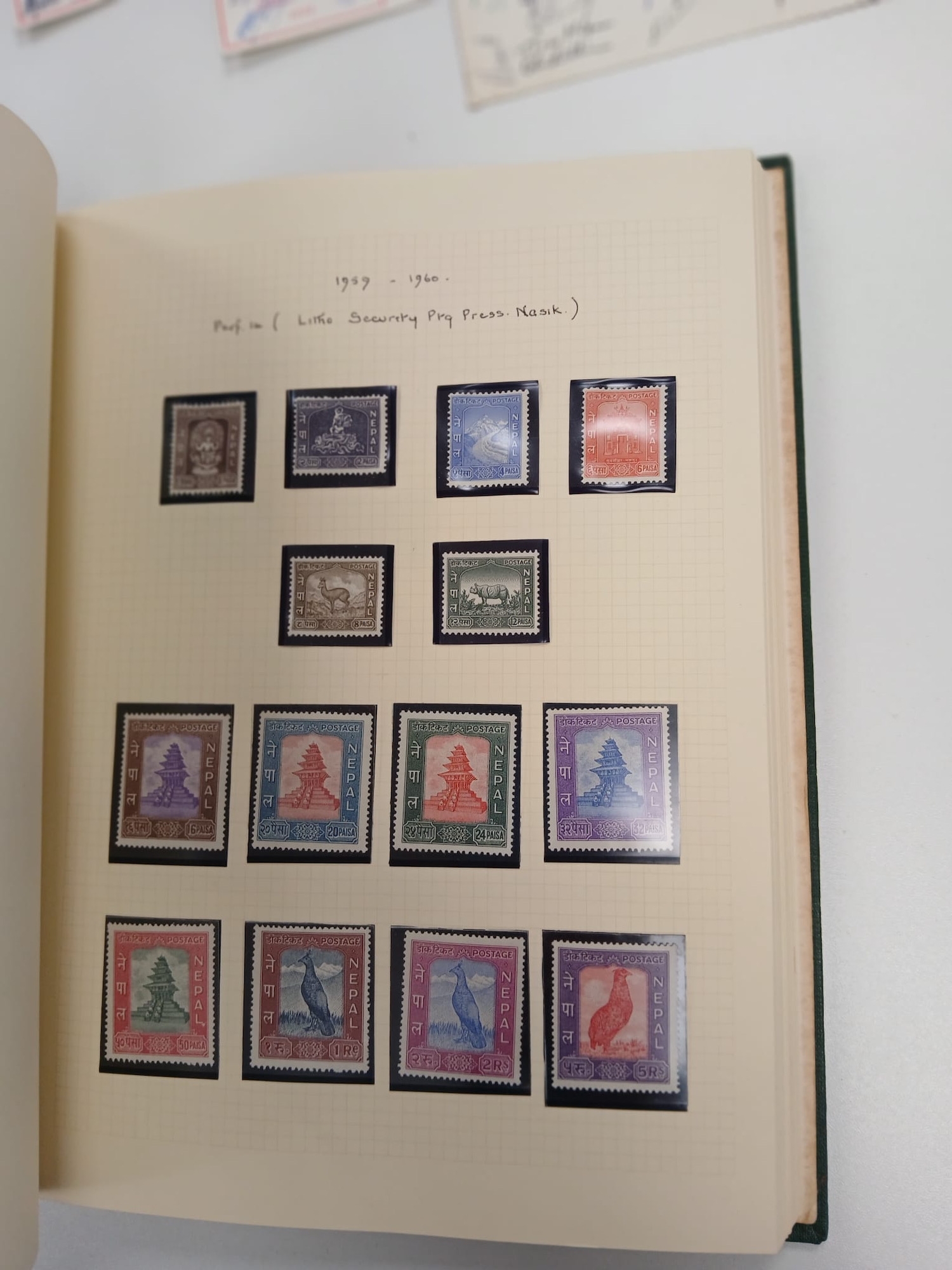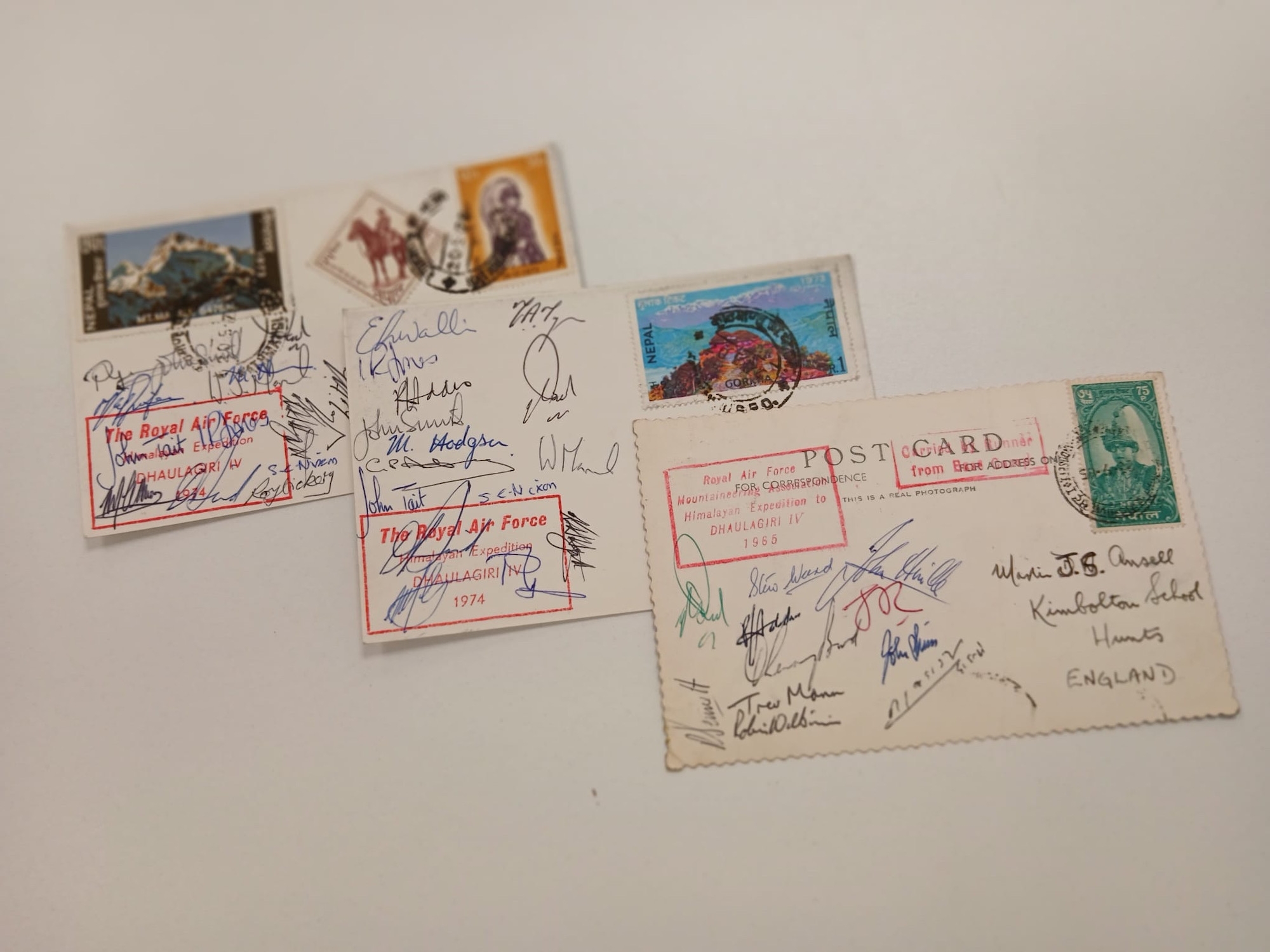 Nepal and RAF. A collection of stamps from Nepal written up in green Senator Medium album, including 1959 set MNH, plus a group of three Royal Air Force Dhaulagiri Expedition postcards, with multiple signatures, comprising 1965 (the postcard is creased), and 2 x 1974.