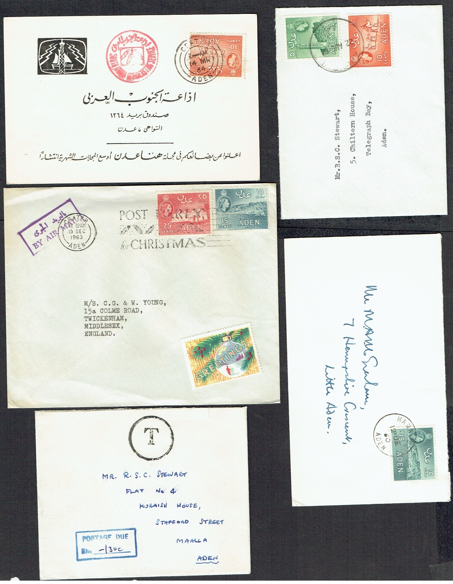 ADEN - Group of covers from GVI/QEII includes nice multi franked covers, noted 1954 underpaid local cvr, 1960 Crater airletter, 1963 Aden Xmas greetings label on Xmas cvr, 1964 South Arabia Broadcasting Service printed card, 1964 ZINJIBAR, 1964 30c P.Due, 1960 HARBOUR, 1967 Forces Mail FPO 999 with Esperanto sticker, 1959 PERIM, 1955 QEII multi franked 8 vals to 1s (folded), etc. Very mixed but useful group of 14 covers.